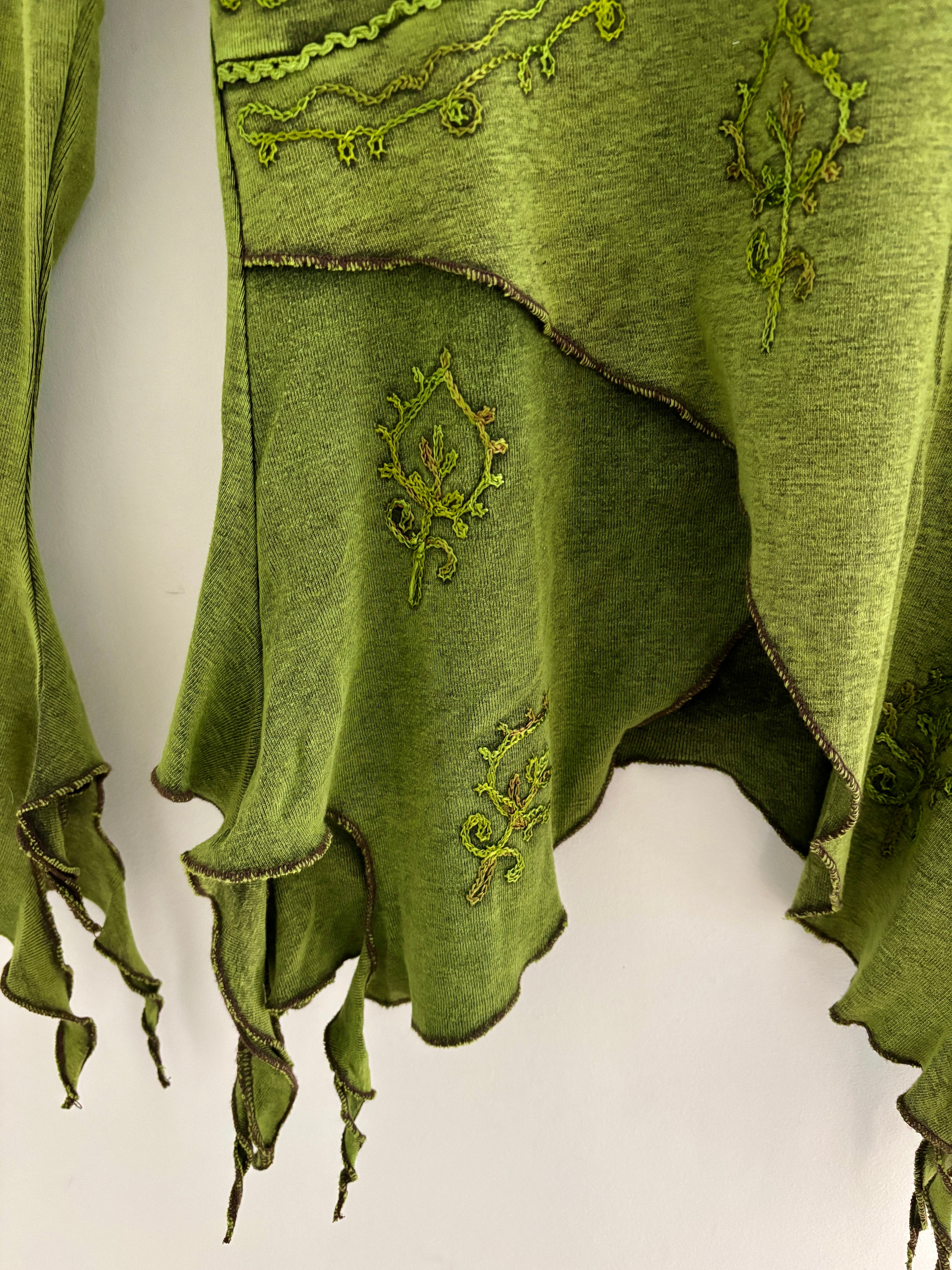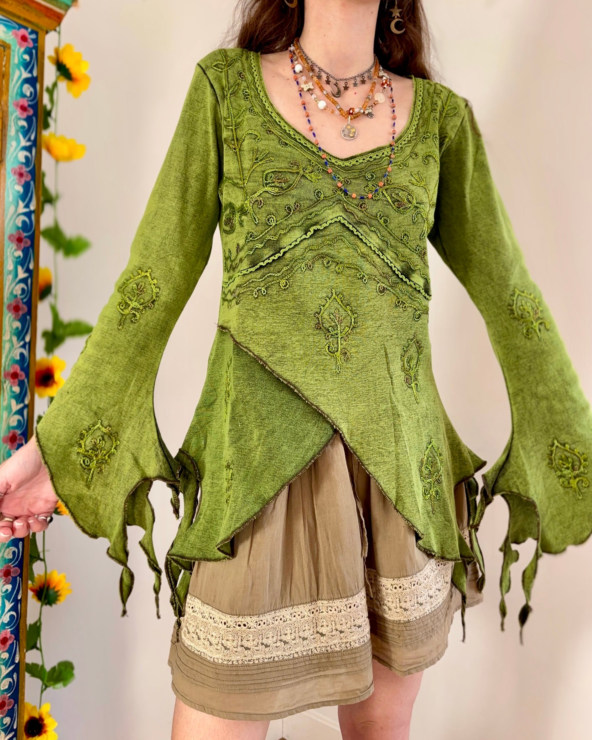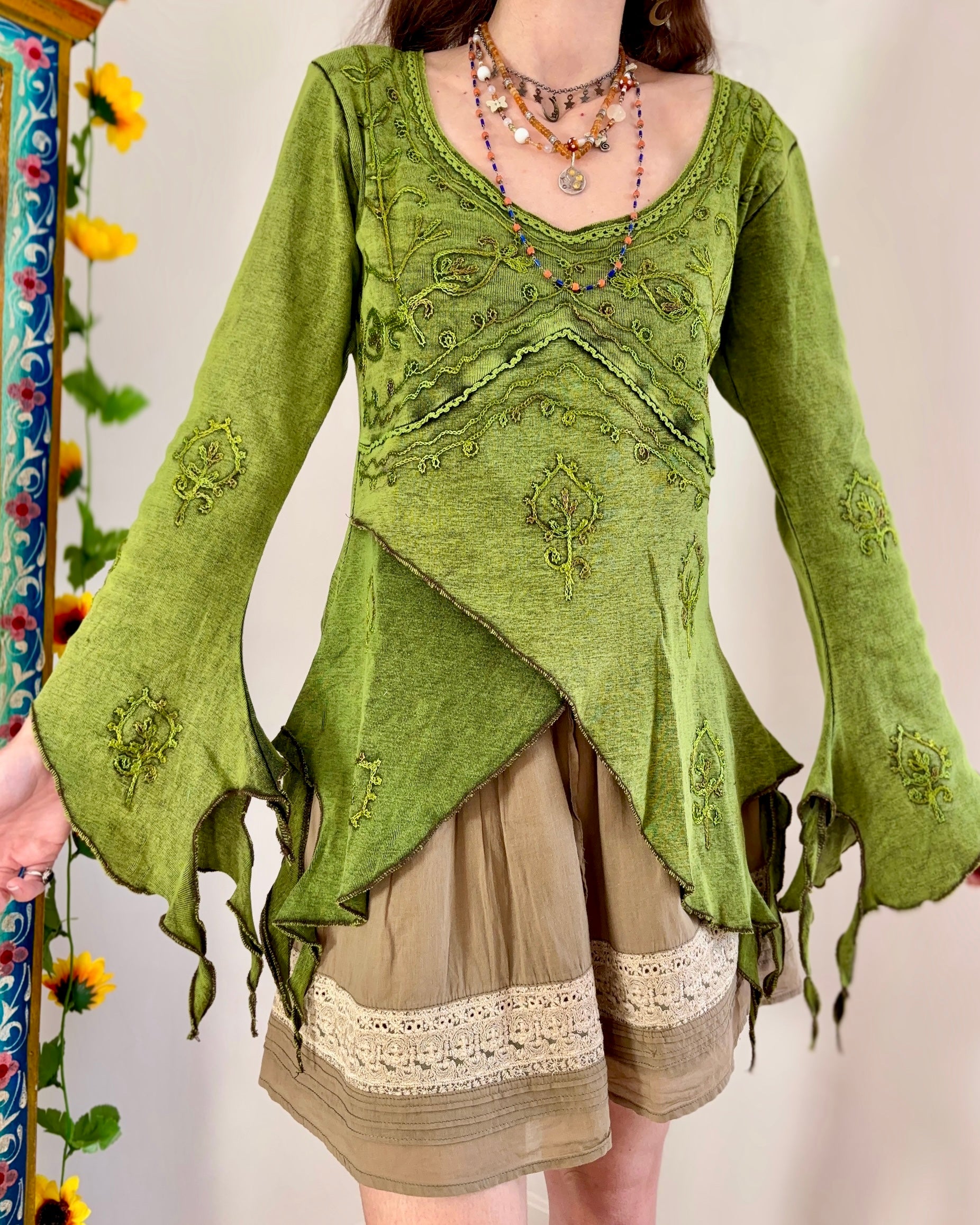 These beautiful long-sleeve tops are made from green fabric, featuring embroidery and pointed sleeves to give a whimsical fairy look.