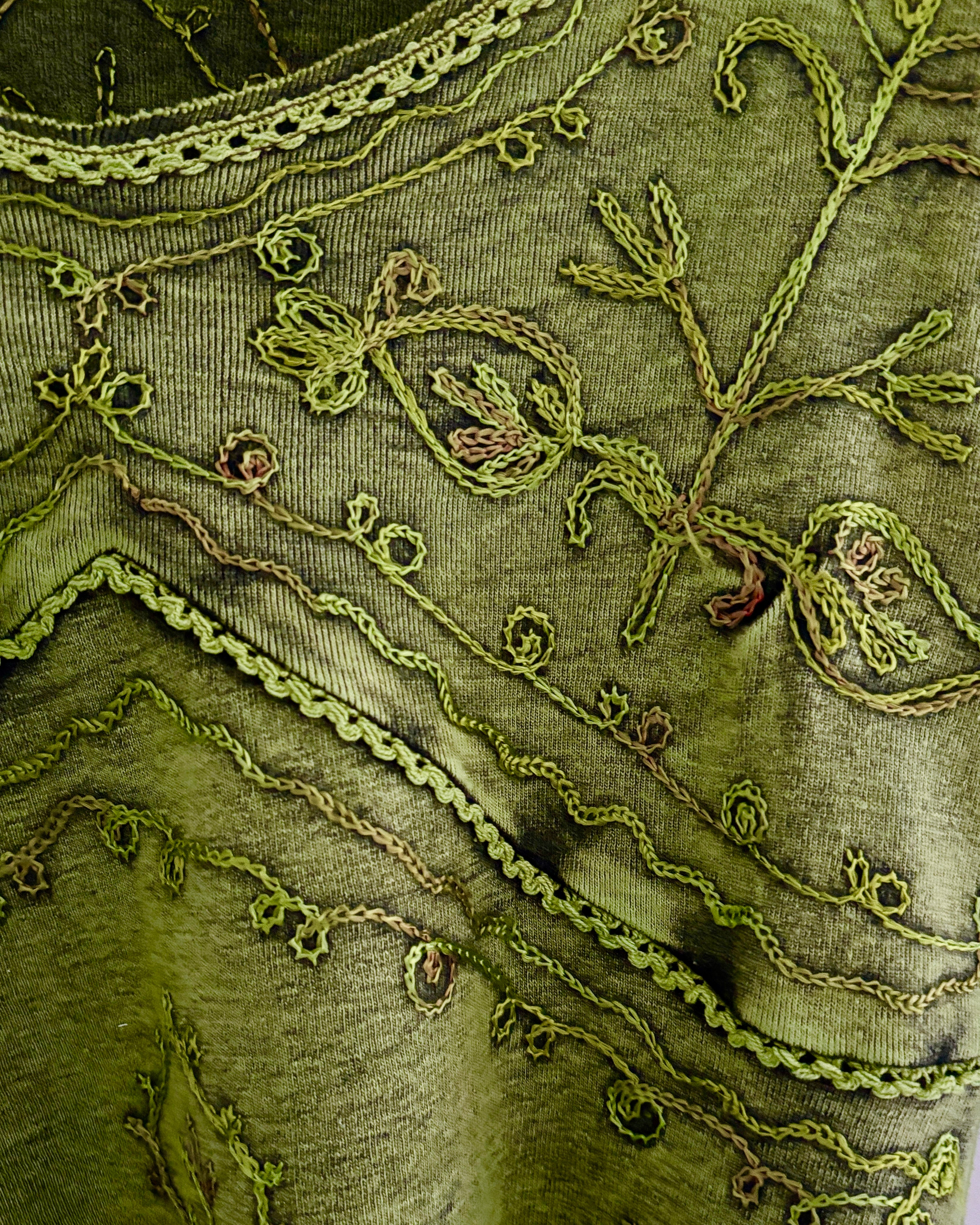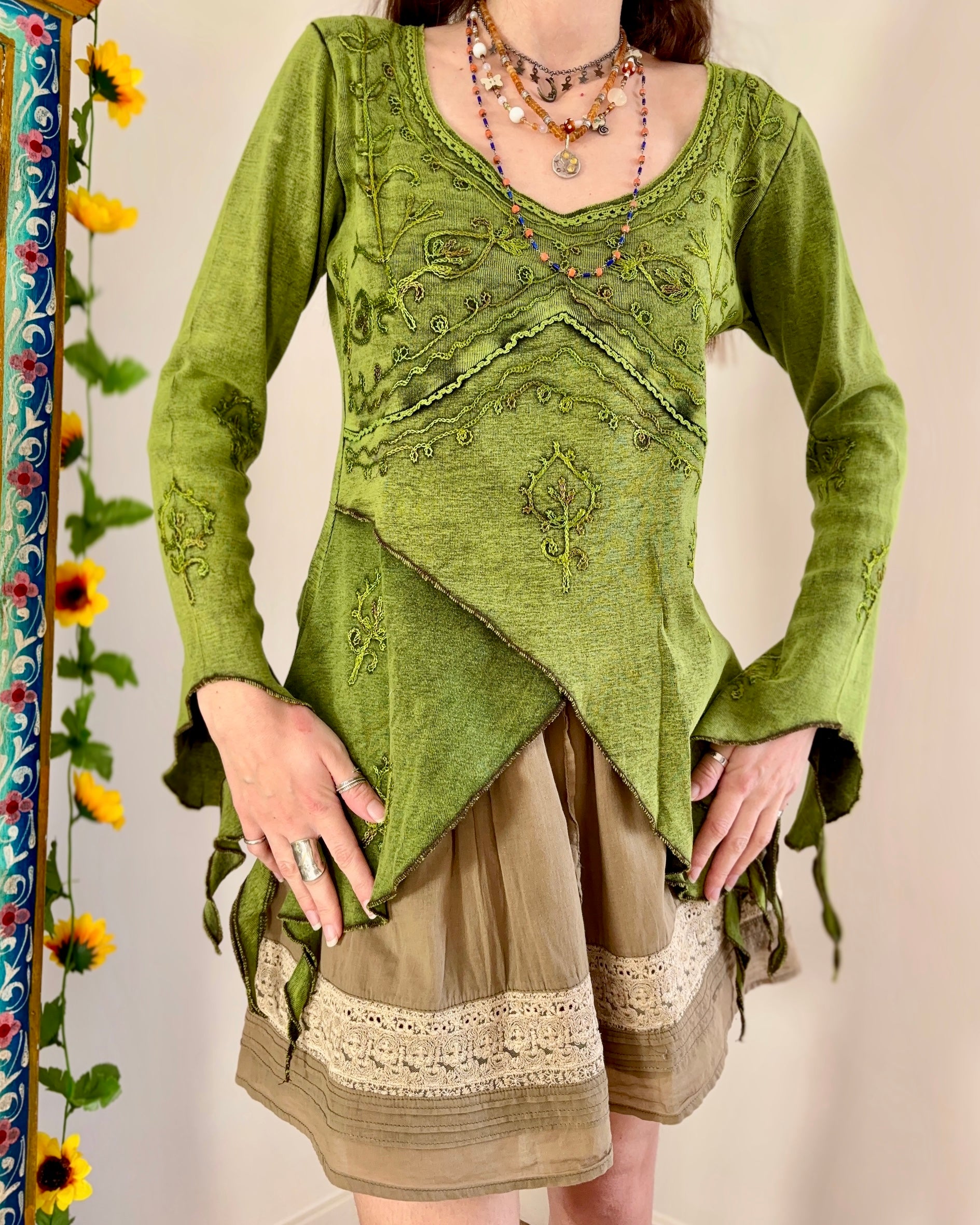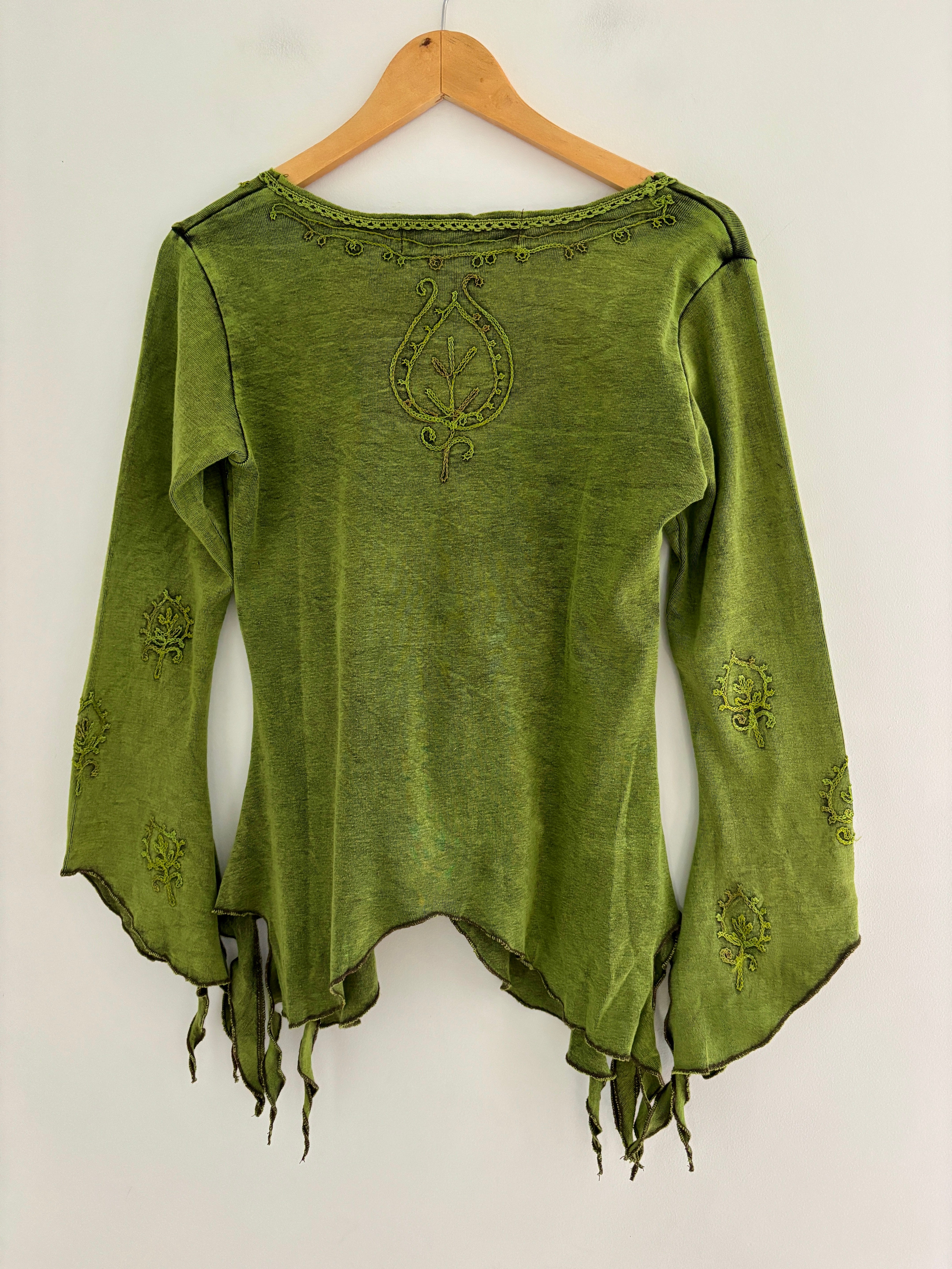 These beautiful long-sleeve tops are made from green fabric, featuring embroidery and pointed sleeves to give a whimsical fairy look.