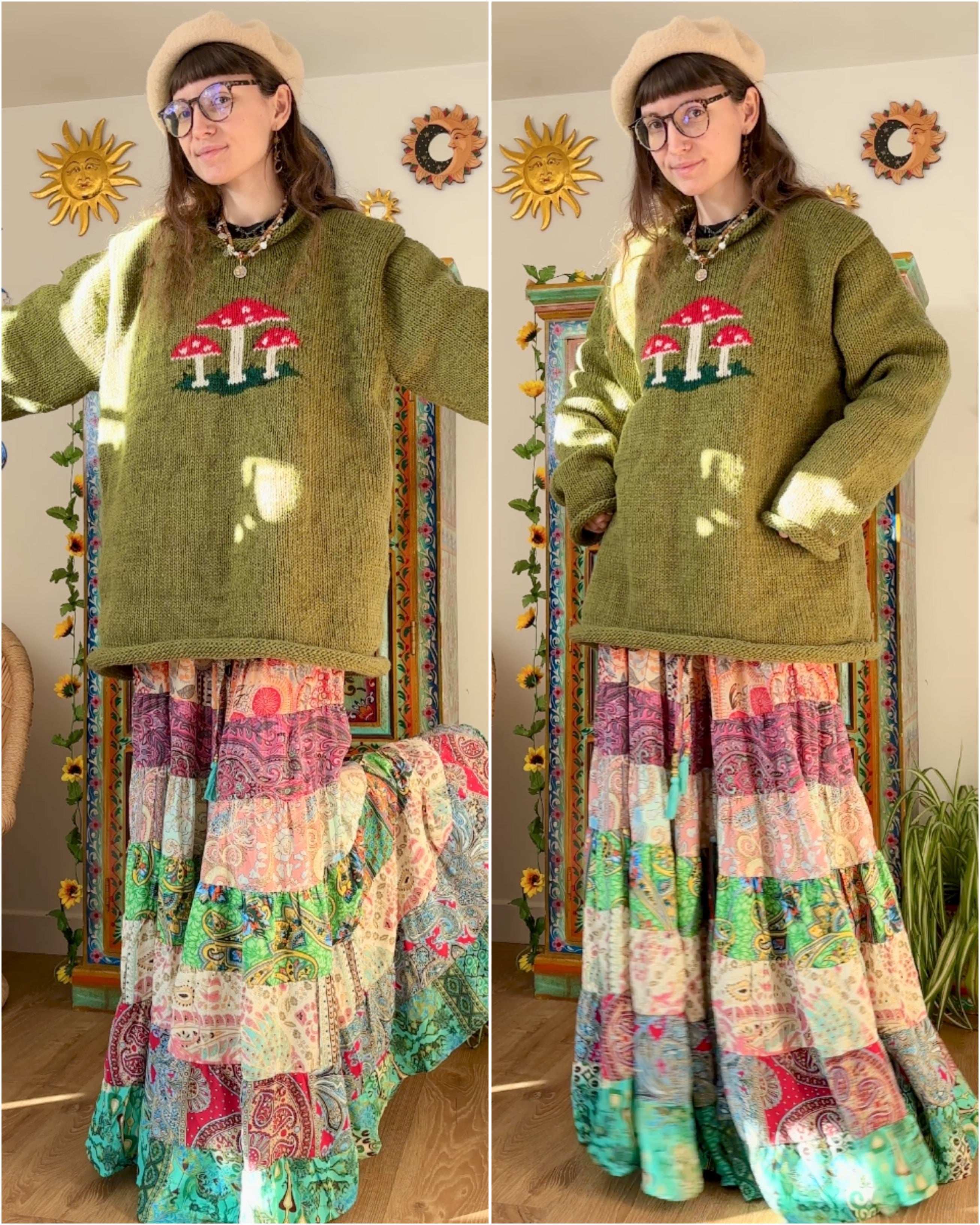 This magical mushroom jumper is hand-knitted by talented artisans Nepal. It is made from 100% wool.