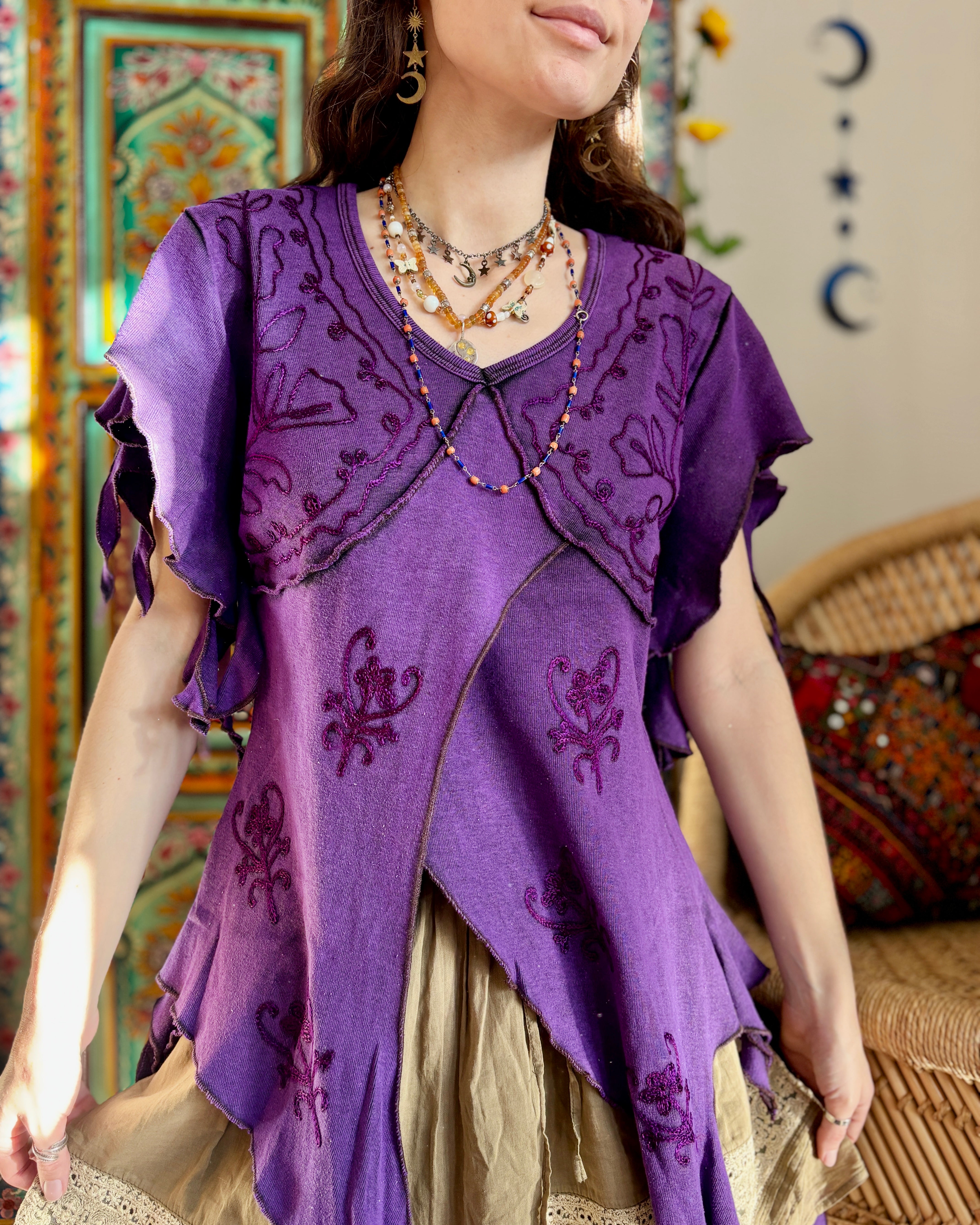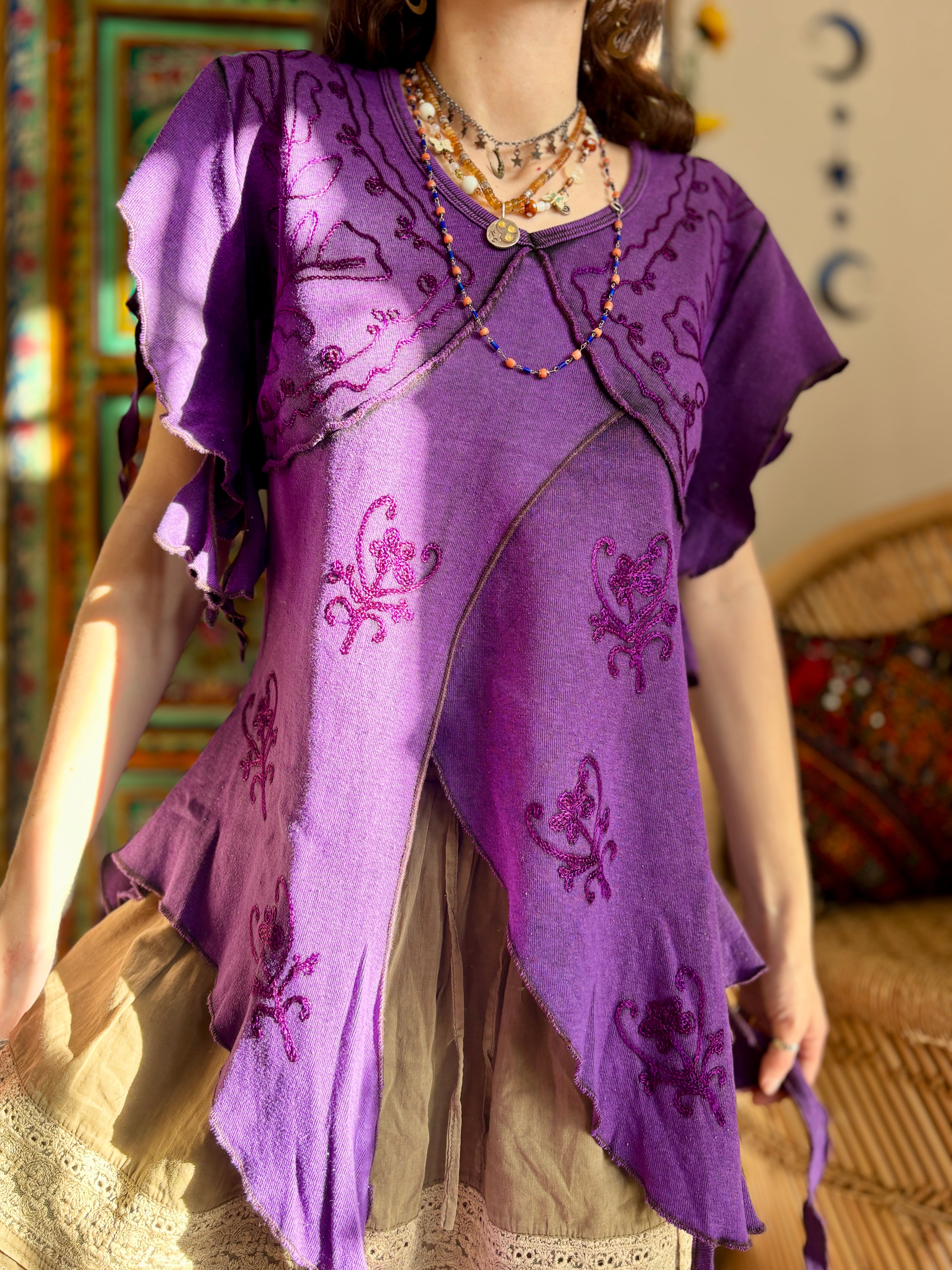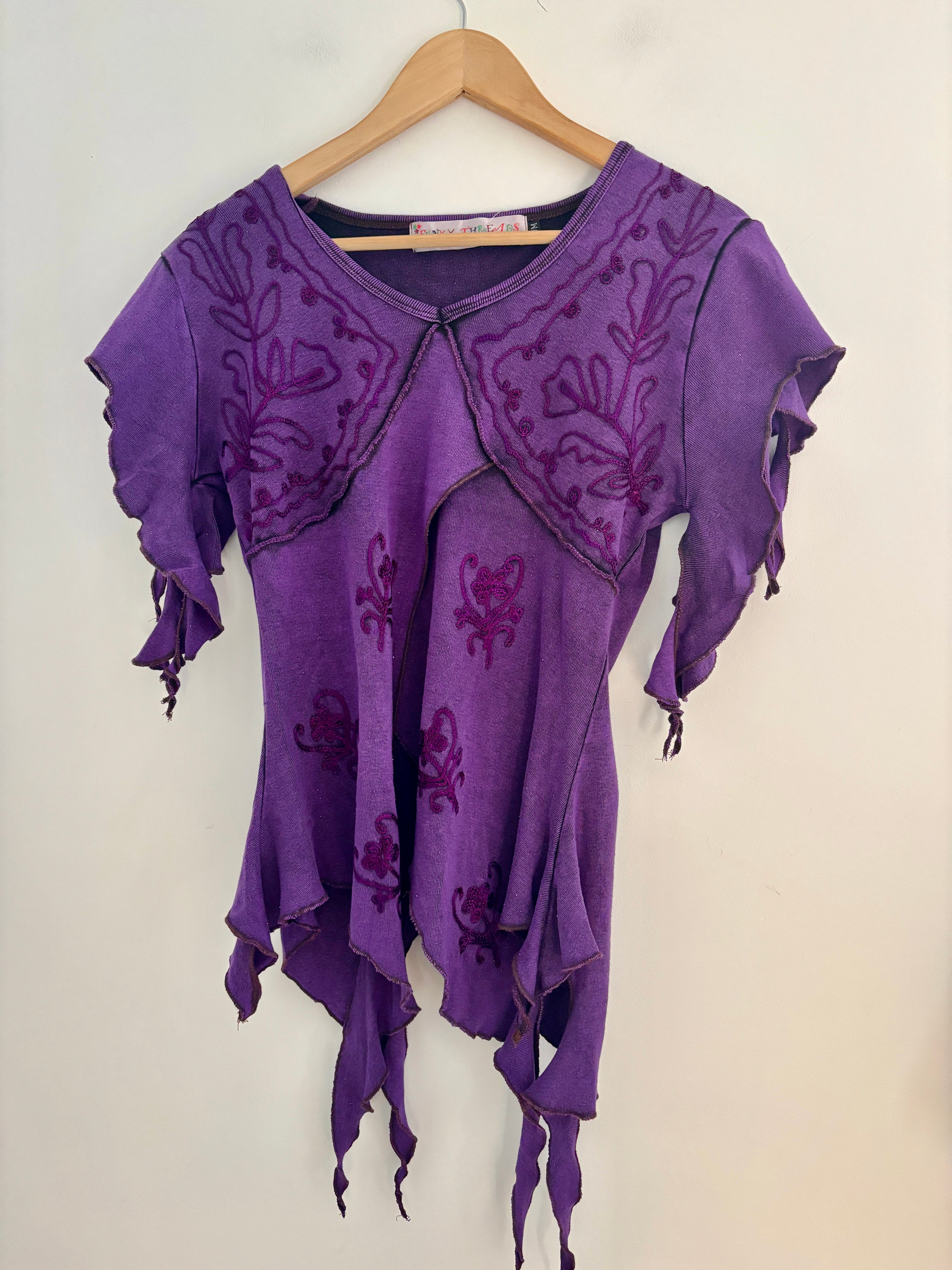 These beautiful long-sleeve tops are made from purple fabric, featuring embroidery and pointed sleeves to give a whimsical fairy look.