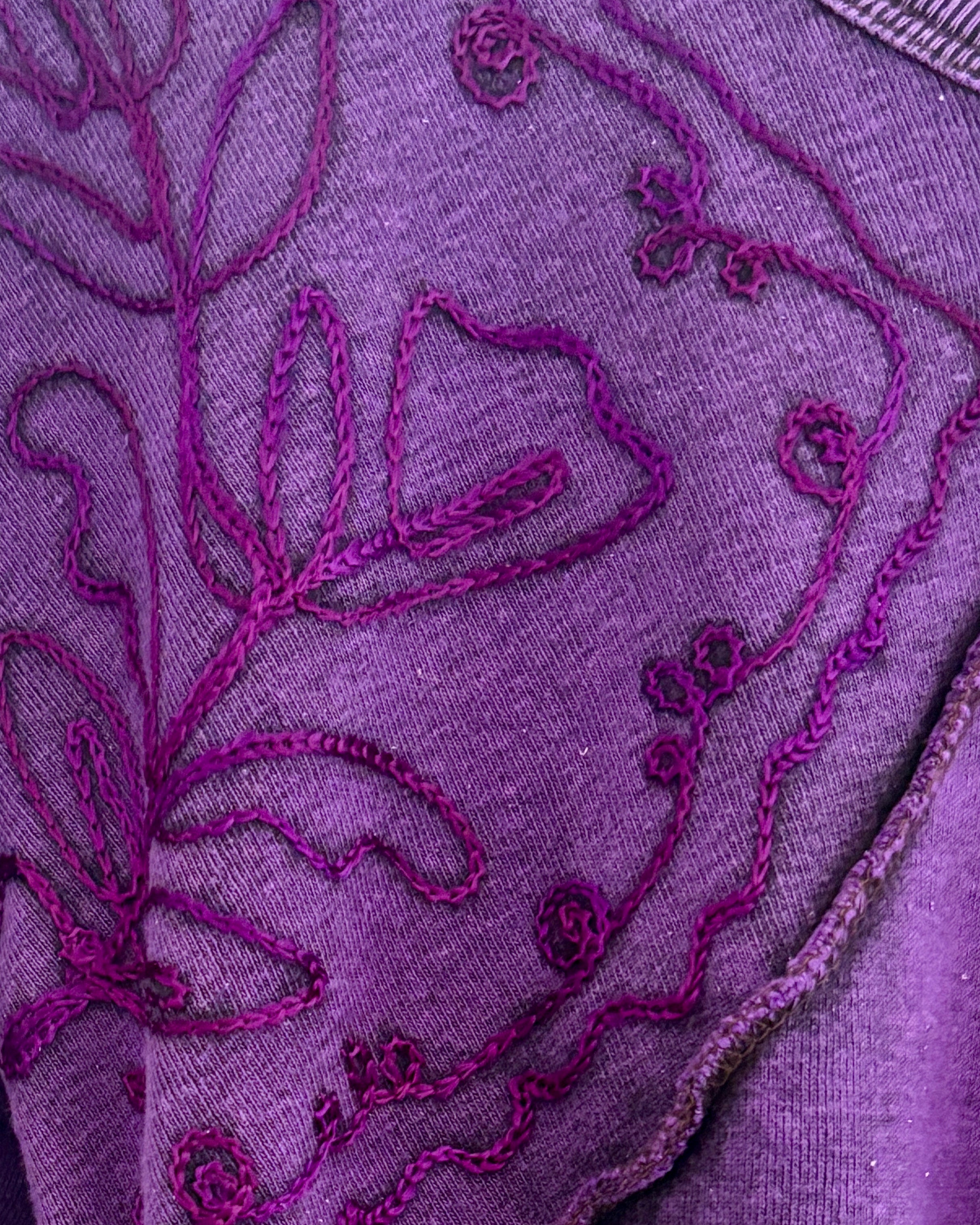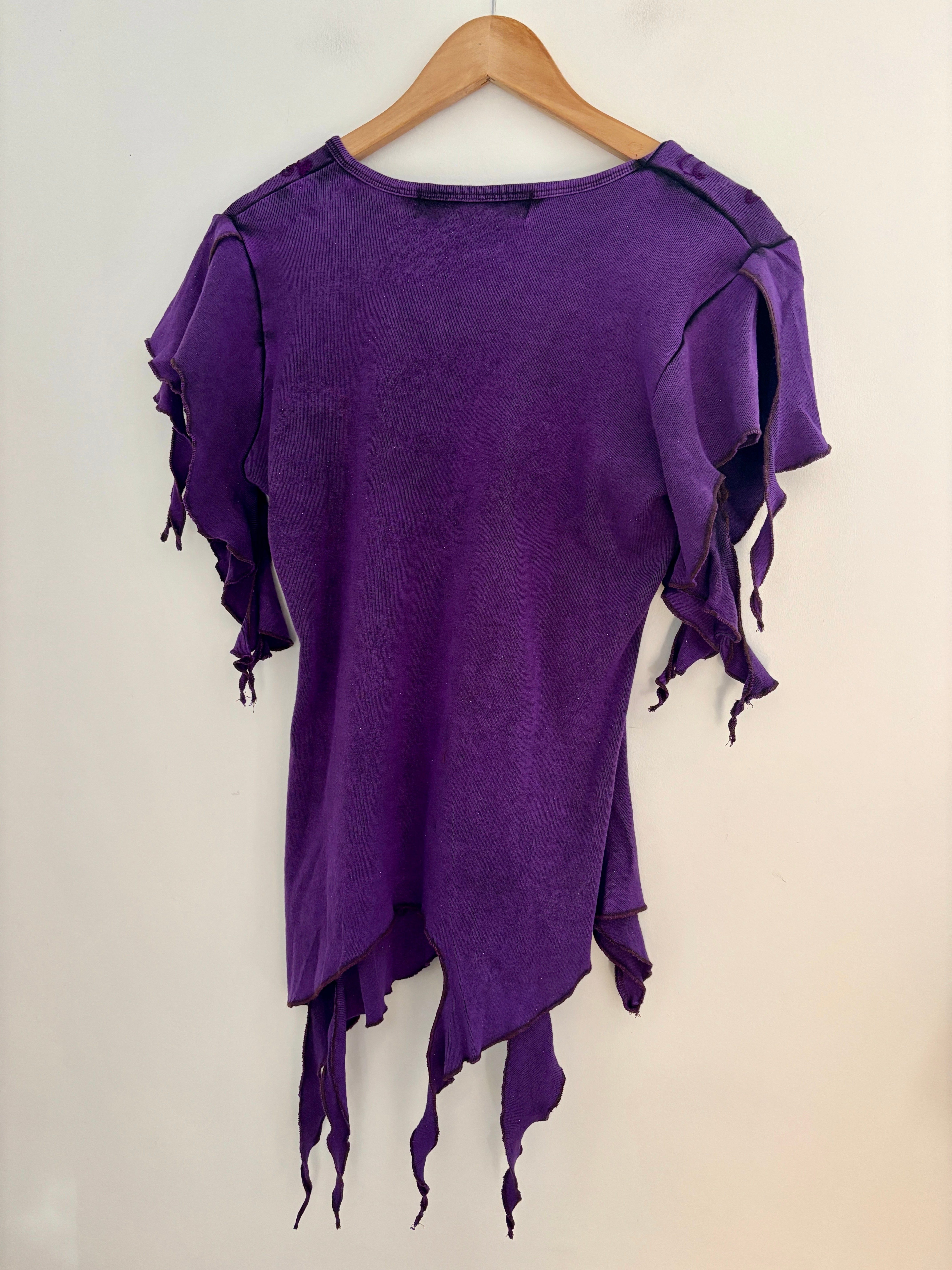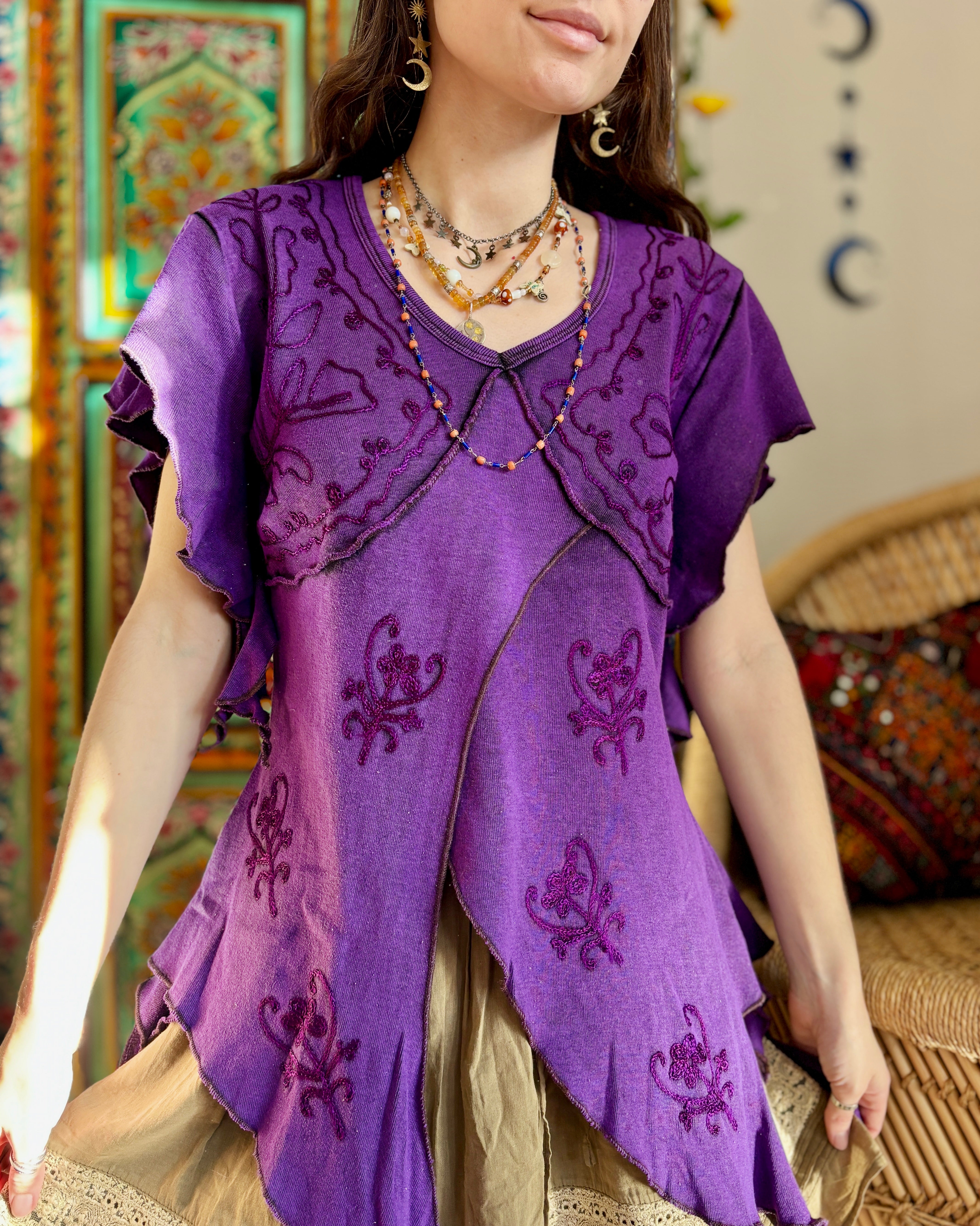 These beautiful long-sleeve tops are made from purple fabric, featuring embroidery and pointed sleeves to give a whimsical fairy look.