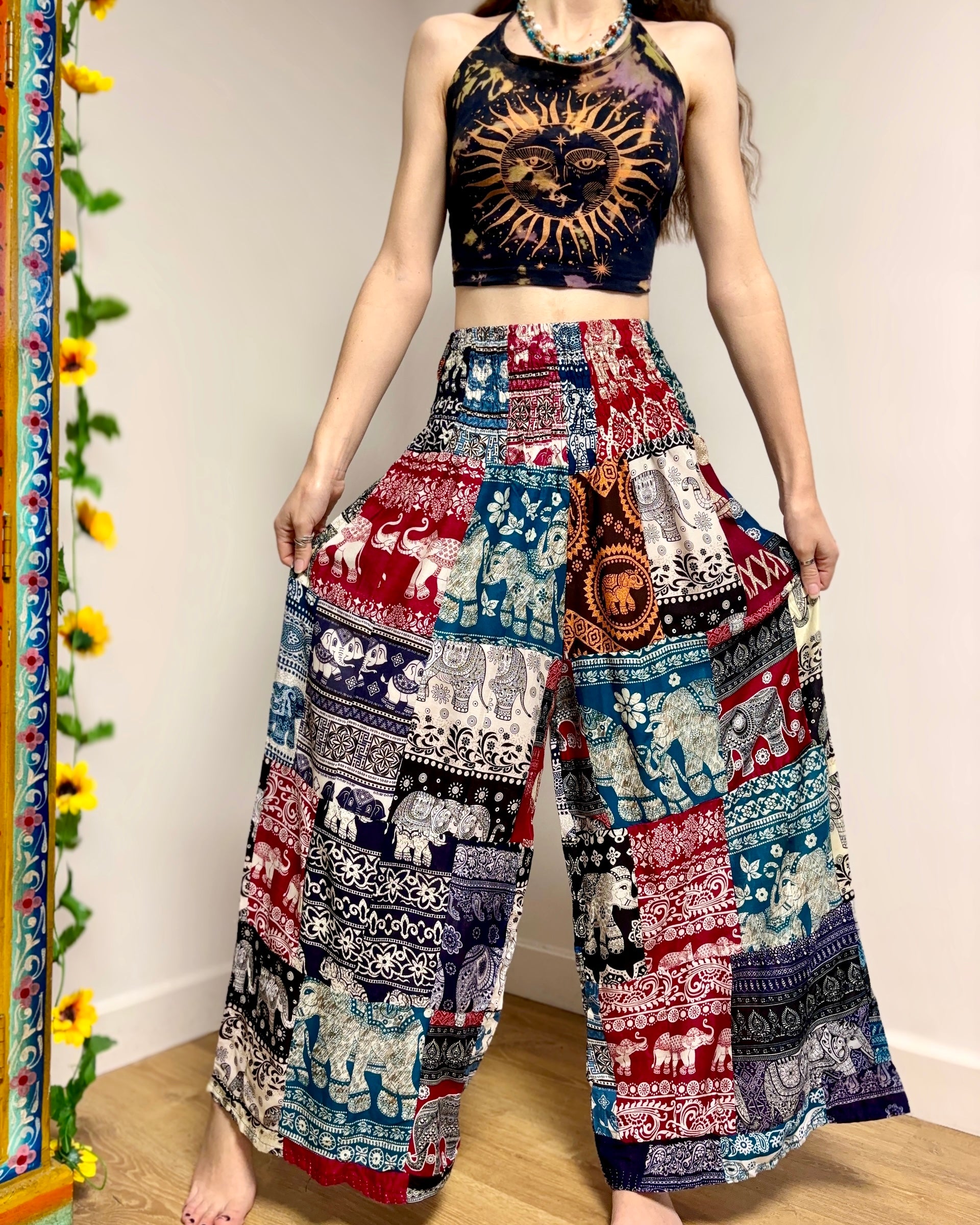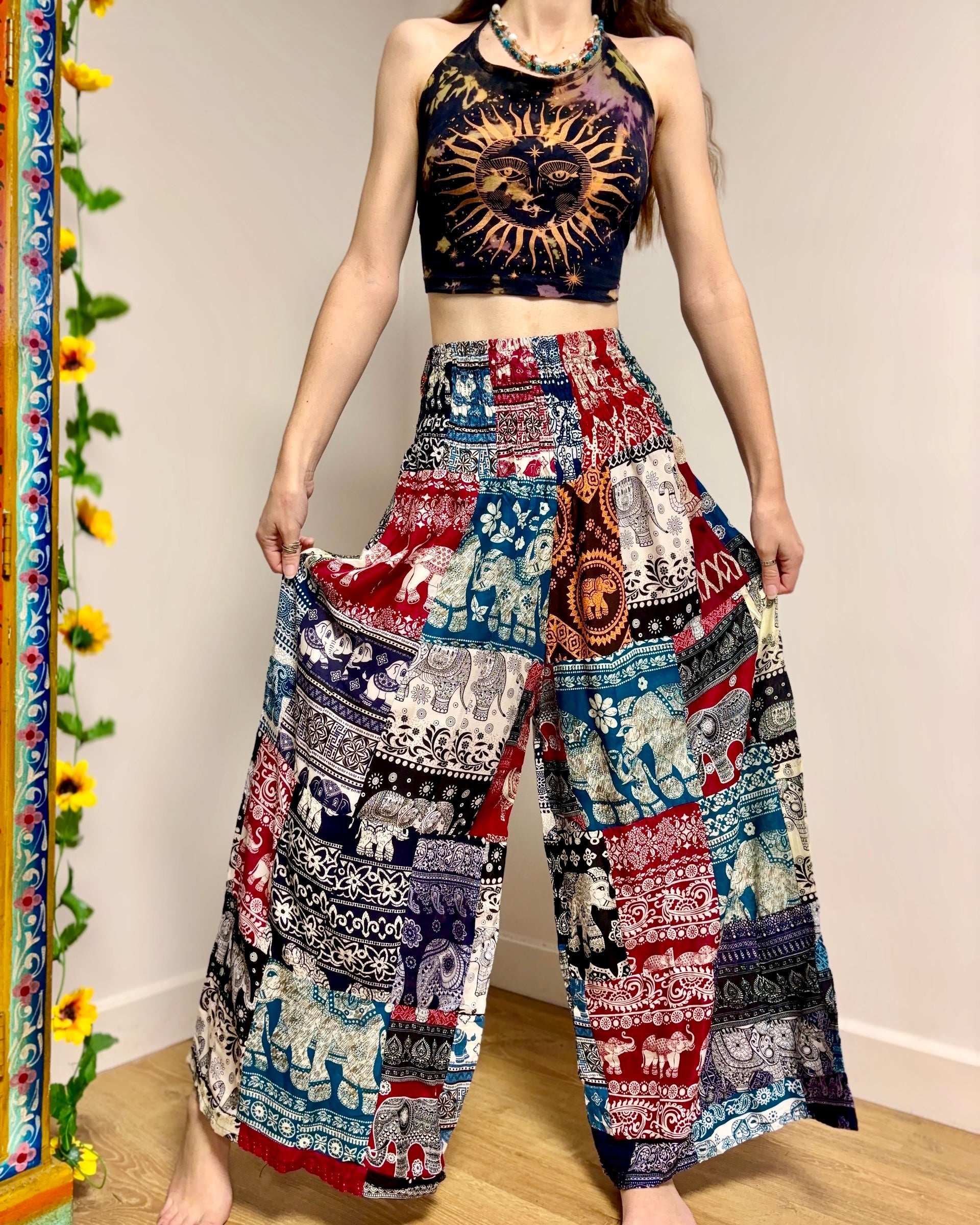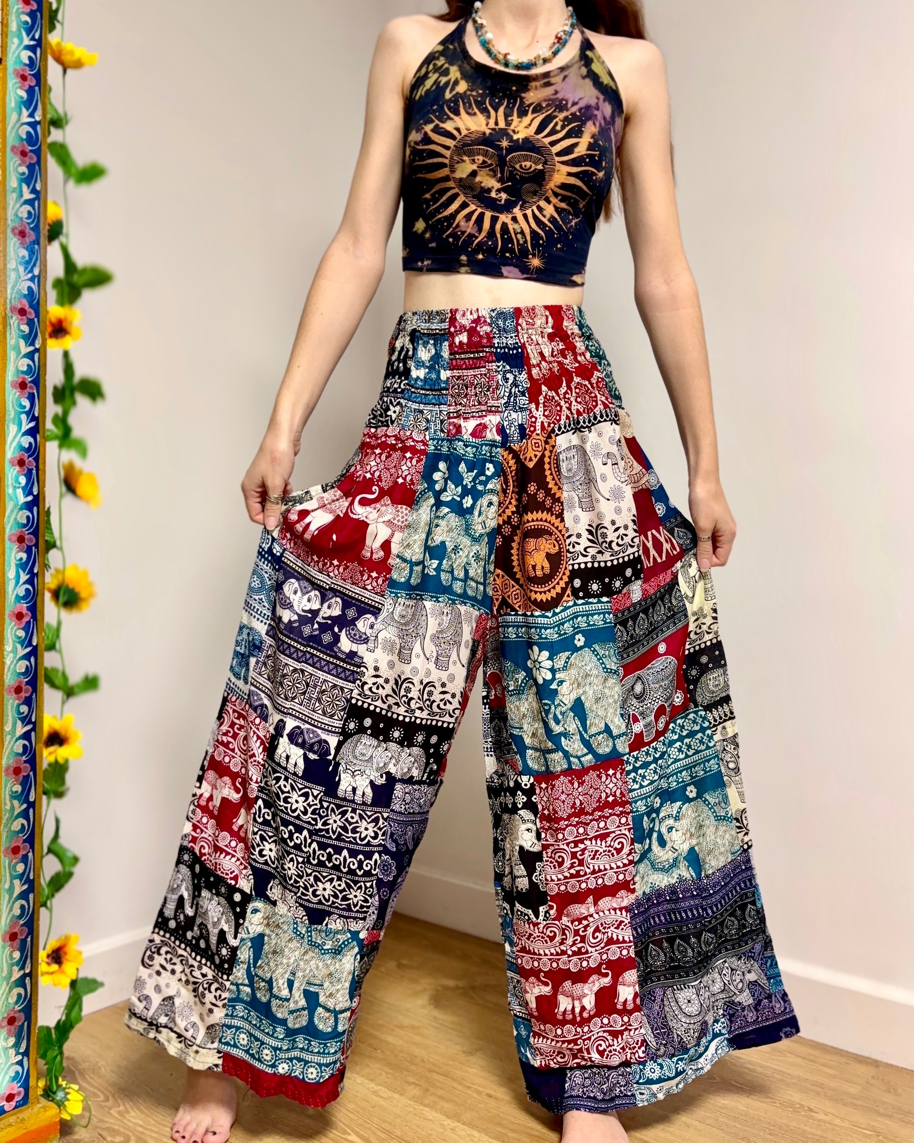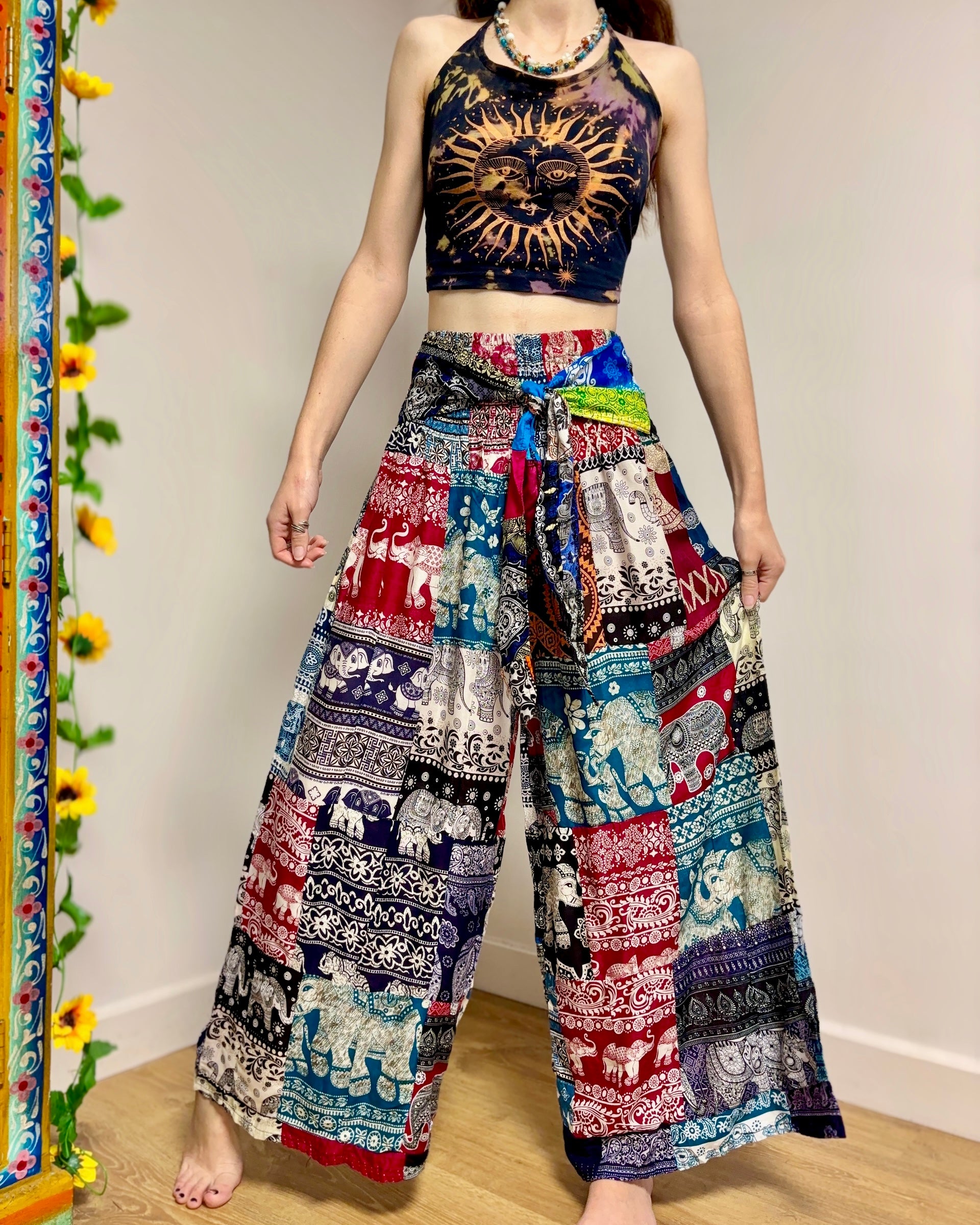 These beautiful palazzo trousers are made from patches of bright fabric made in a variety of designs. With an elasticated waist and wide flared bottoms, they provide a loose comfortable fit. They have a tie that can be worn at the front or back!