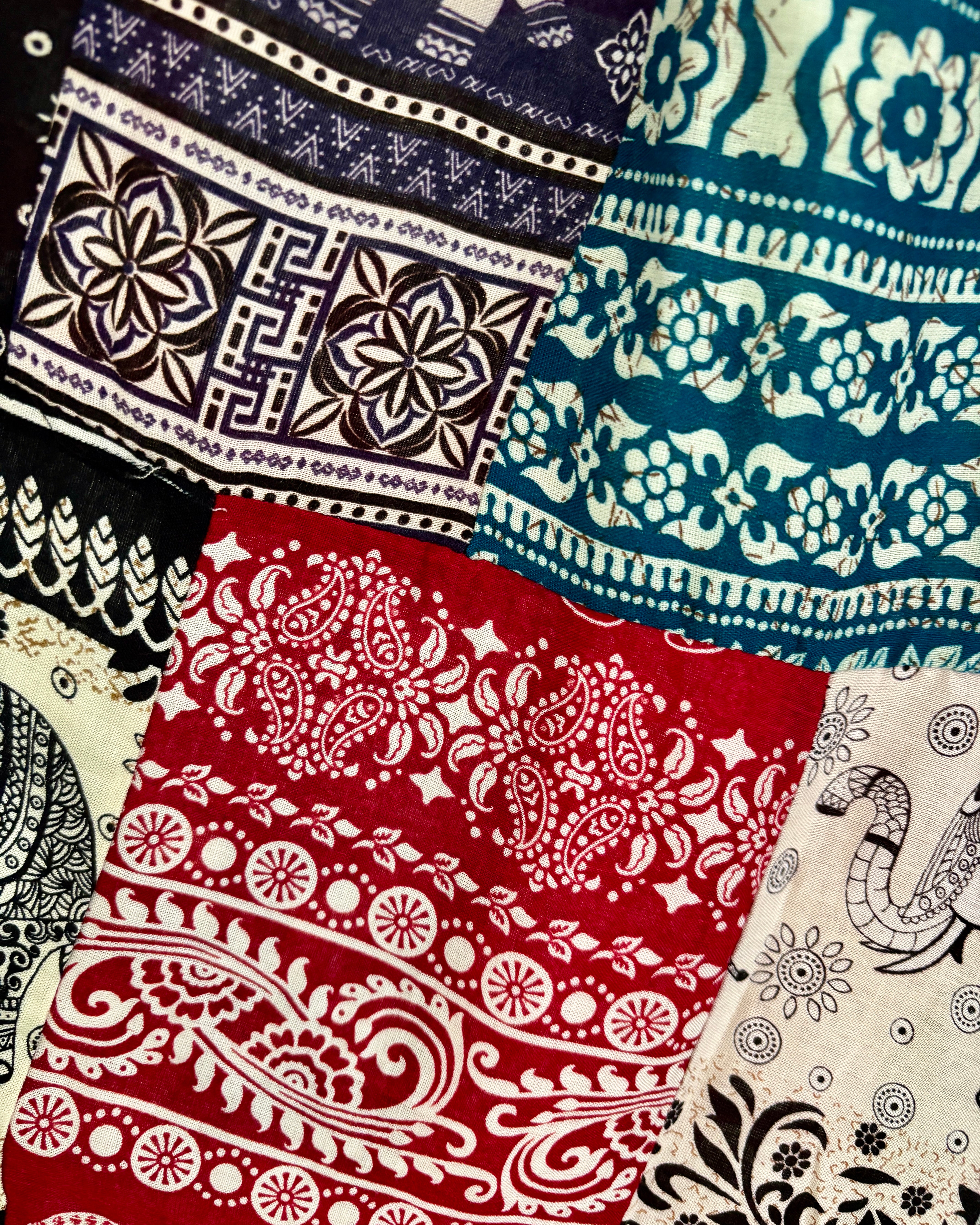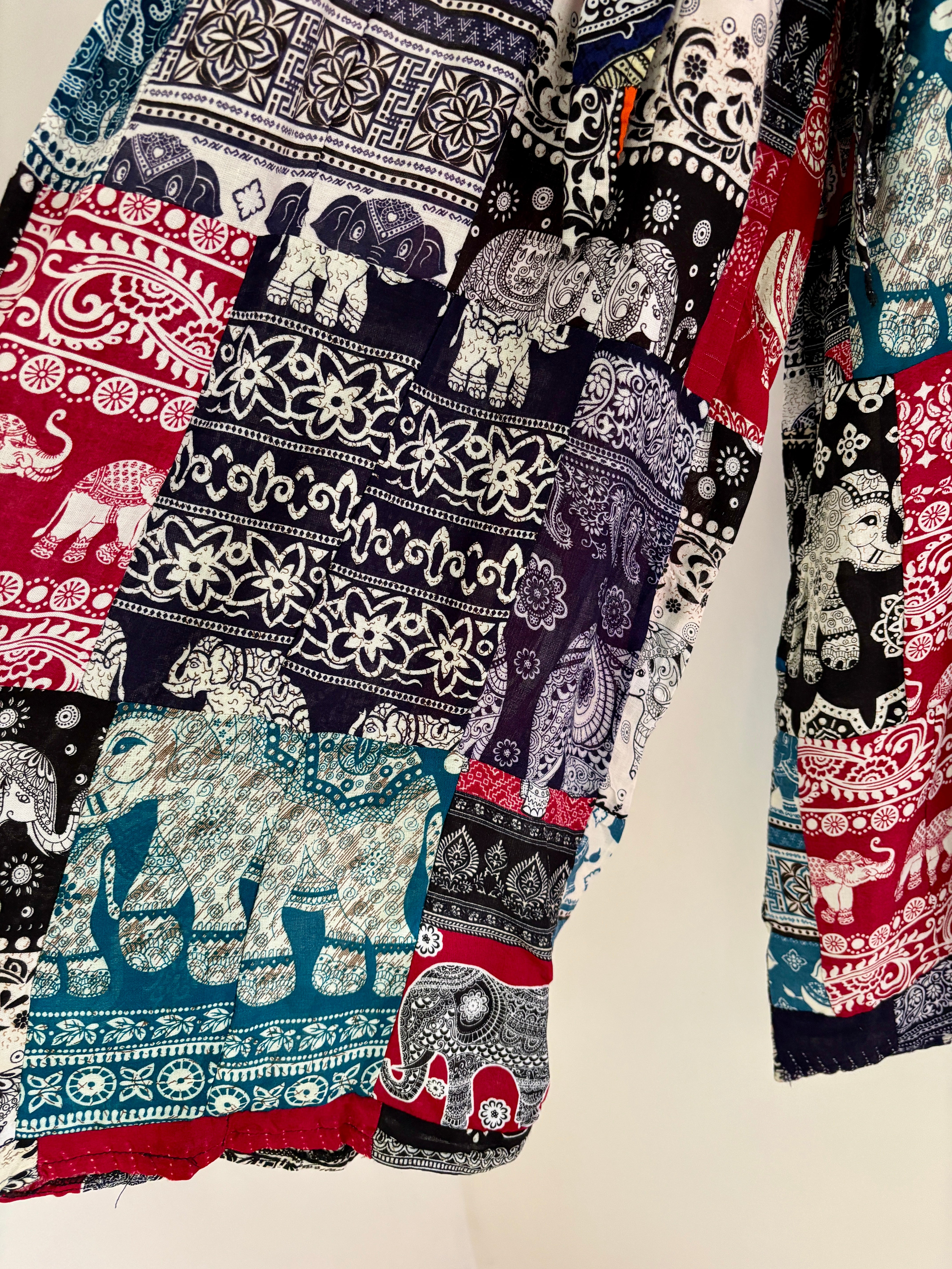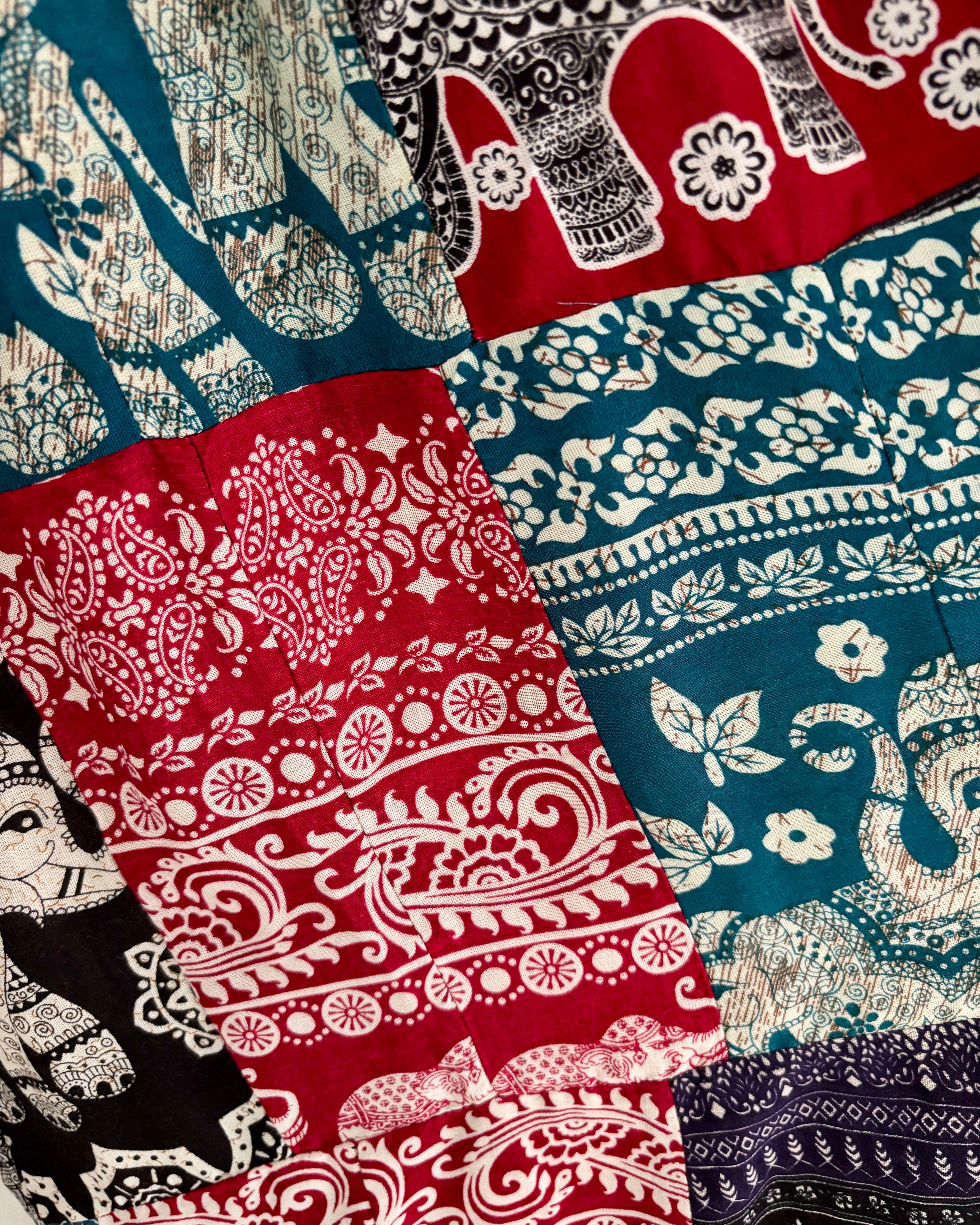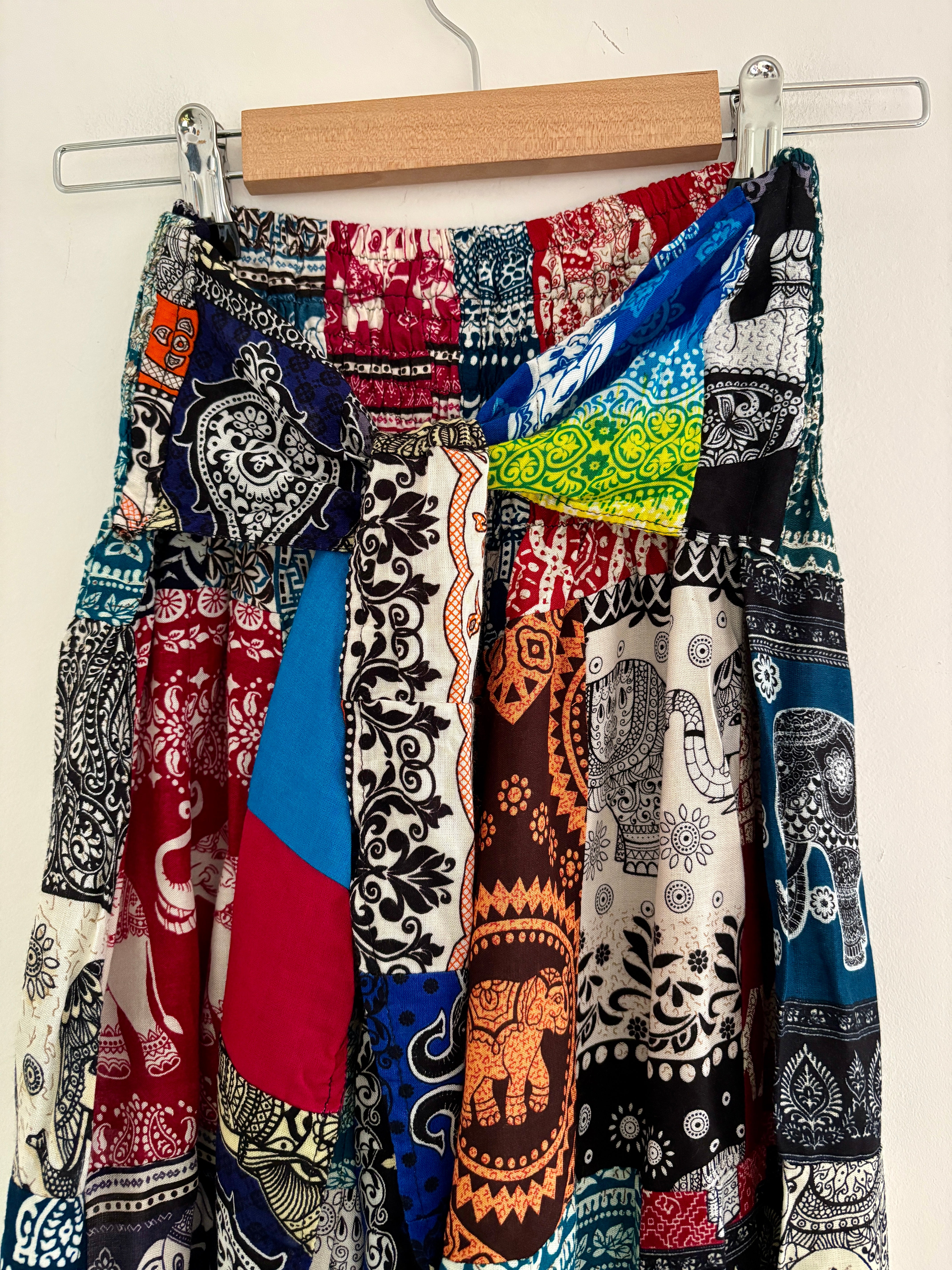 These beautiful palazzo trousers are made from patches of bright fabric made in a variety of designs. With an elasticated waist and wide flared bottoms, they provide a loose comfortable fit. They have a tie that can be worn at the front or back!