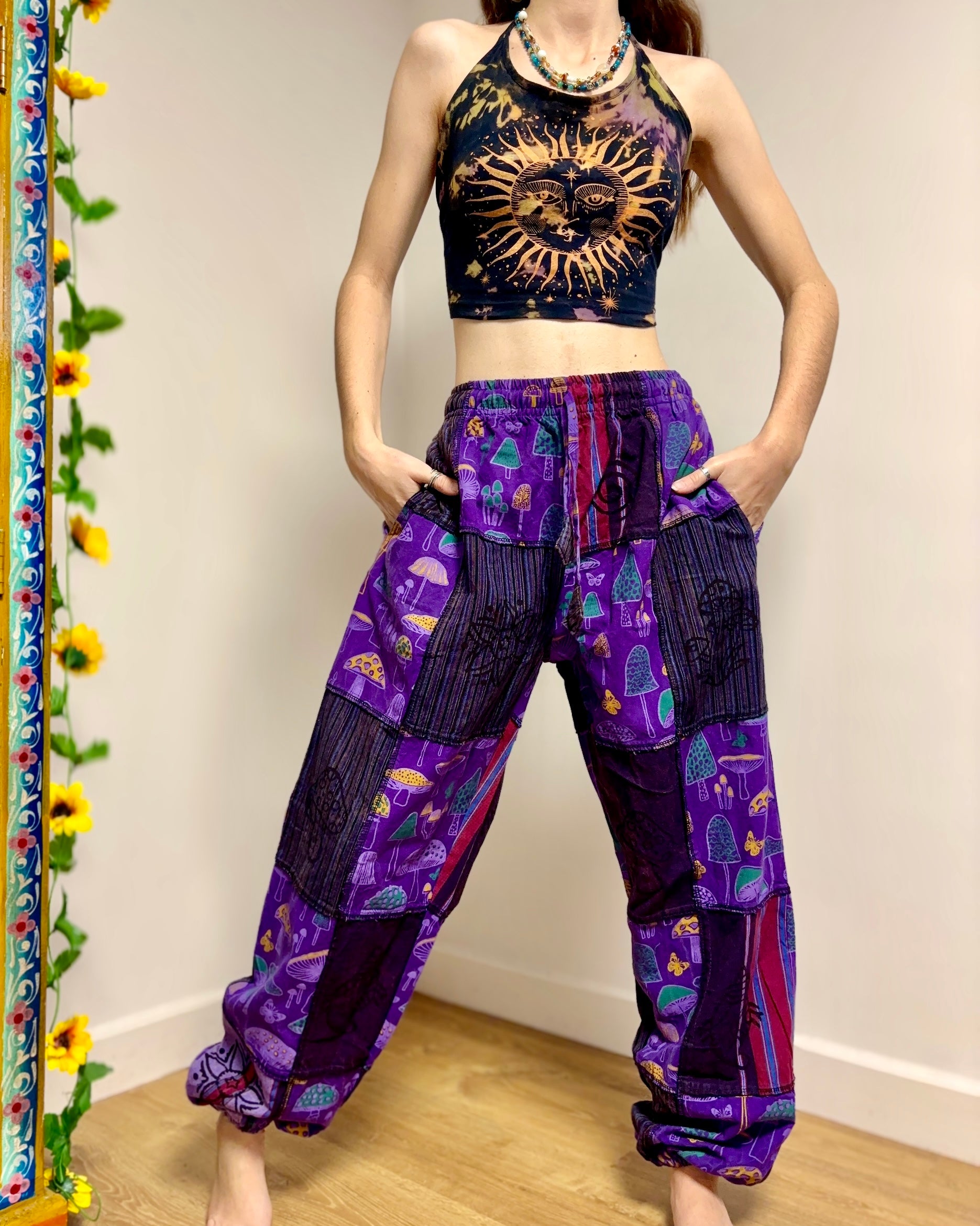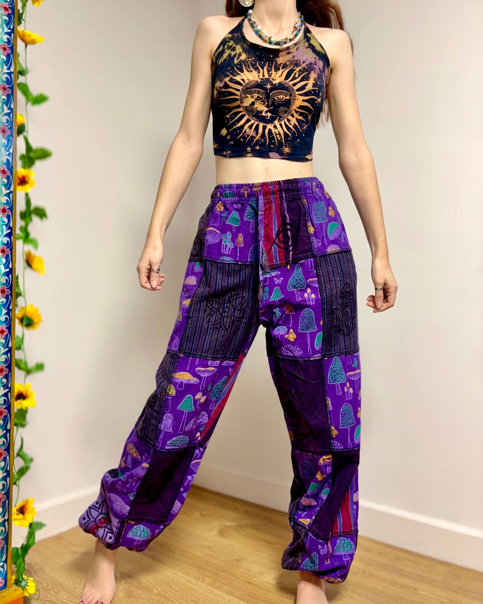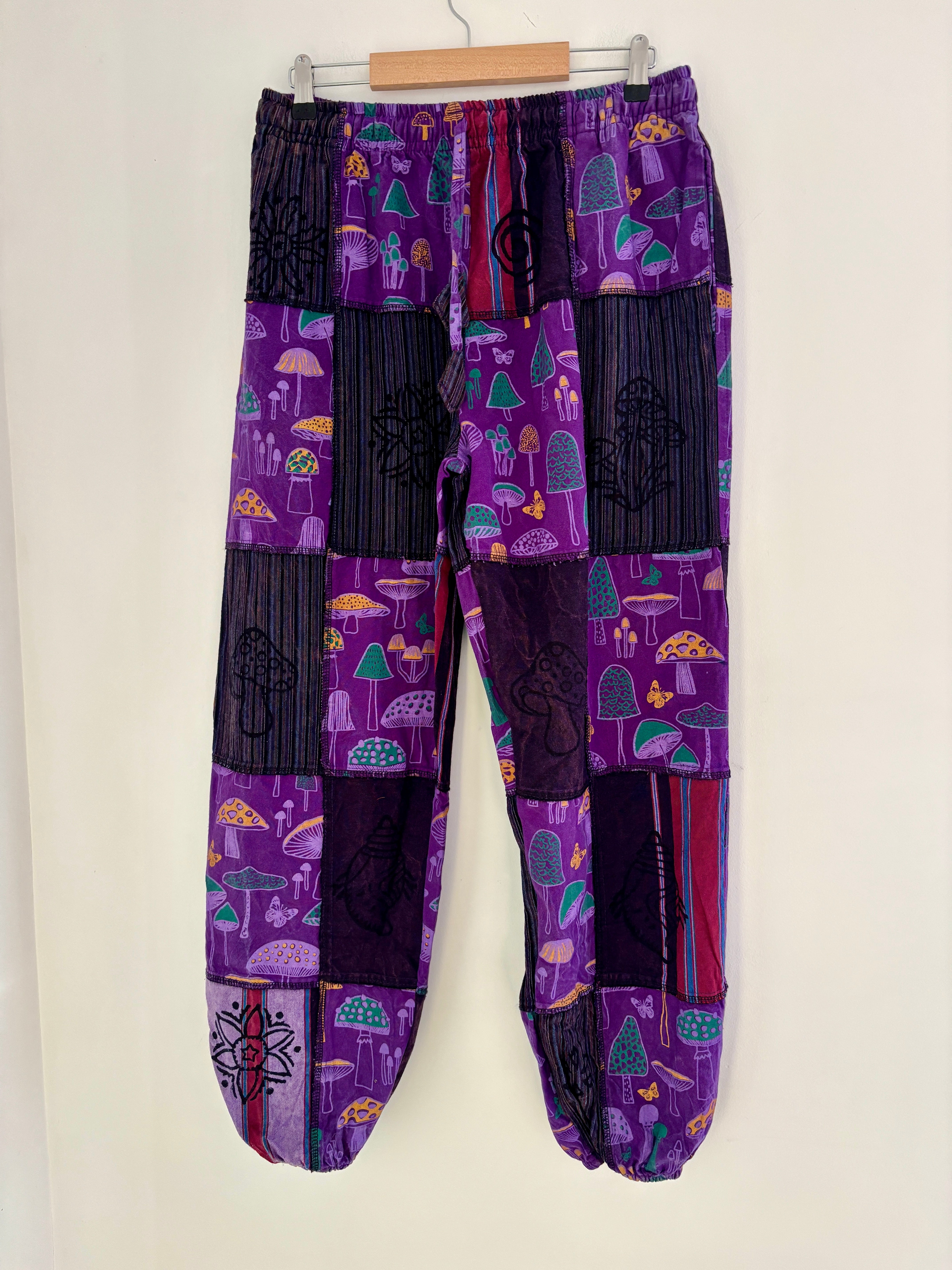 These harmed are made from purple coloured fabric featuring mushroom and stripe patches. They have an elasticated waist and 2 side pockets.