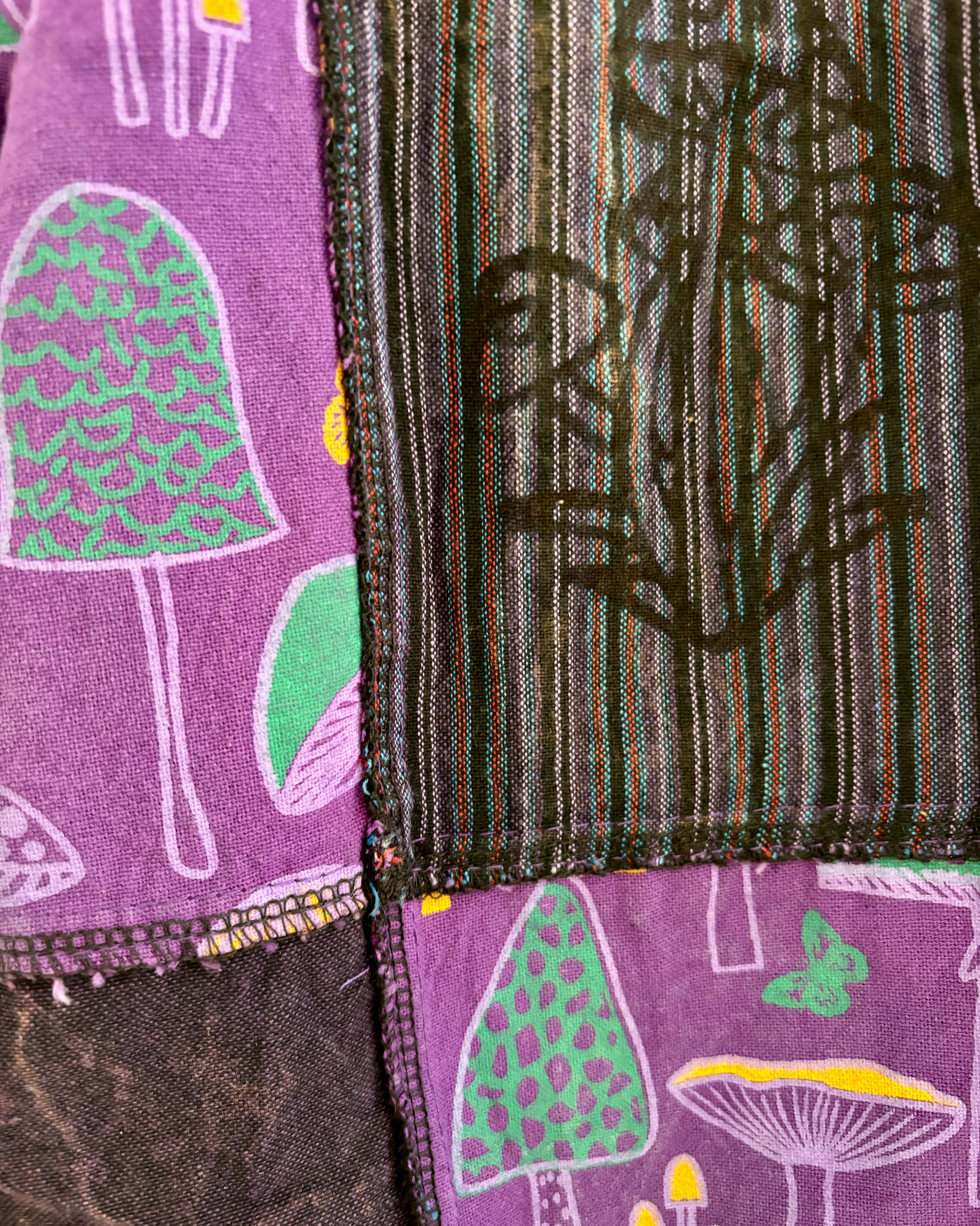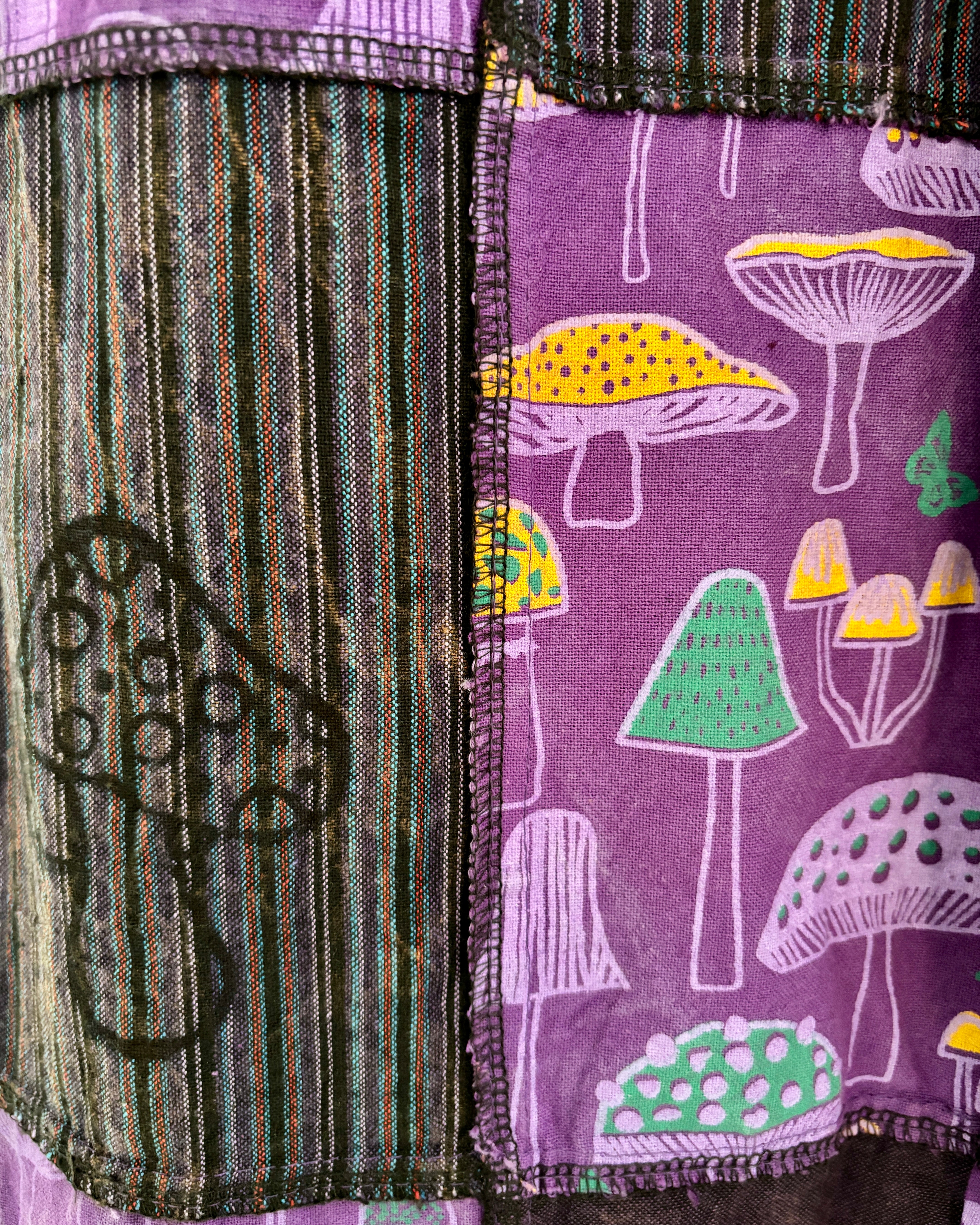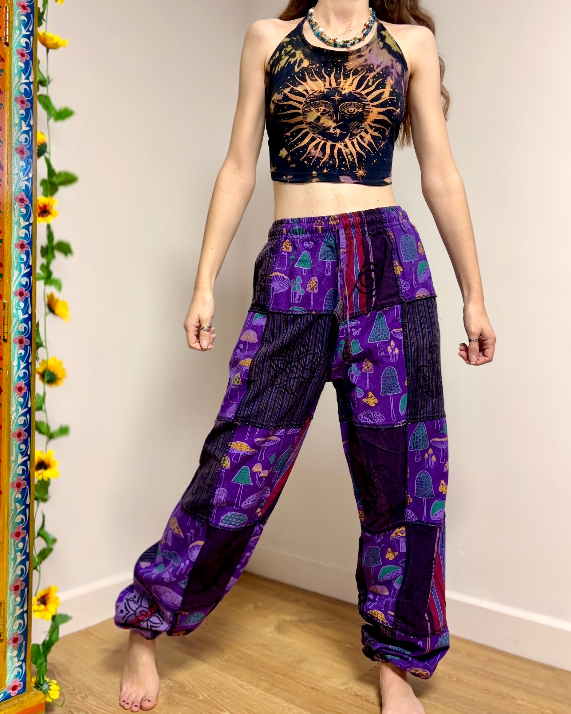 These harmed are made from purple coloured fabric featuring mushroom and stripe patches. They have an elasticated waist and 2 side pockets.