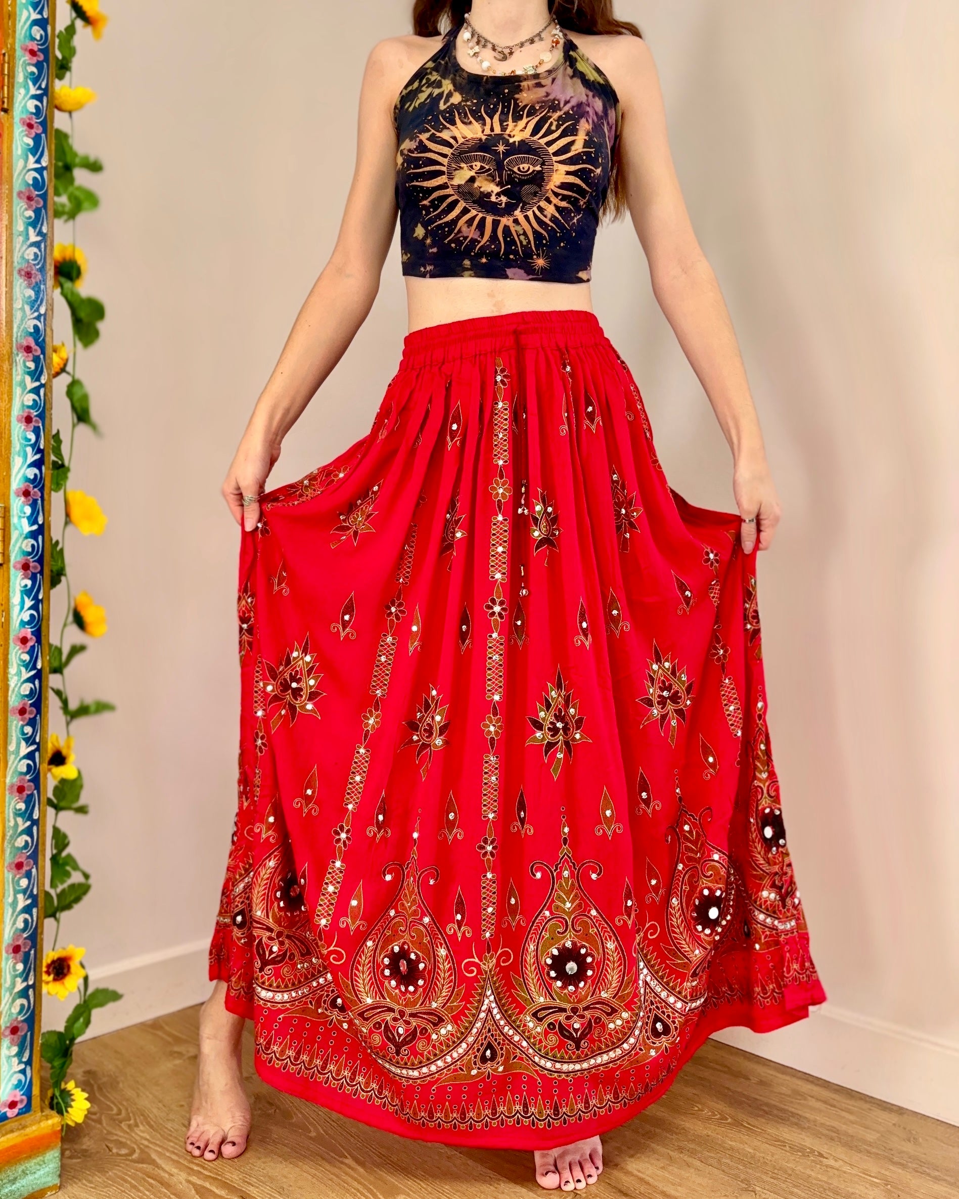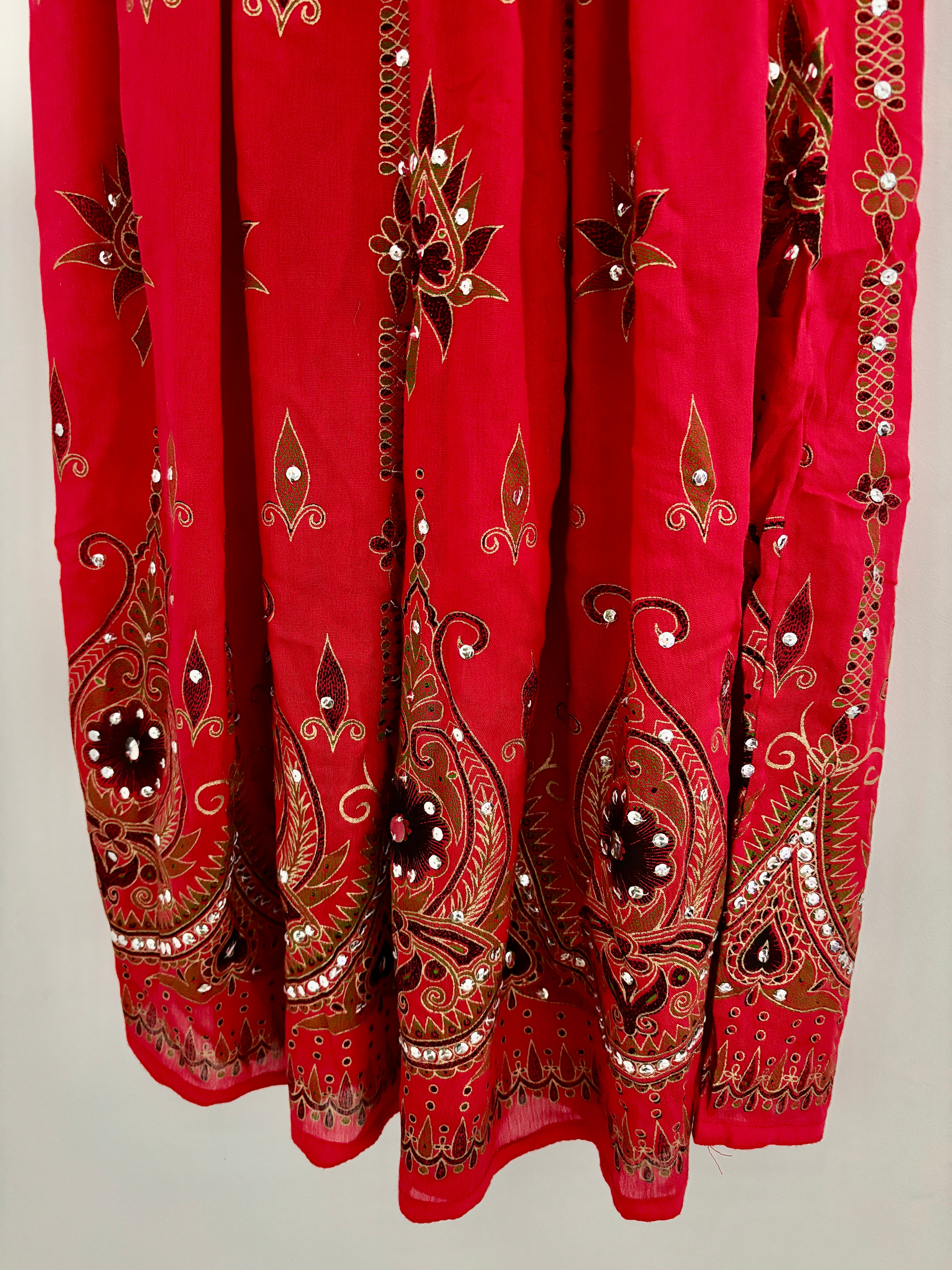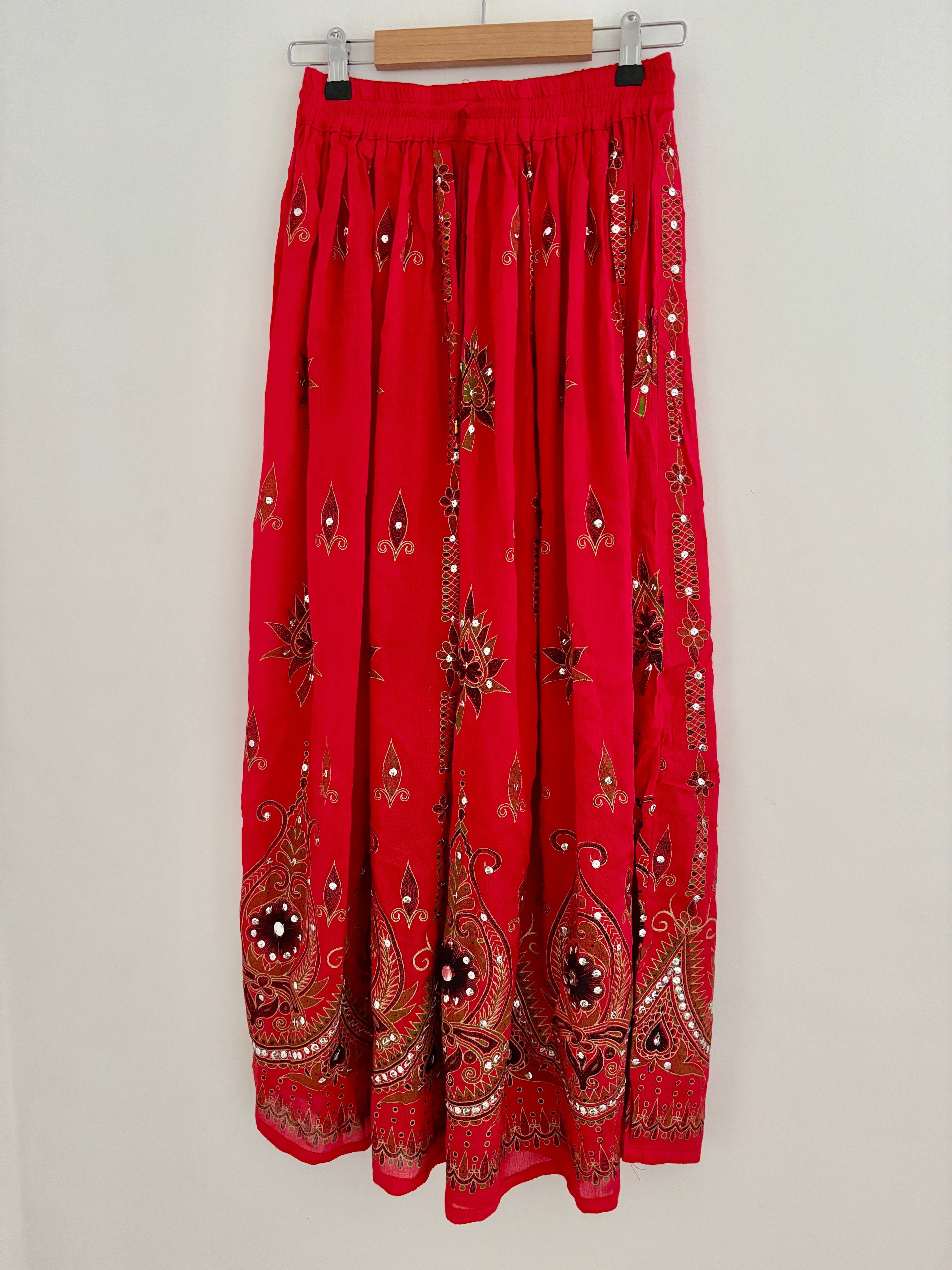 This beautiful skirt is made from Indian block-printed fabric adorned with sequins and bells.