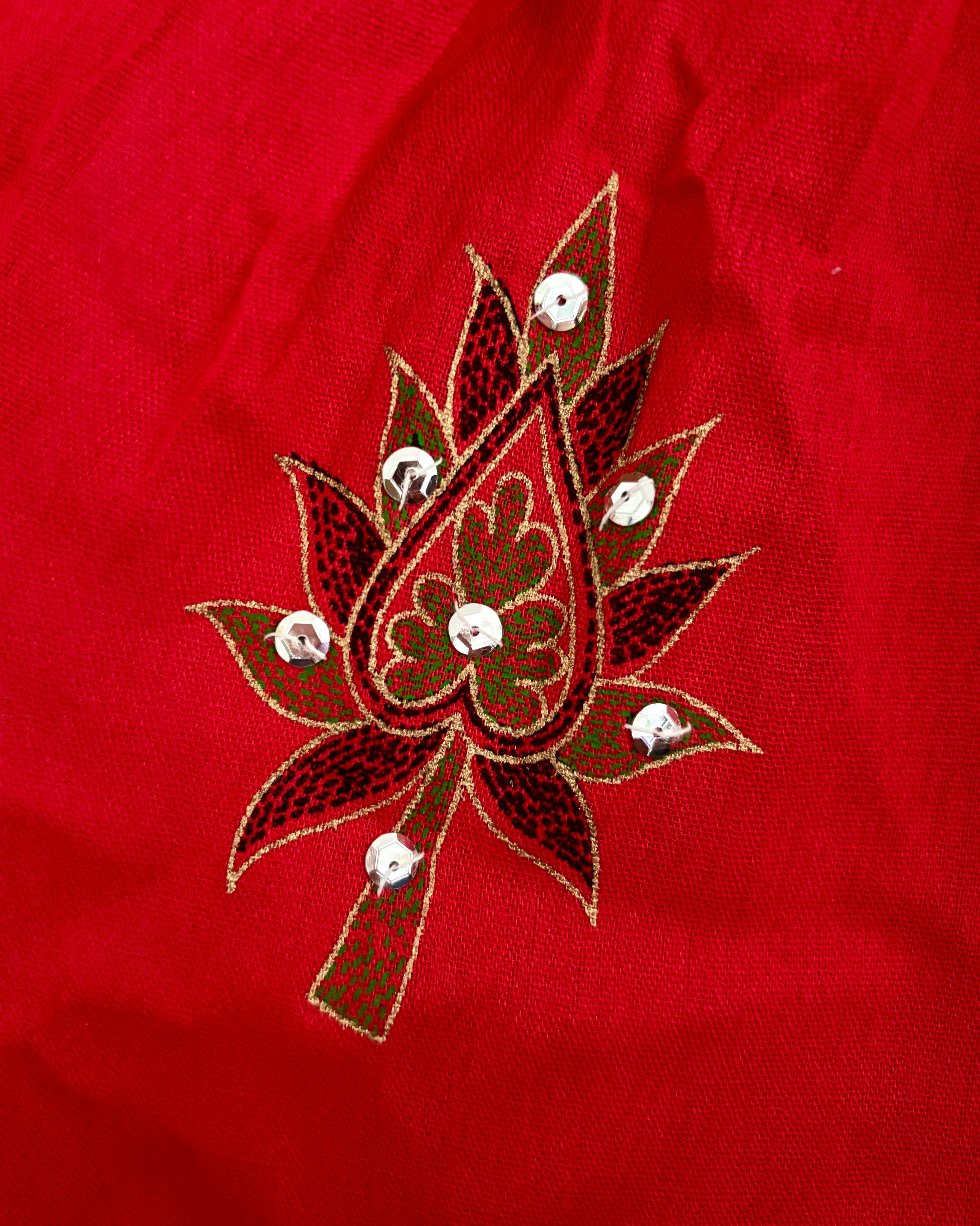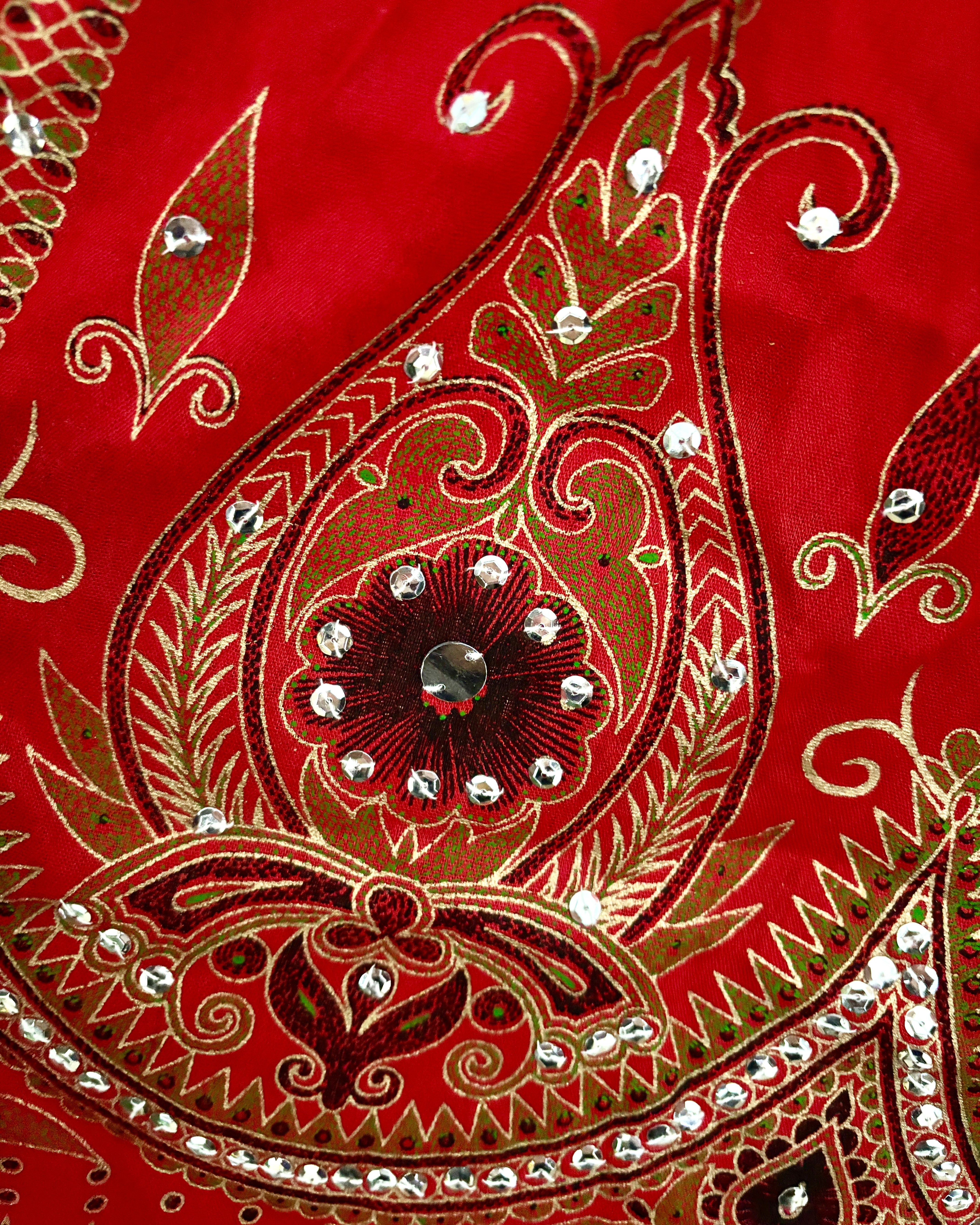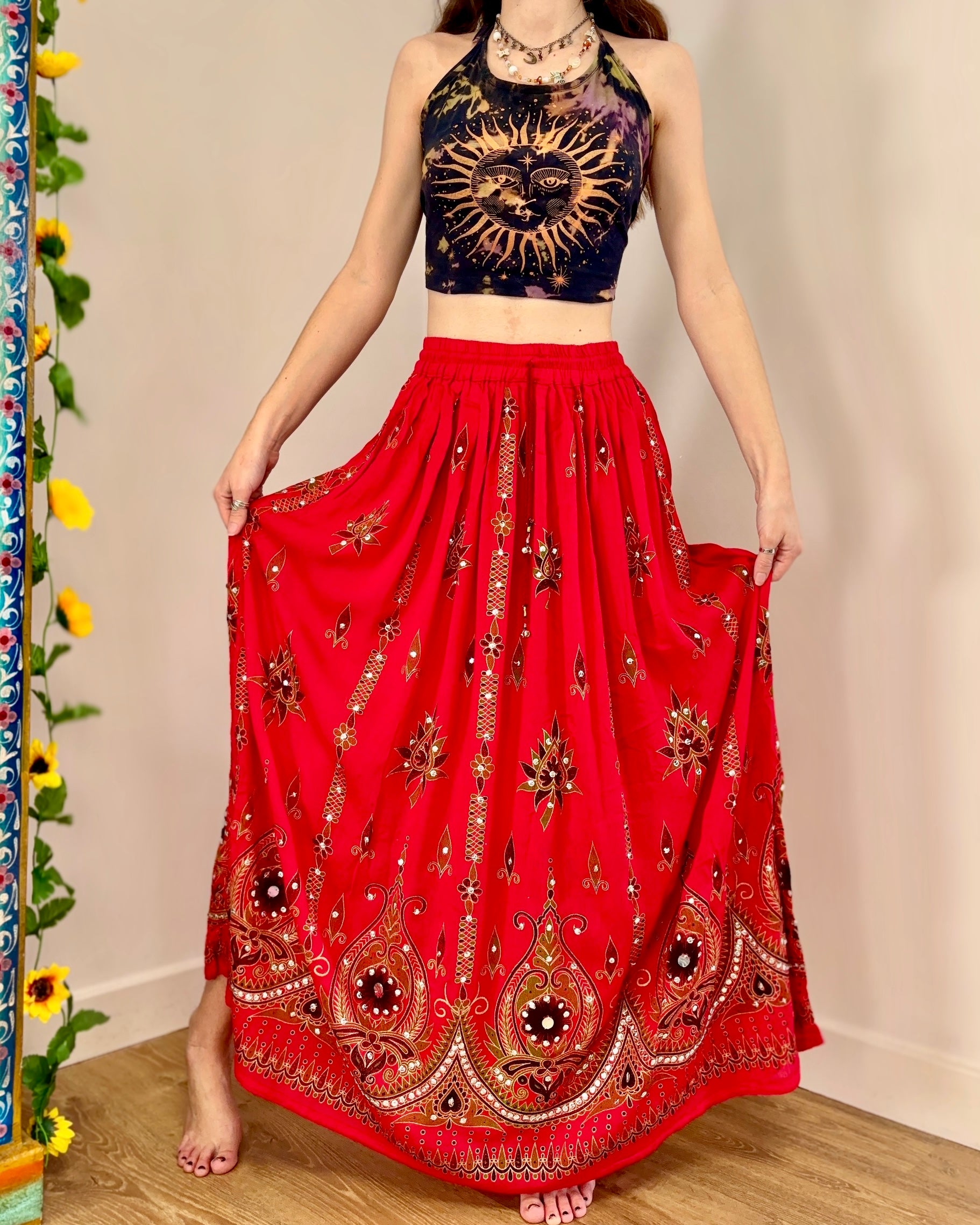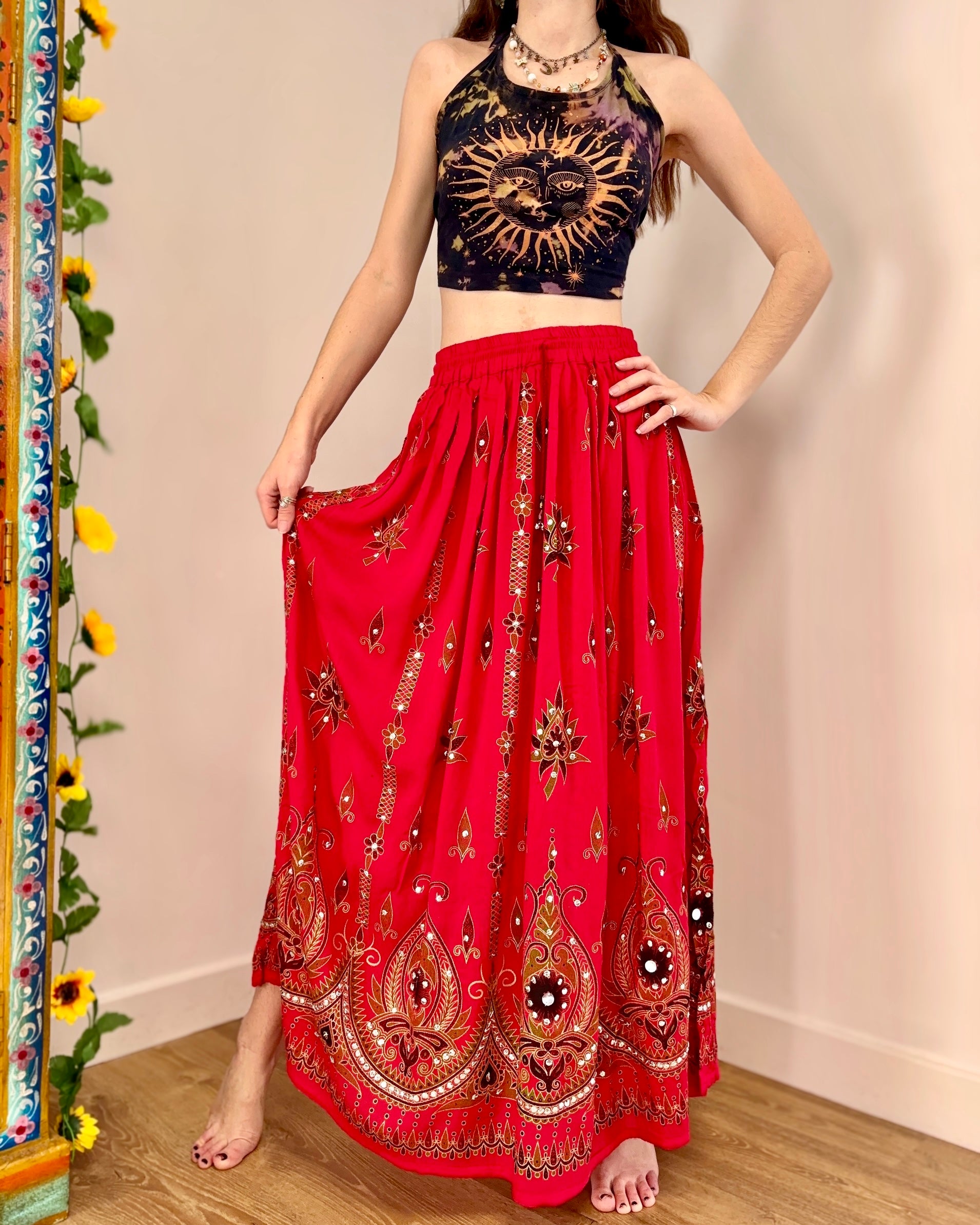This beautiful skirt is made from Indian block-printed fabric adorned with sequins and bells.