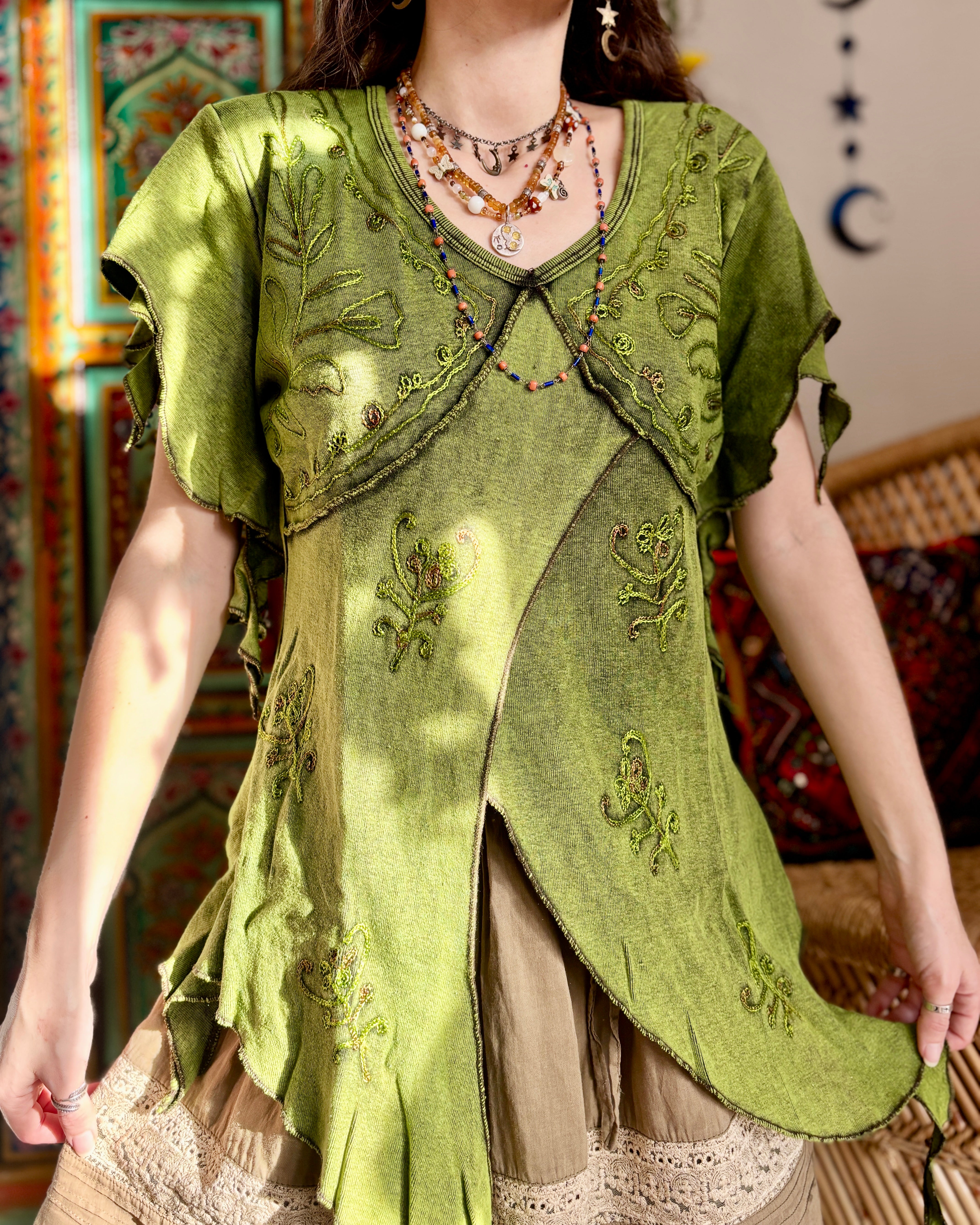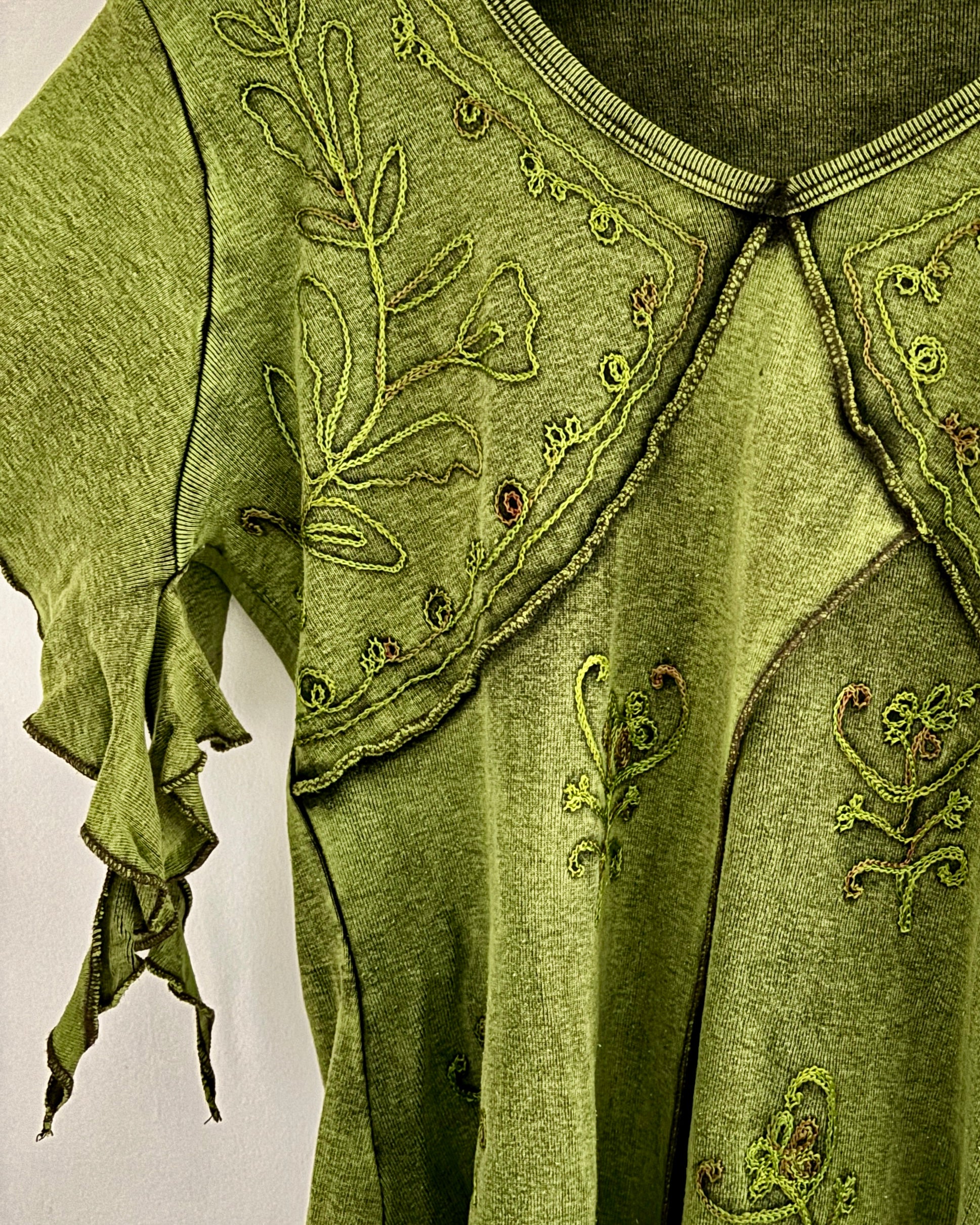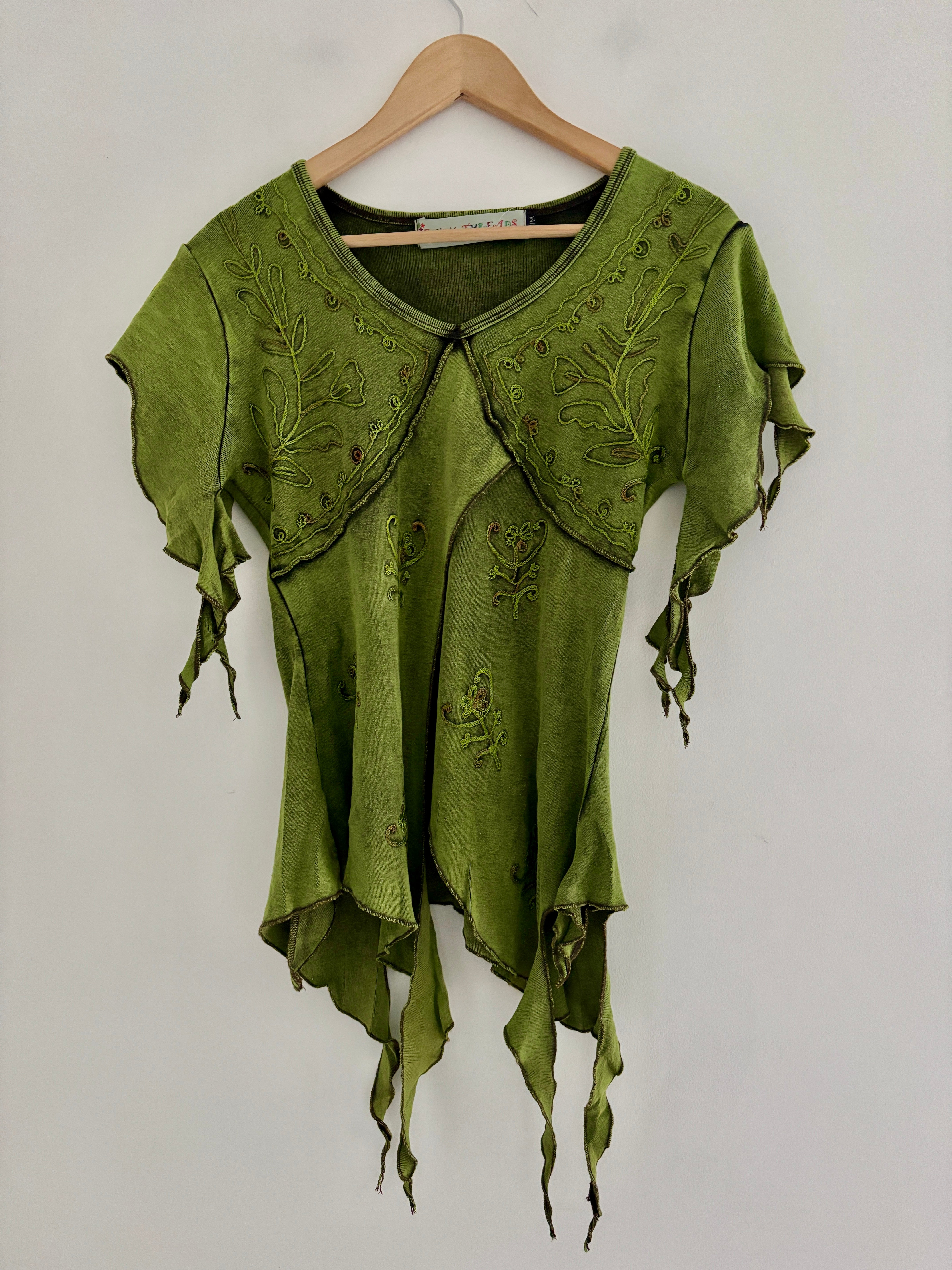 These beautiful tops are made from green fabric, featuring embroidery and pointed sleeves to give a whimsical fairy look.