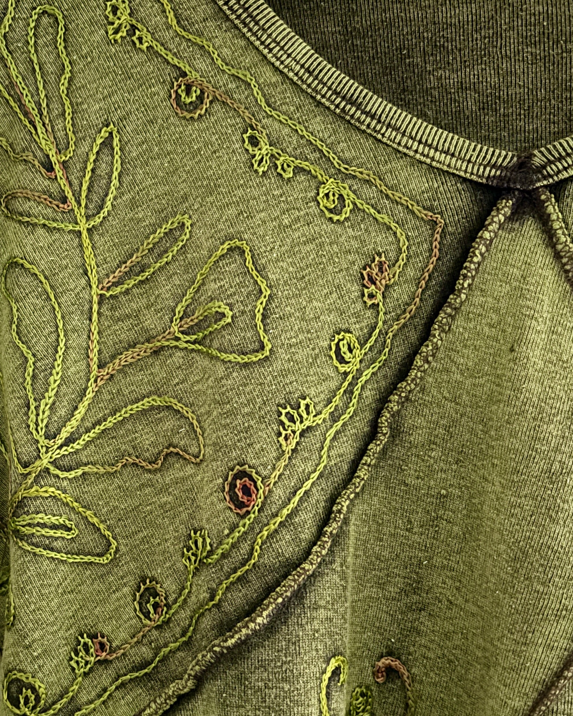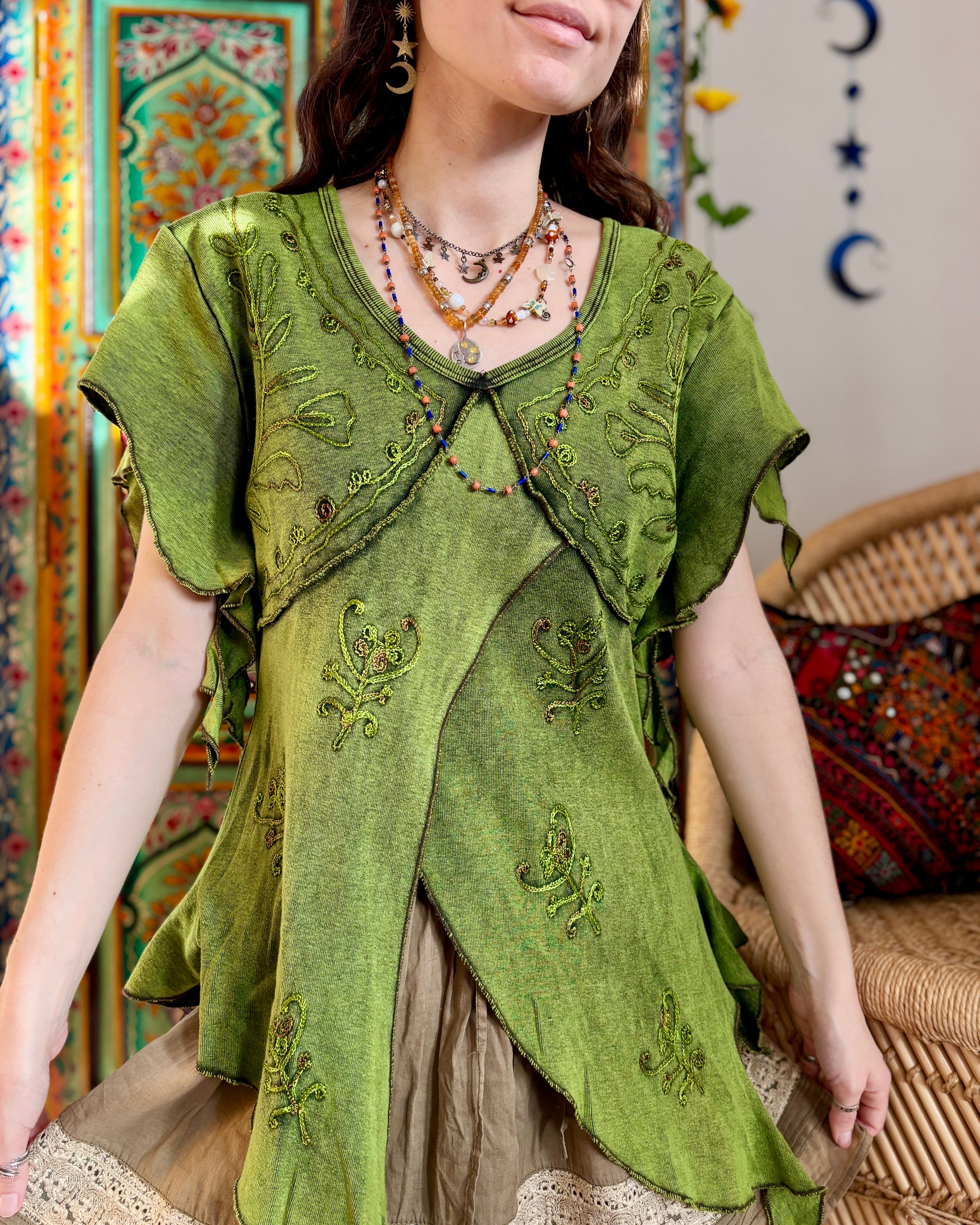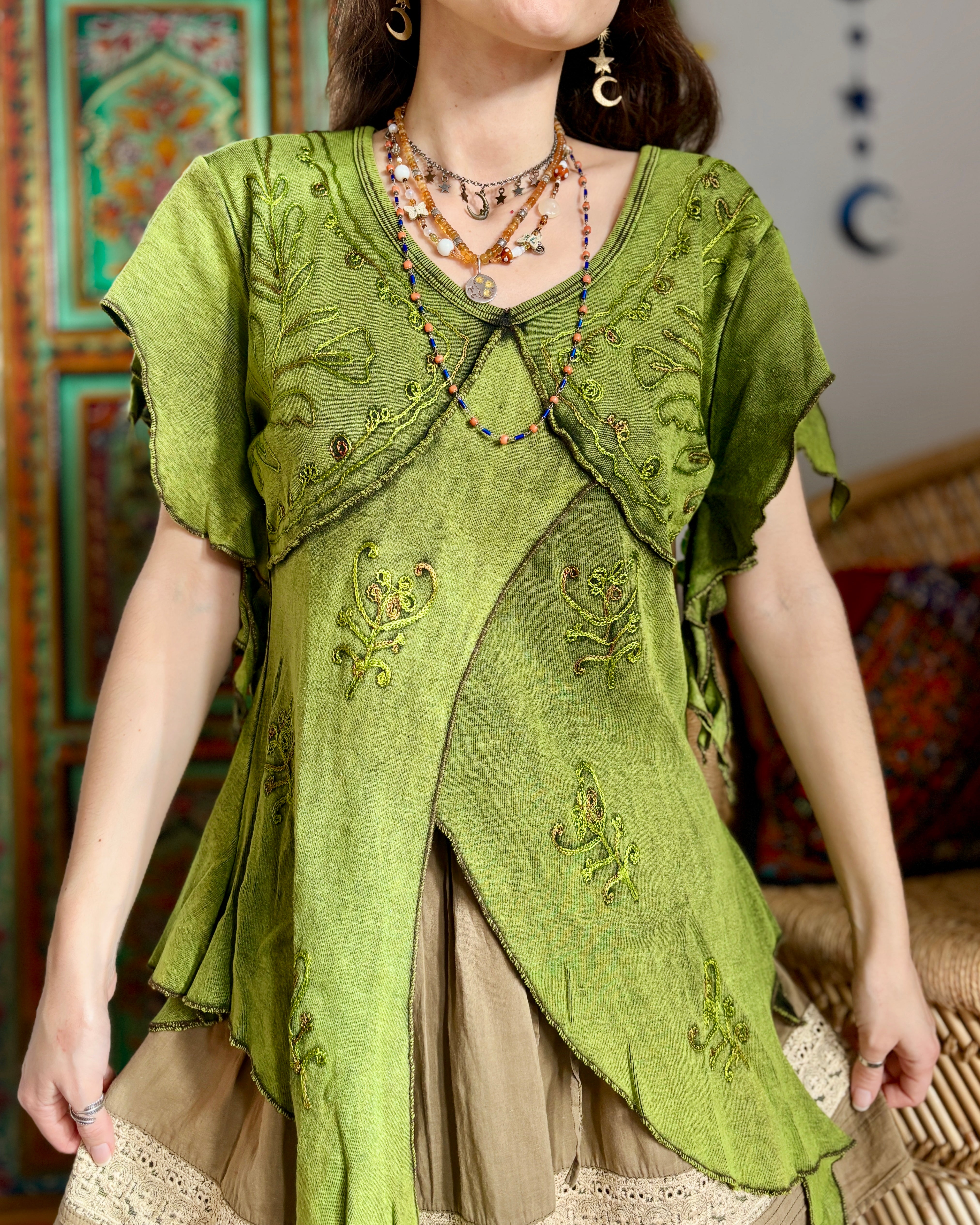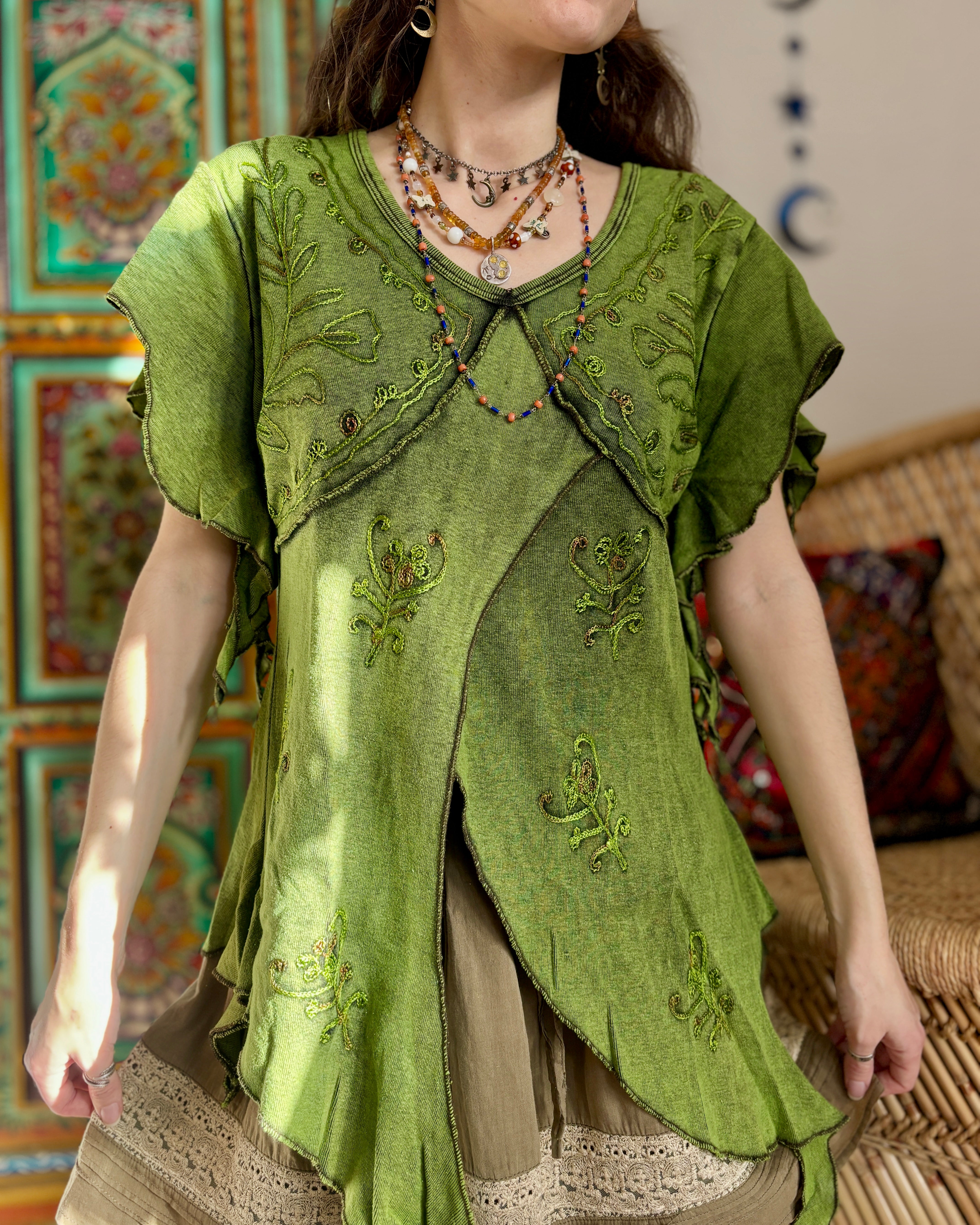 These beautiful tops are made from green fabric, featuring embroidery and pointed sleeves to give a whimsical fairy look.