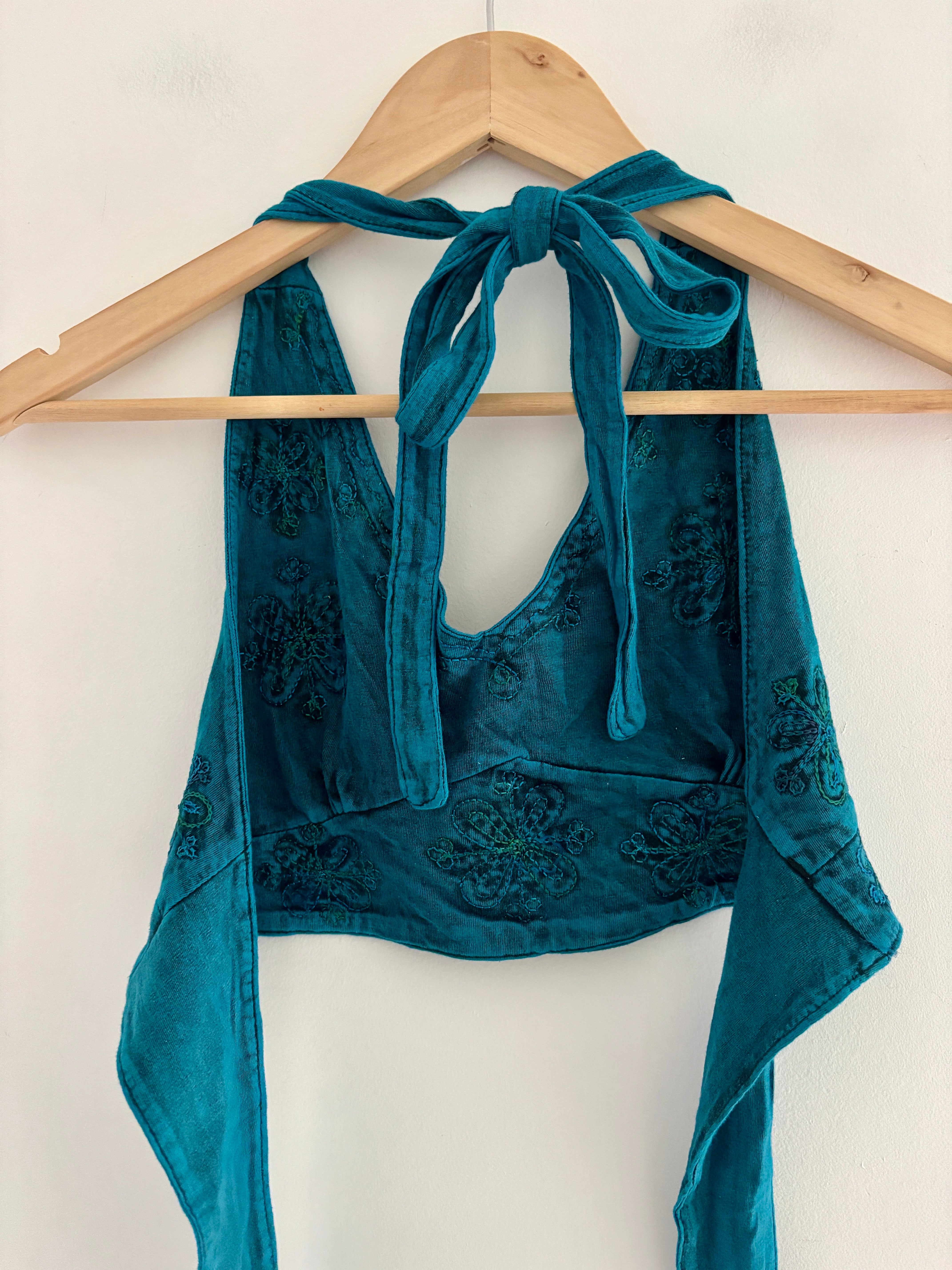 These beautiful halter tops are decorated with embroidery with ties at the neck and back.