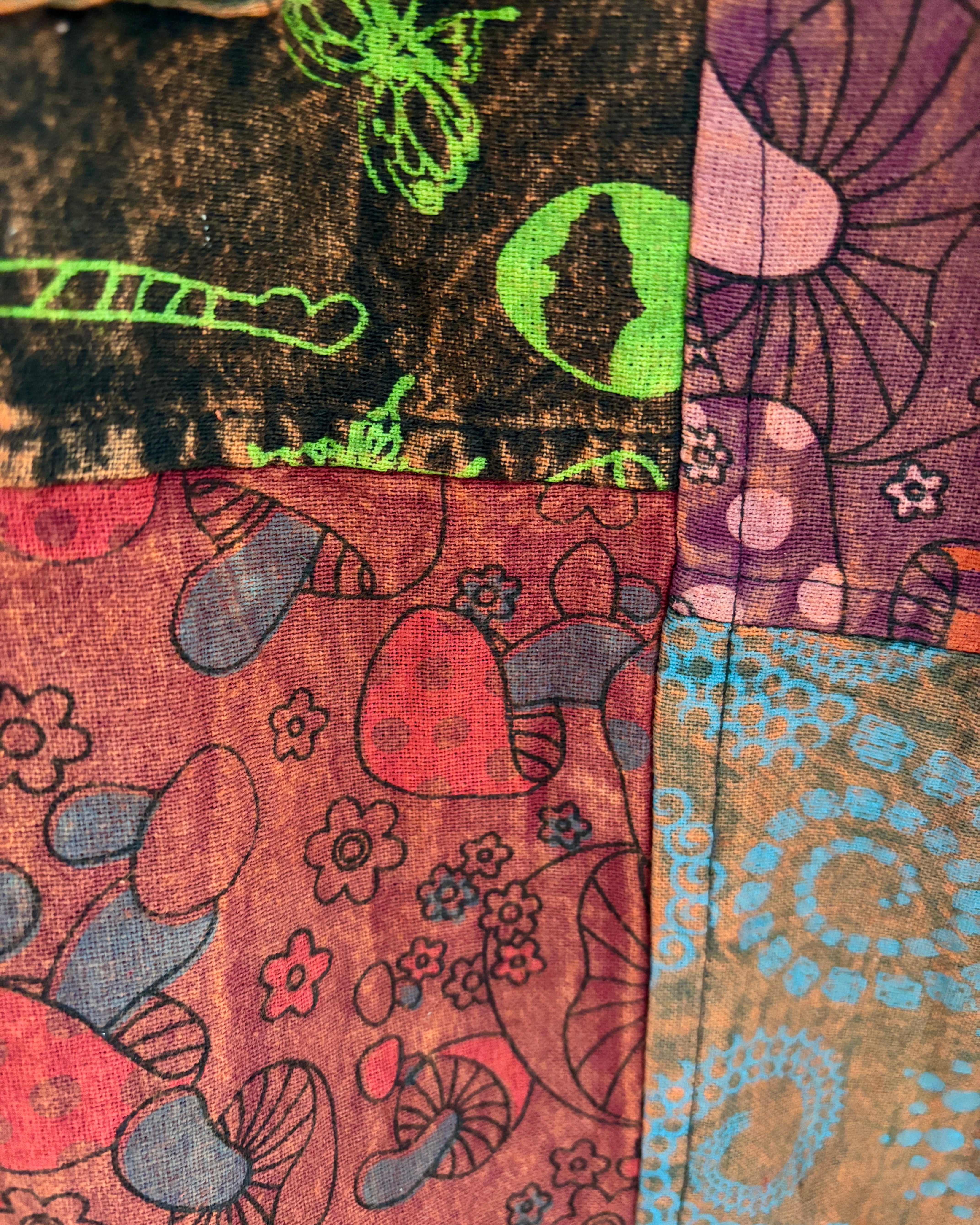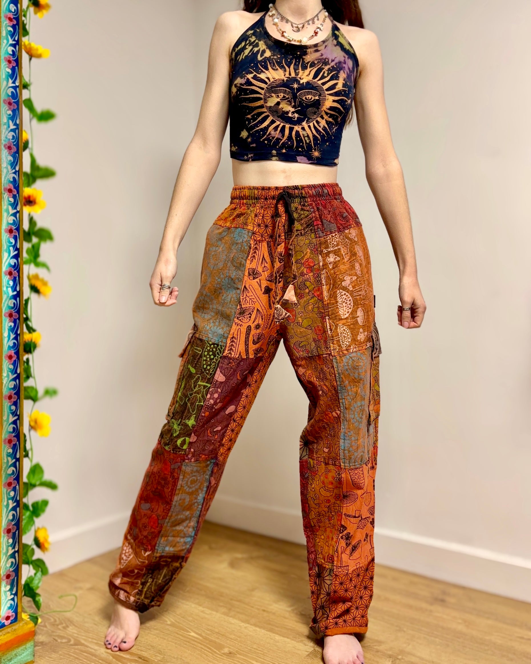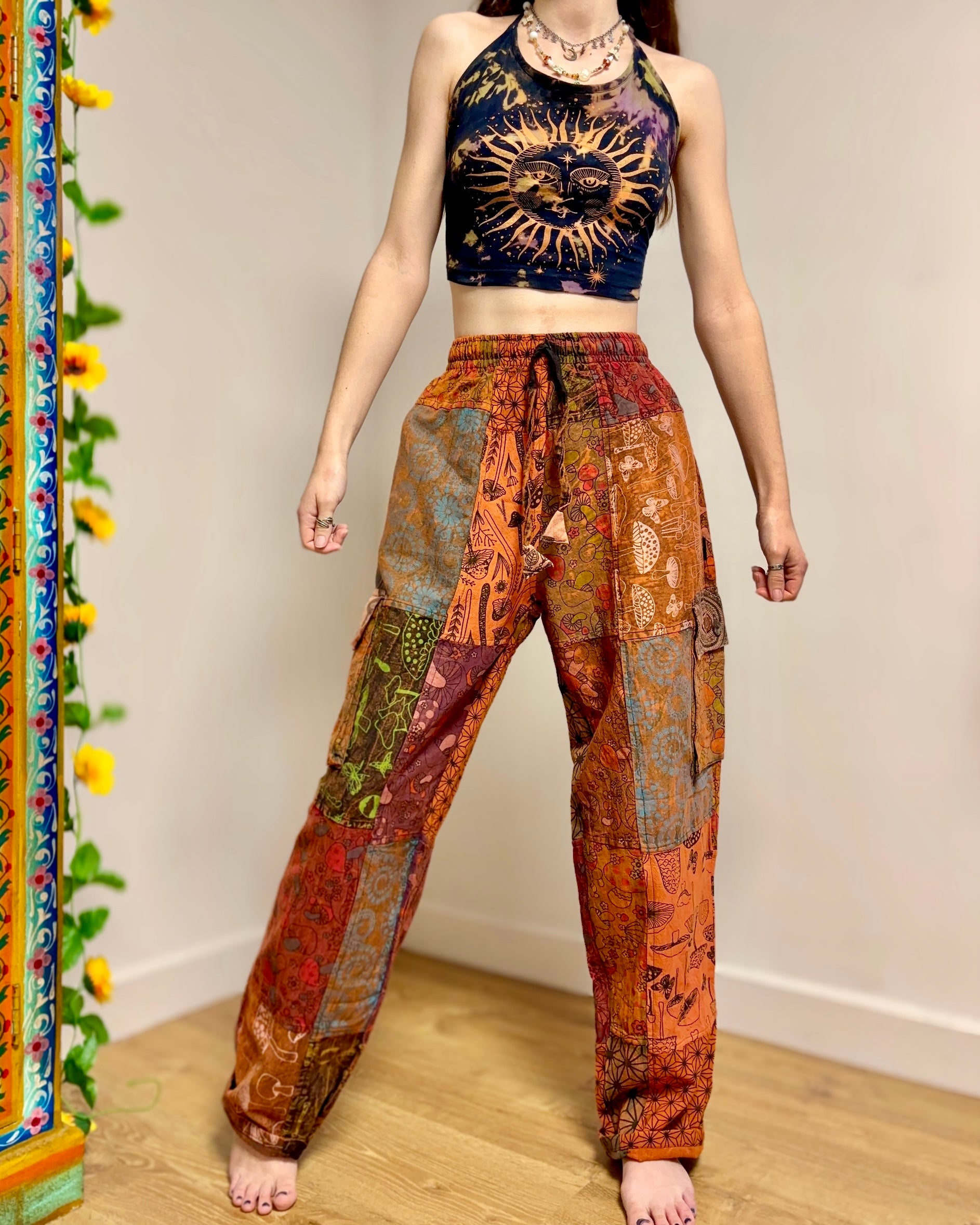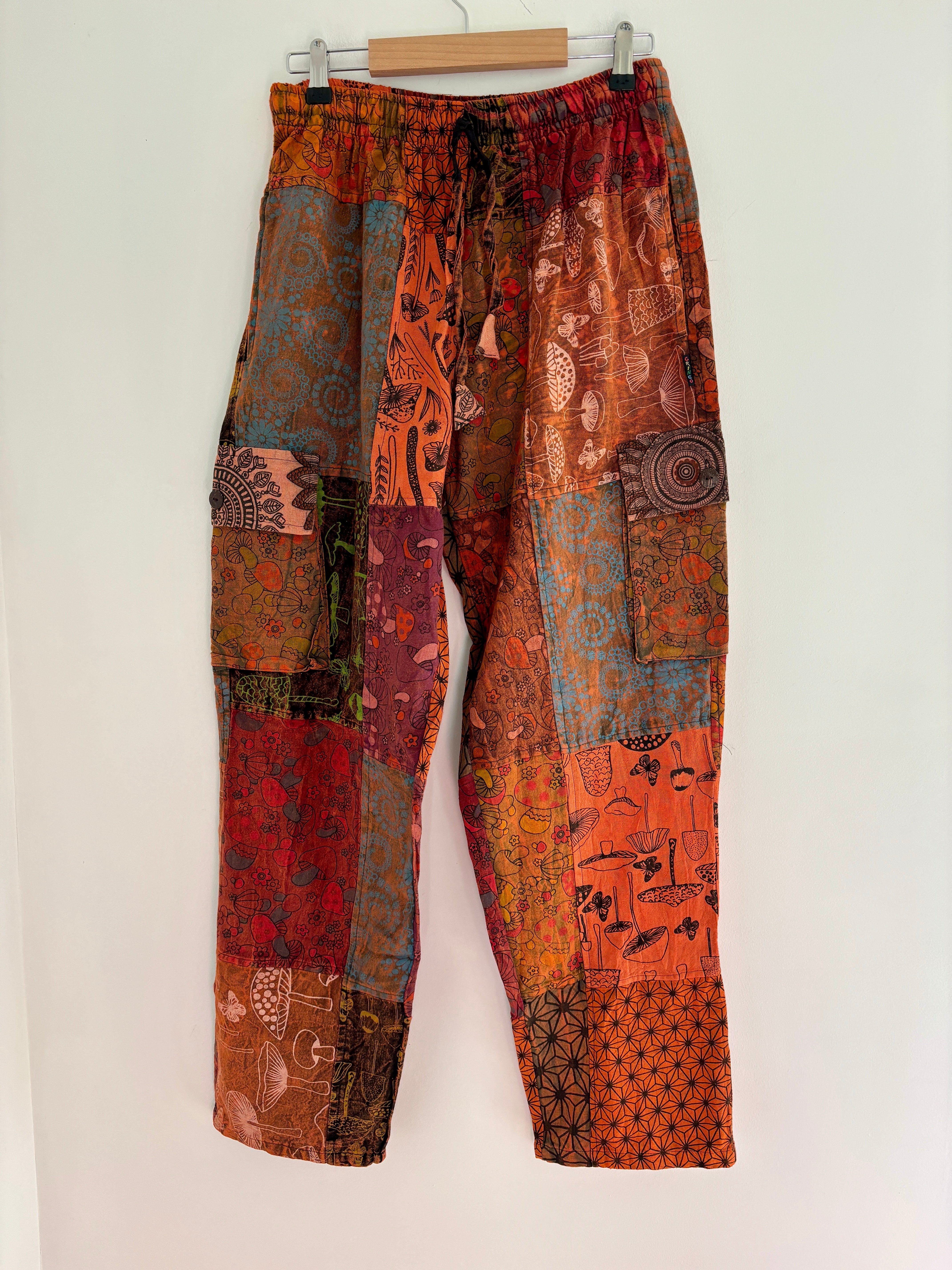 Orange patchwork trousers, featuring fabric decorated with mushroom and peace symbols in purple tones. Made from 100% cotton!