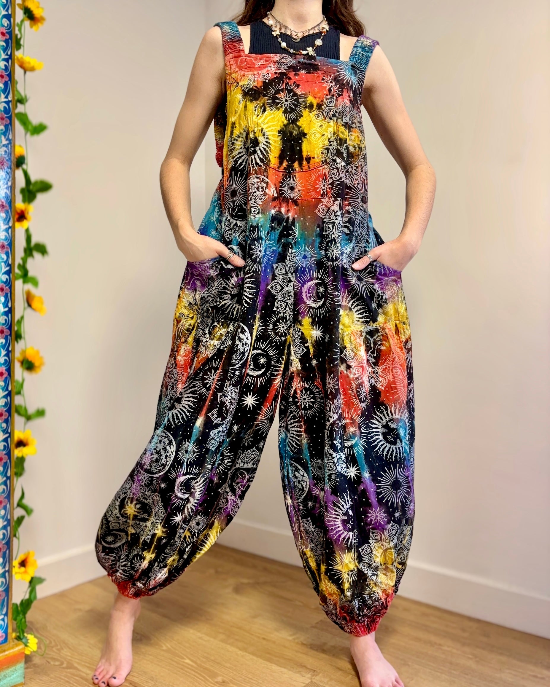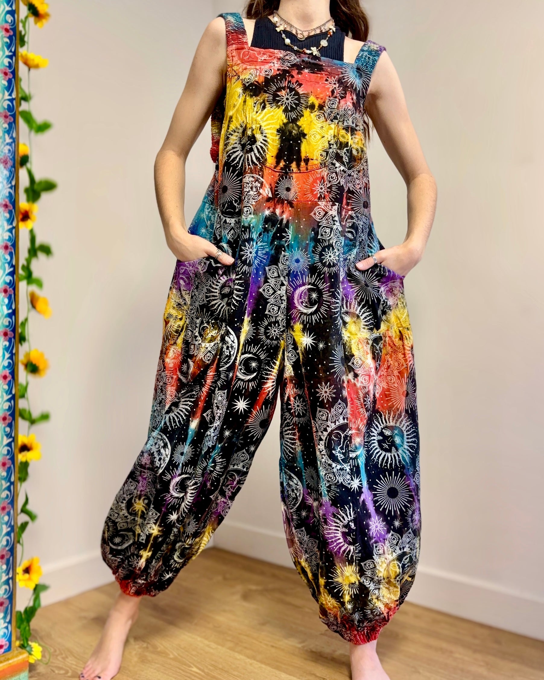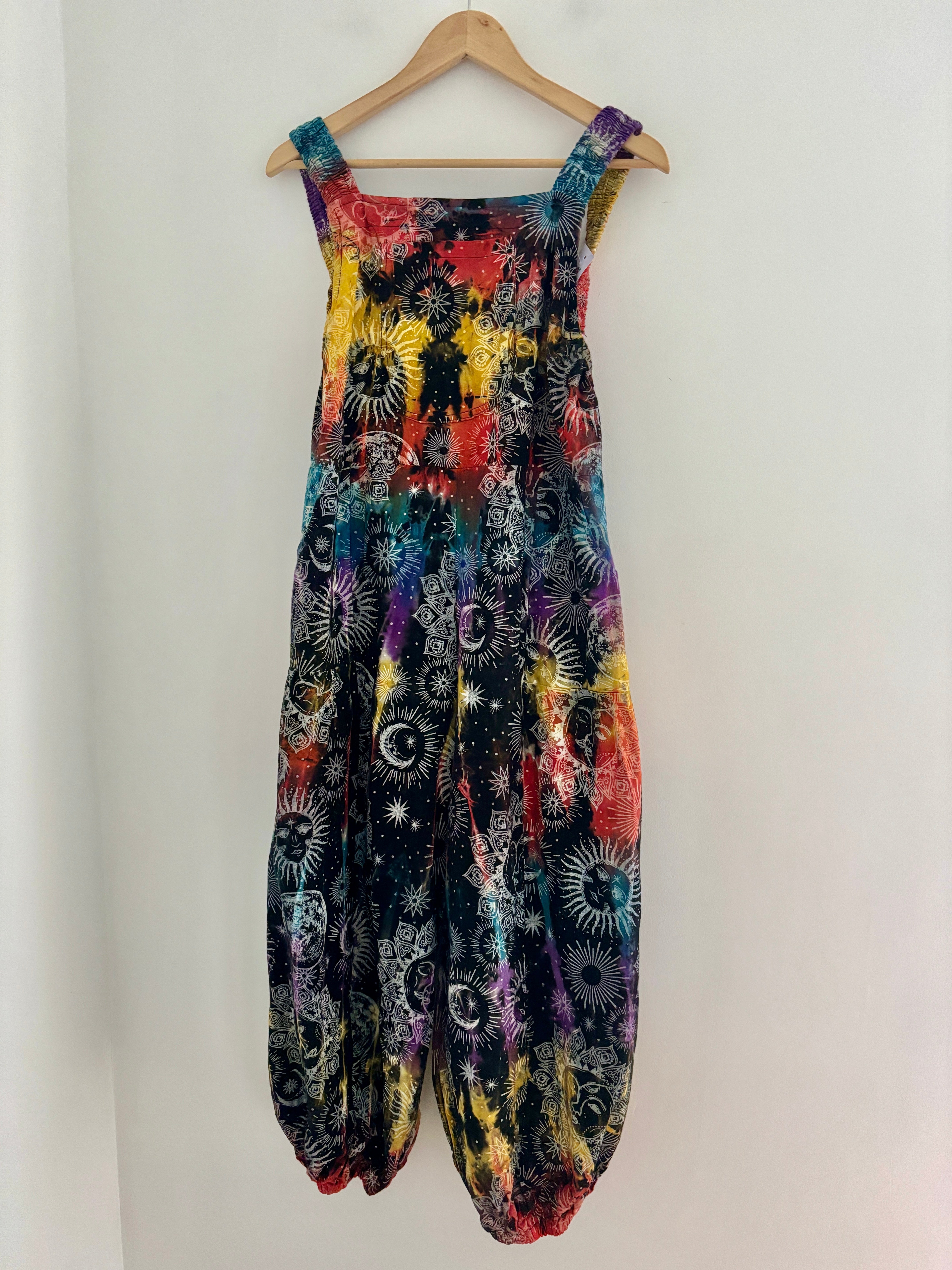 Peto/mono súper original confeccionado con tela morada teñida anudada. Confeccionada en 100% algodón, con tirantes ajustables y pantalón harén estilo afgani.