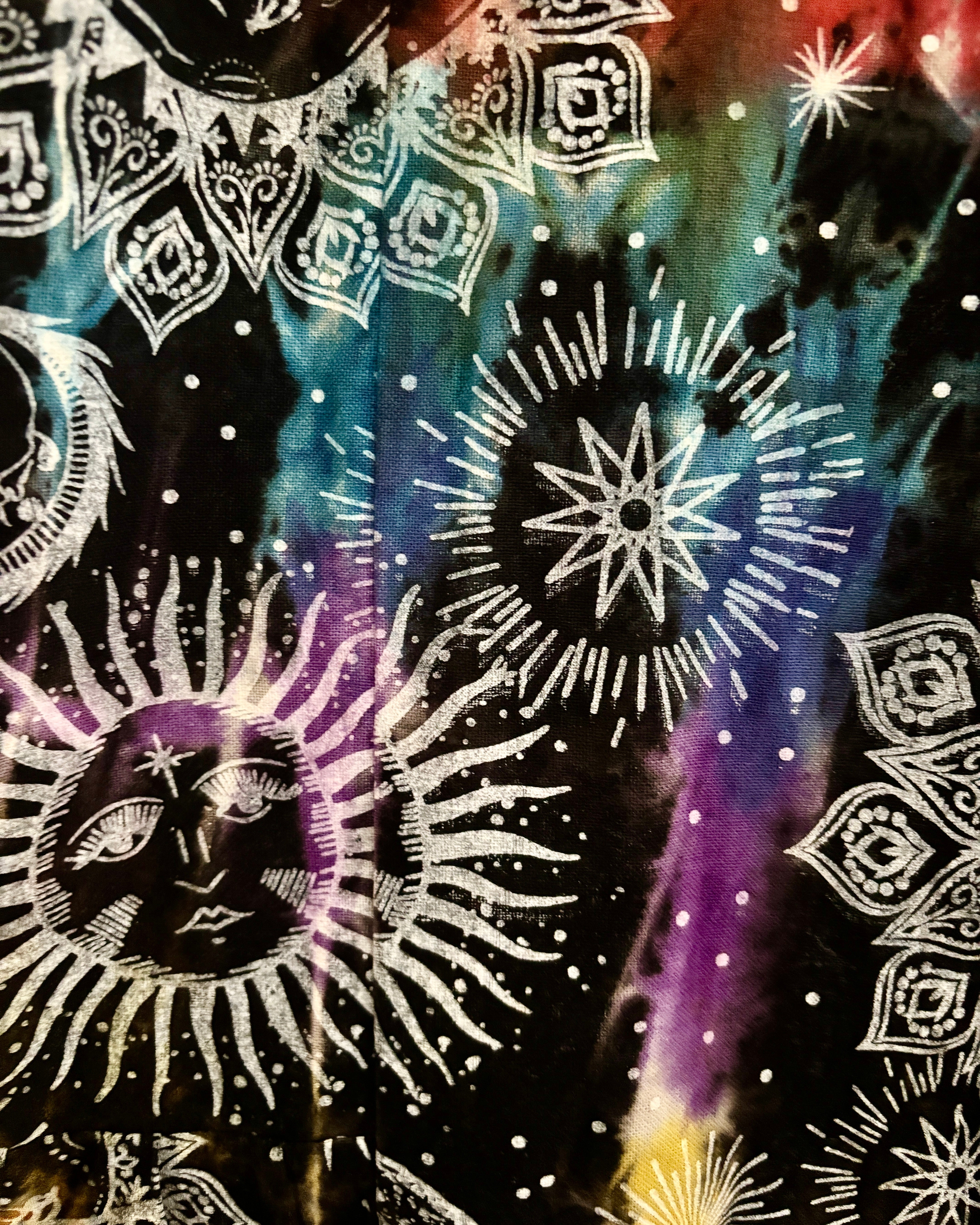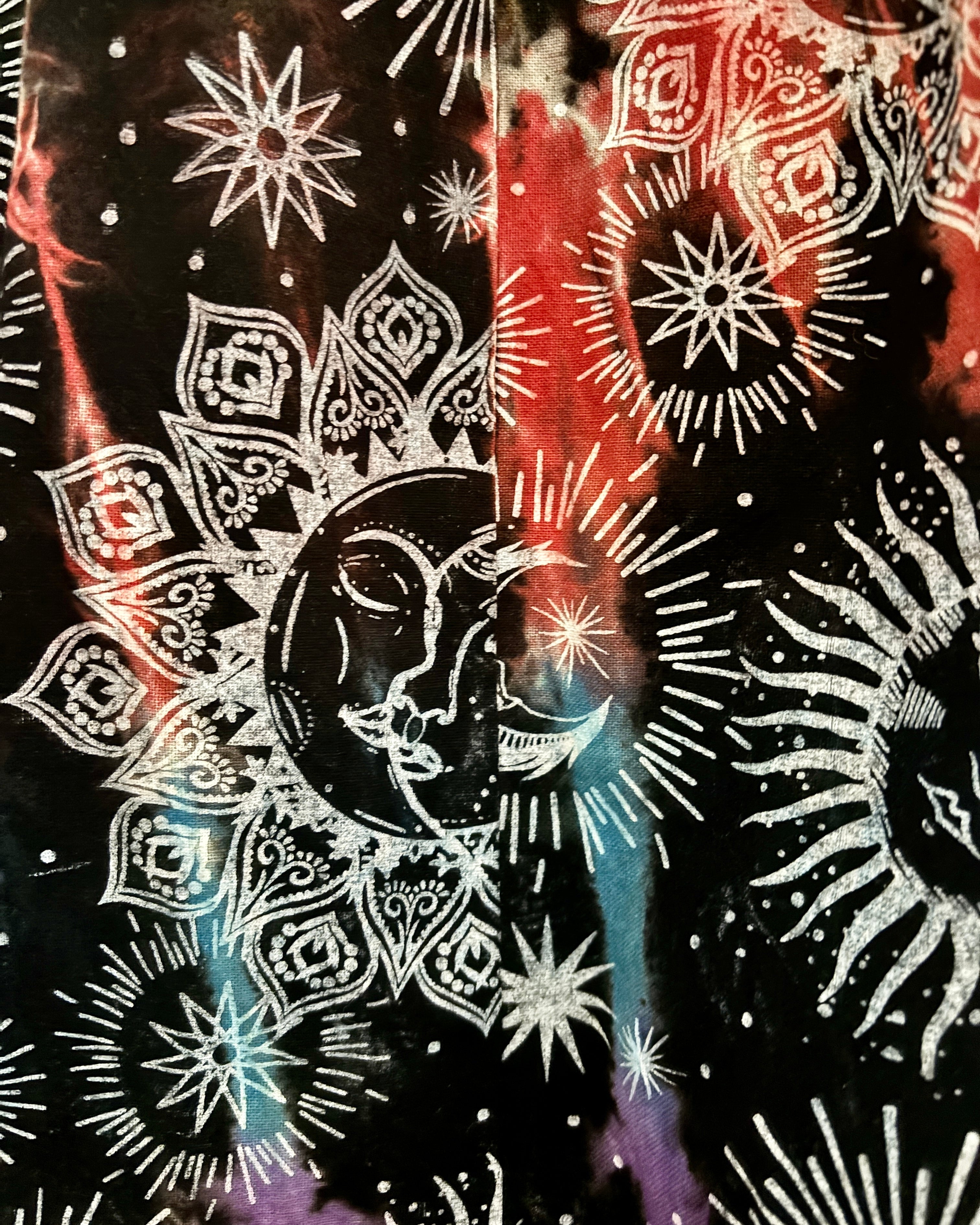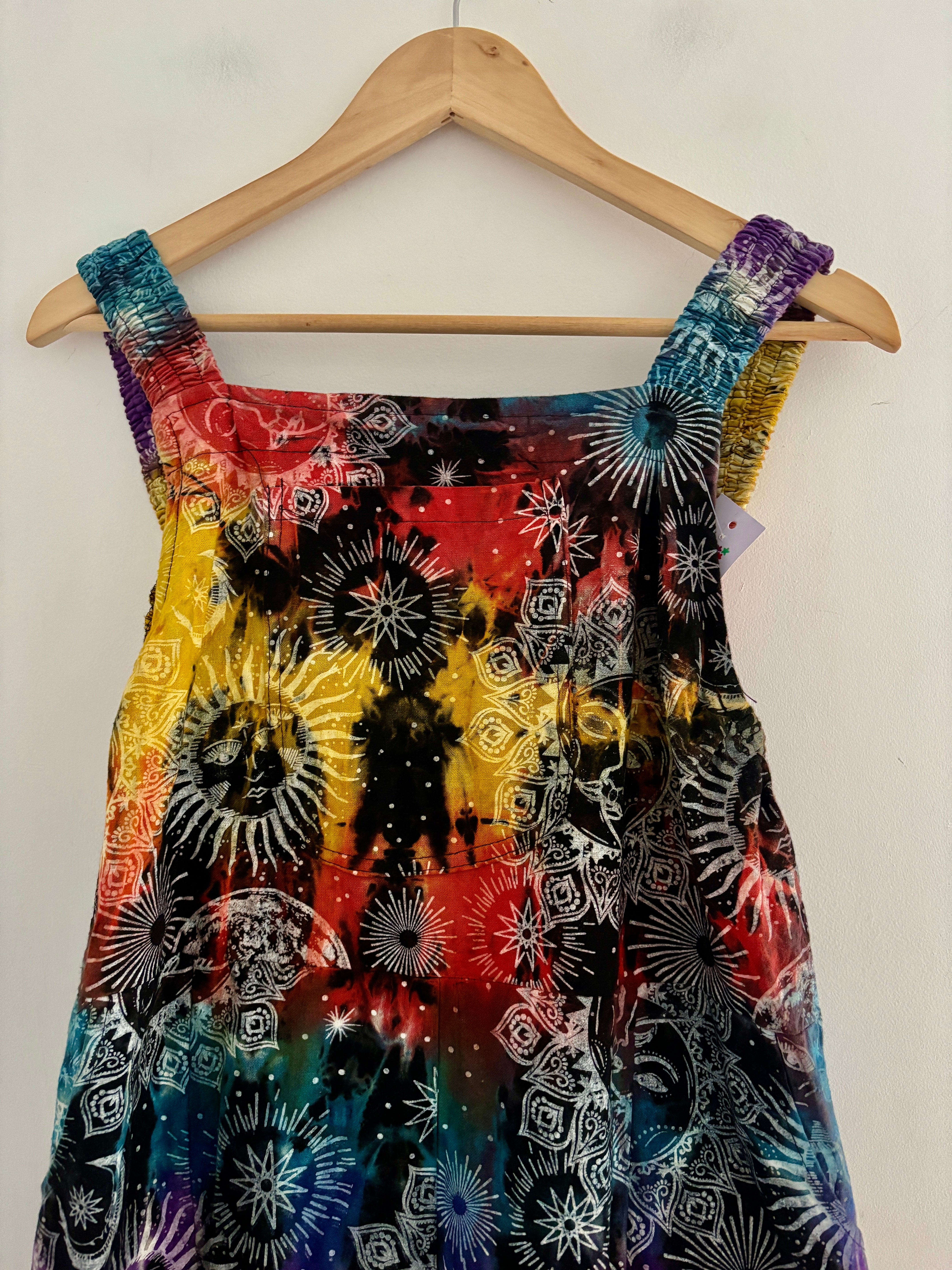 Peto/mono súper original confeccionado con tela morada teñida anudada. Confeccionada en 100% algodón, con tirantes ajustables y pantalón harén estilo afgani.