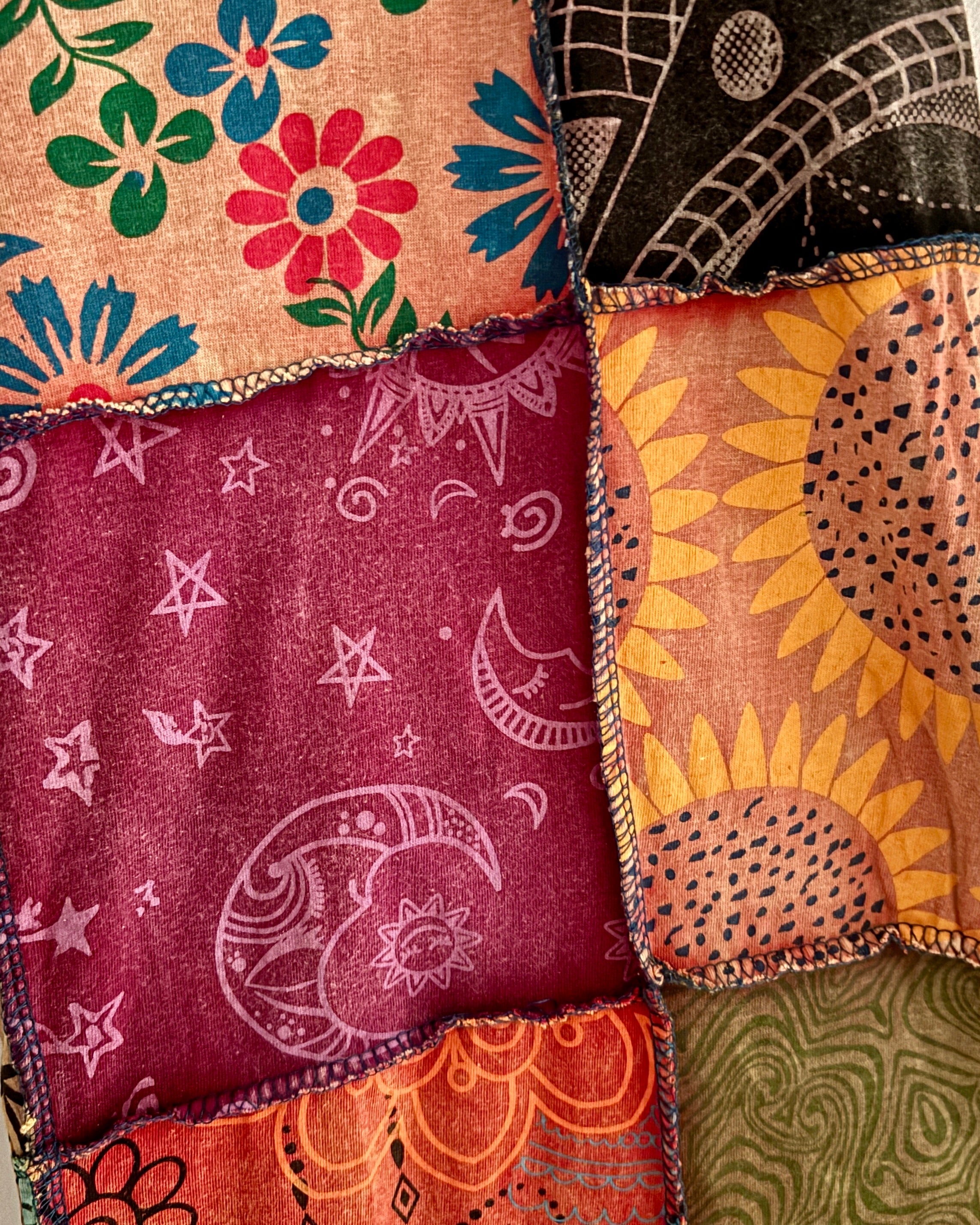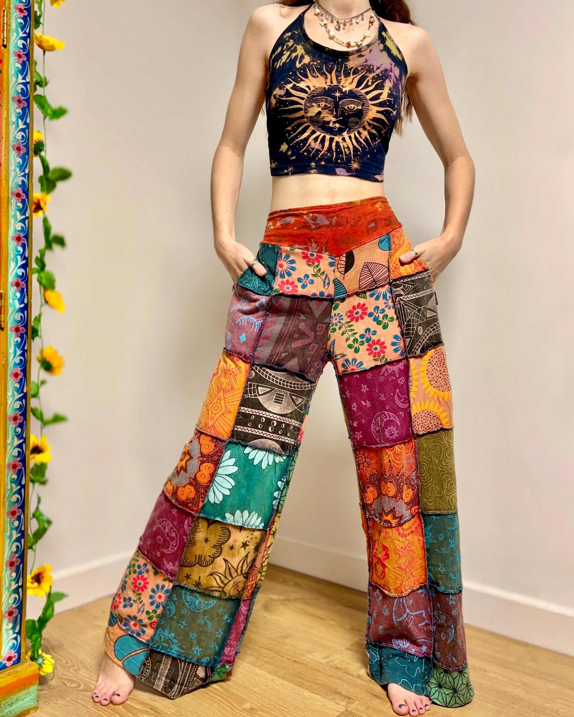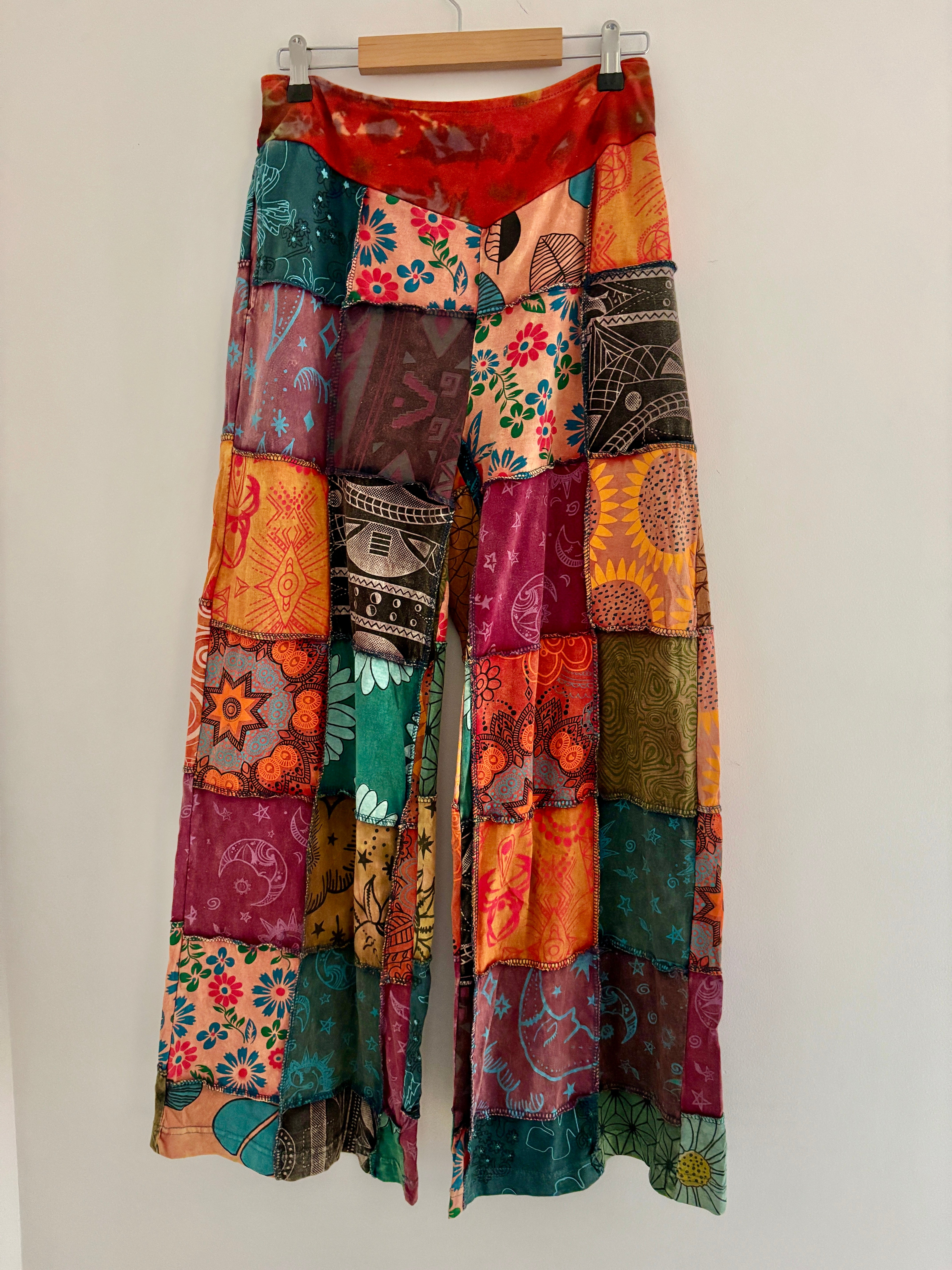 These new palazzo pants are made from patches of fabric in a range of funky patterns. They have an elasticated waist and two side pockets.