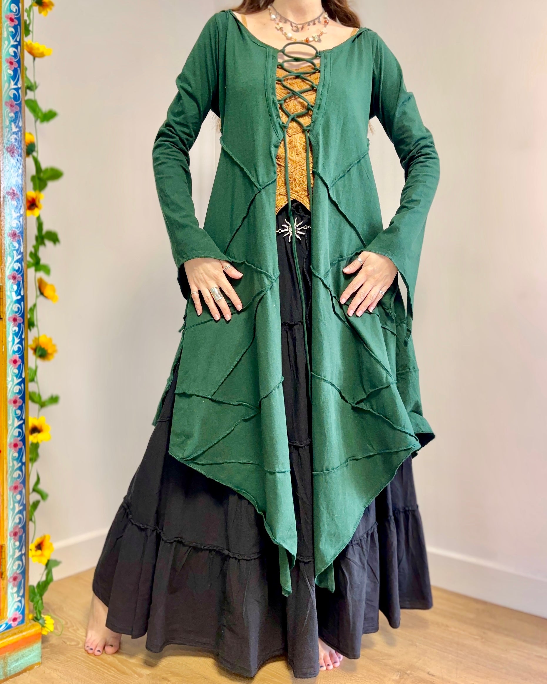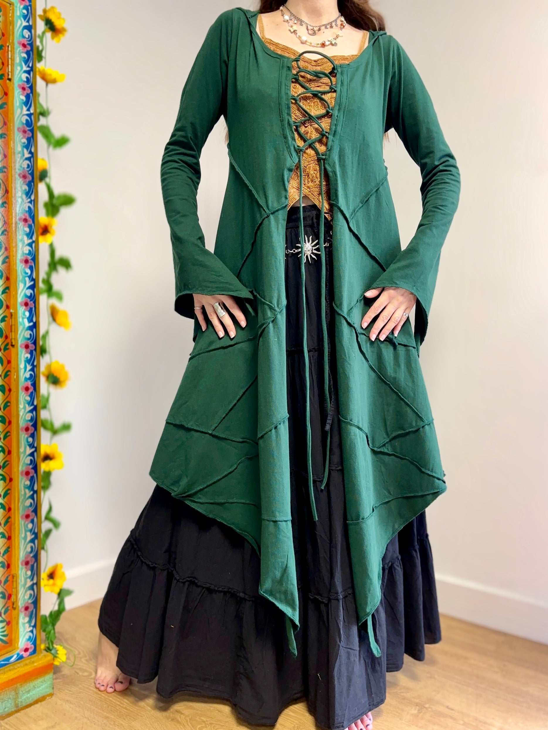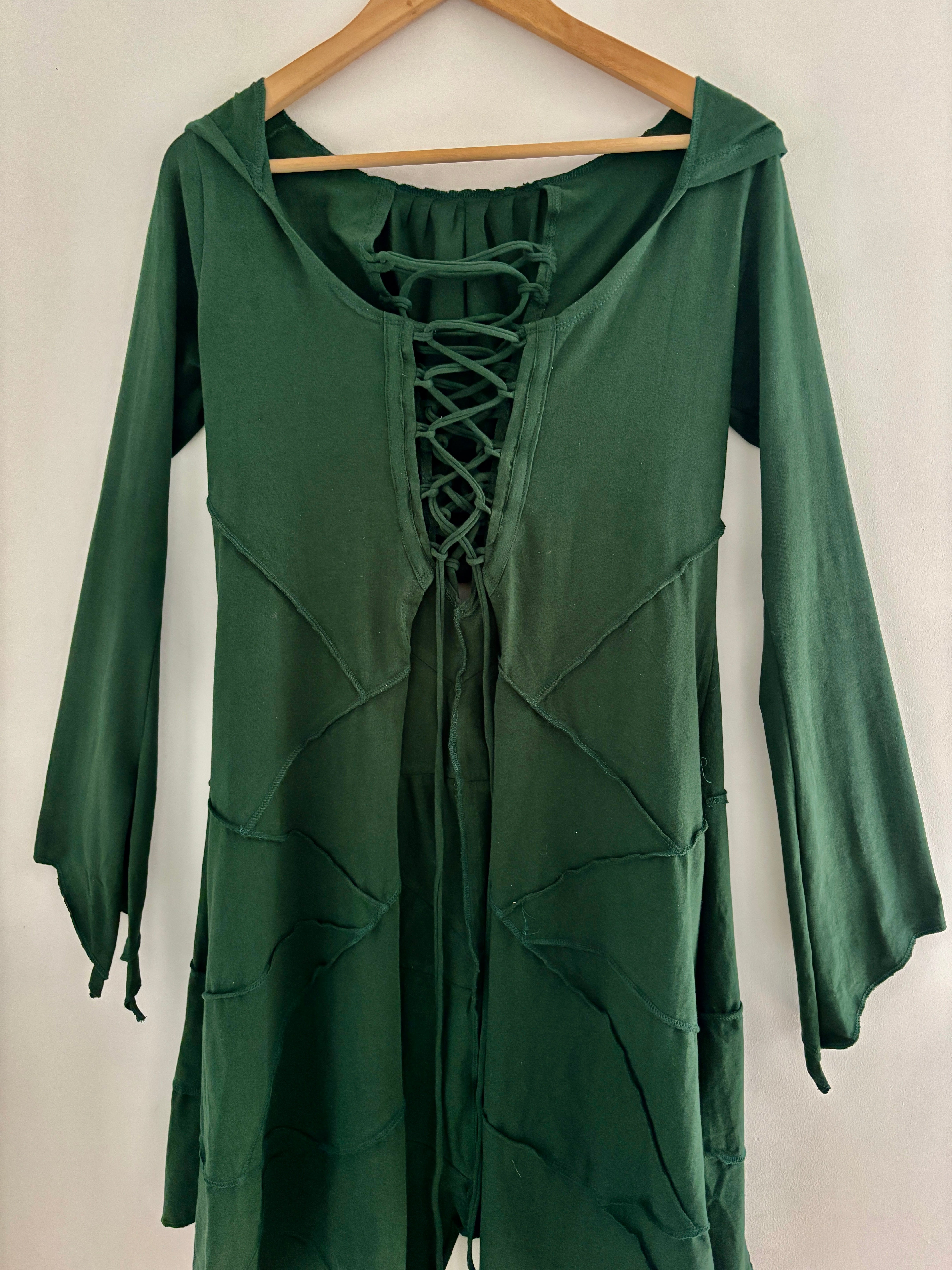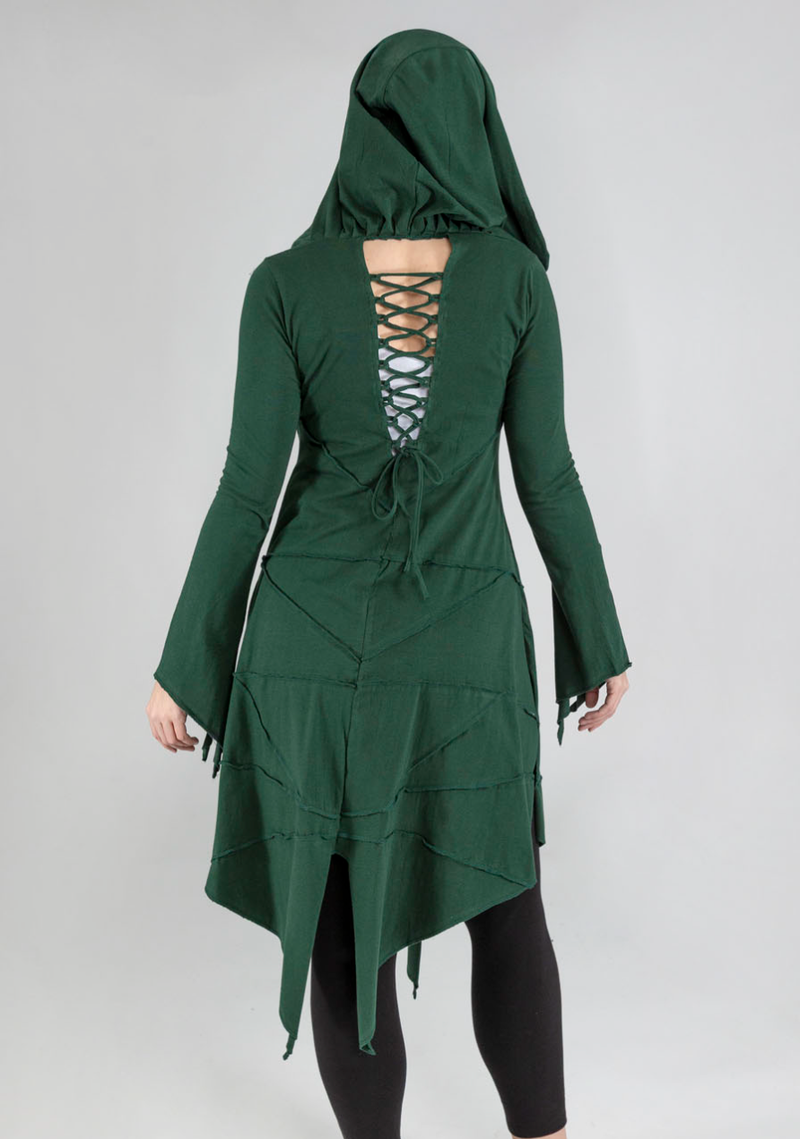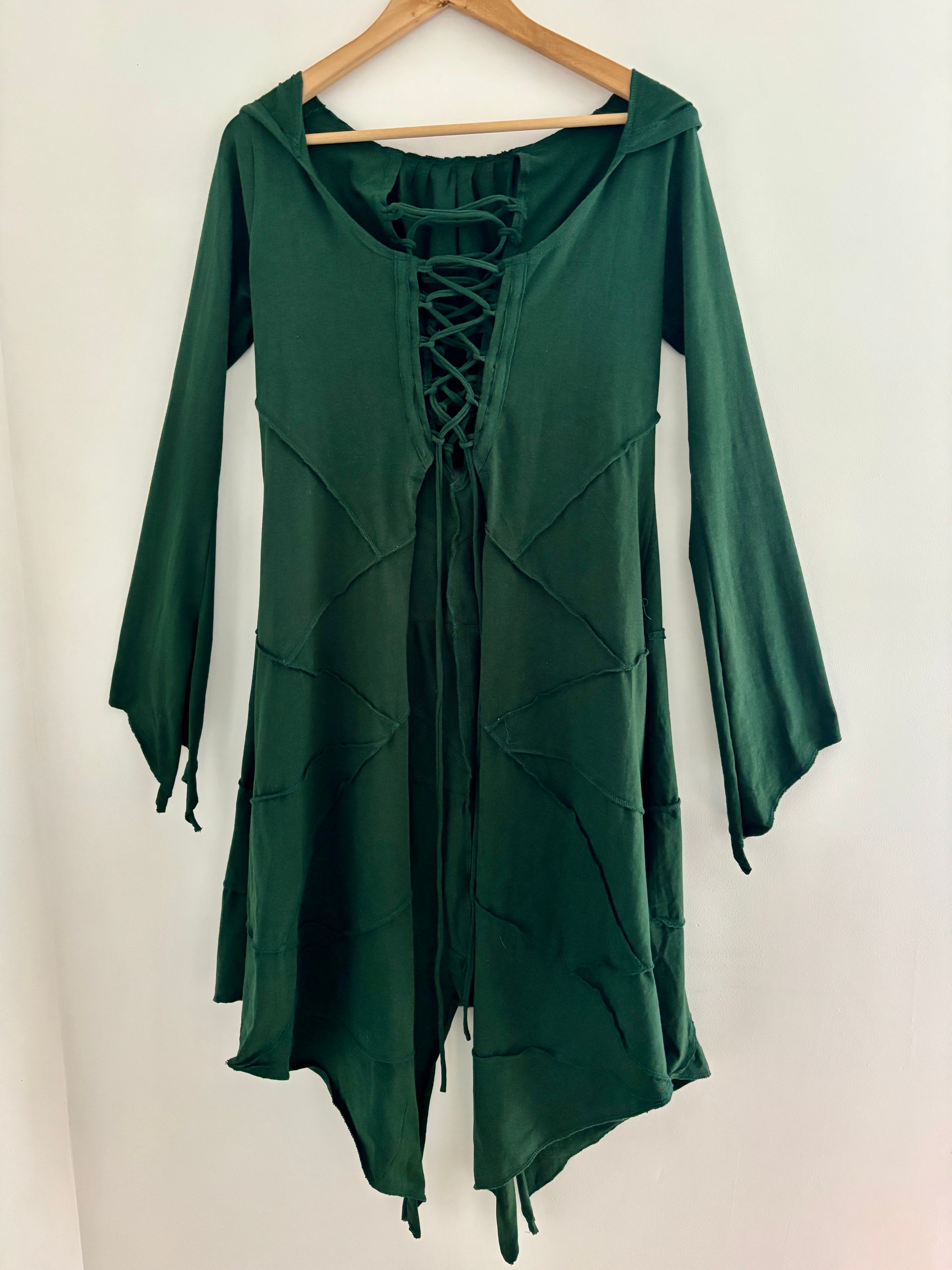 This beautiful fairy-style robe is made from soft, stretchy cotton fabric with a lace-up front and back for fully adjustable shaping. It has pixie-pointed tails for a magical, fairy-inspired look. With a hood making it perfect for festivals, everyday boho wear, alternative outfits and layering.