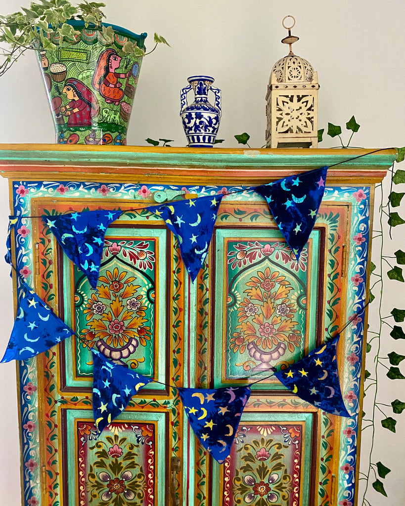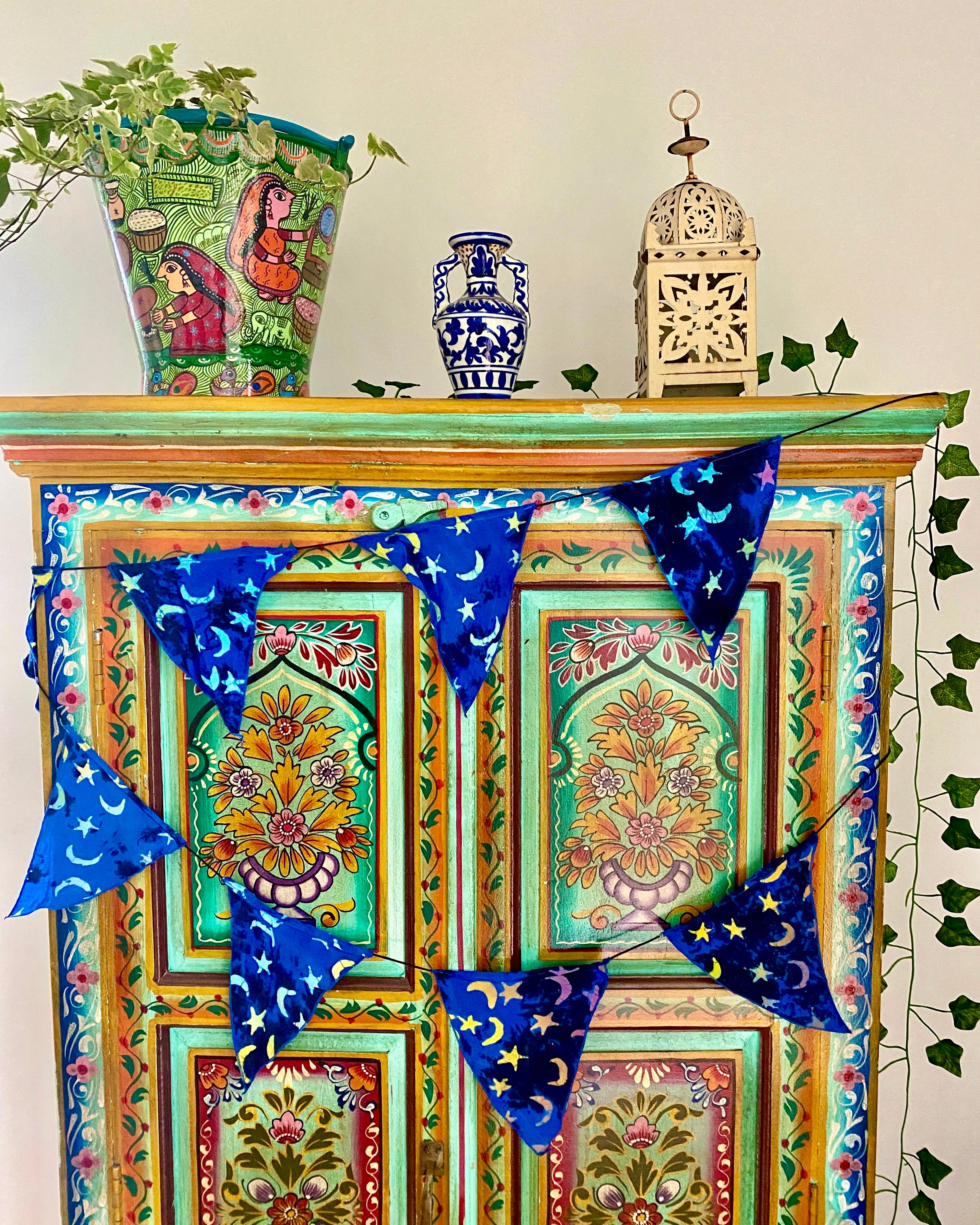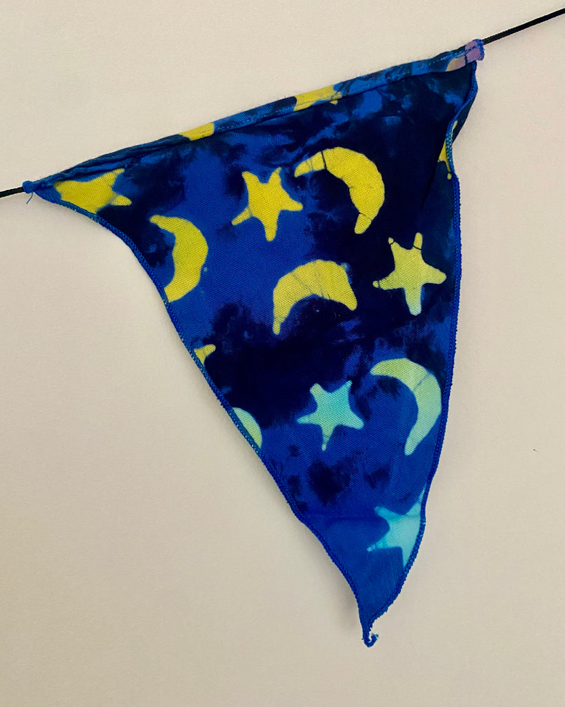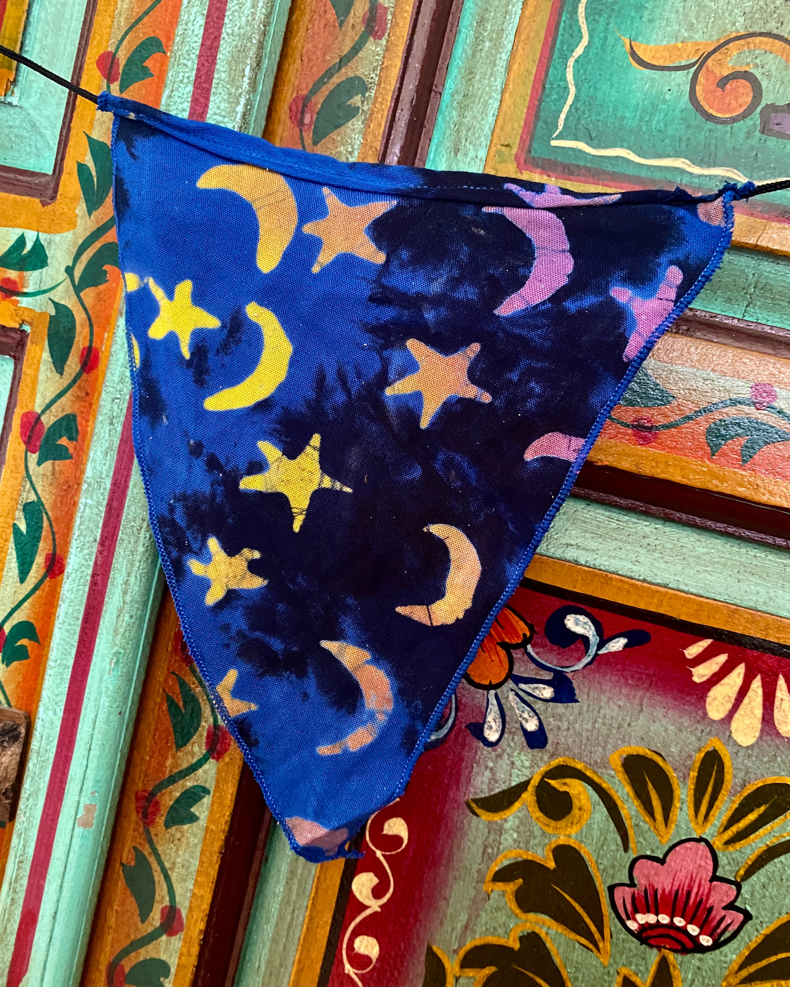 Este mágico banderín celestial está hecho de tela teñida con batik en un color azul intenso y decorado con lunas crecientes y estrellas. Mide 230 cm de largo y cuenta con 8 banderas que miden 18 x 14 cm.