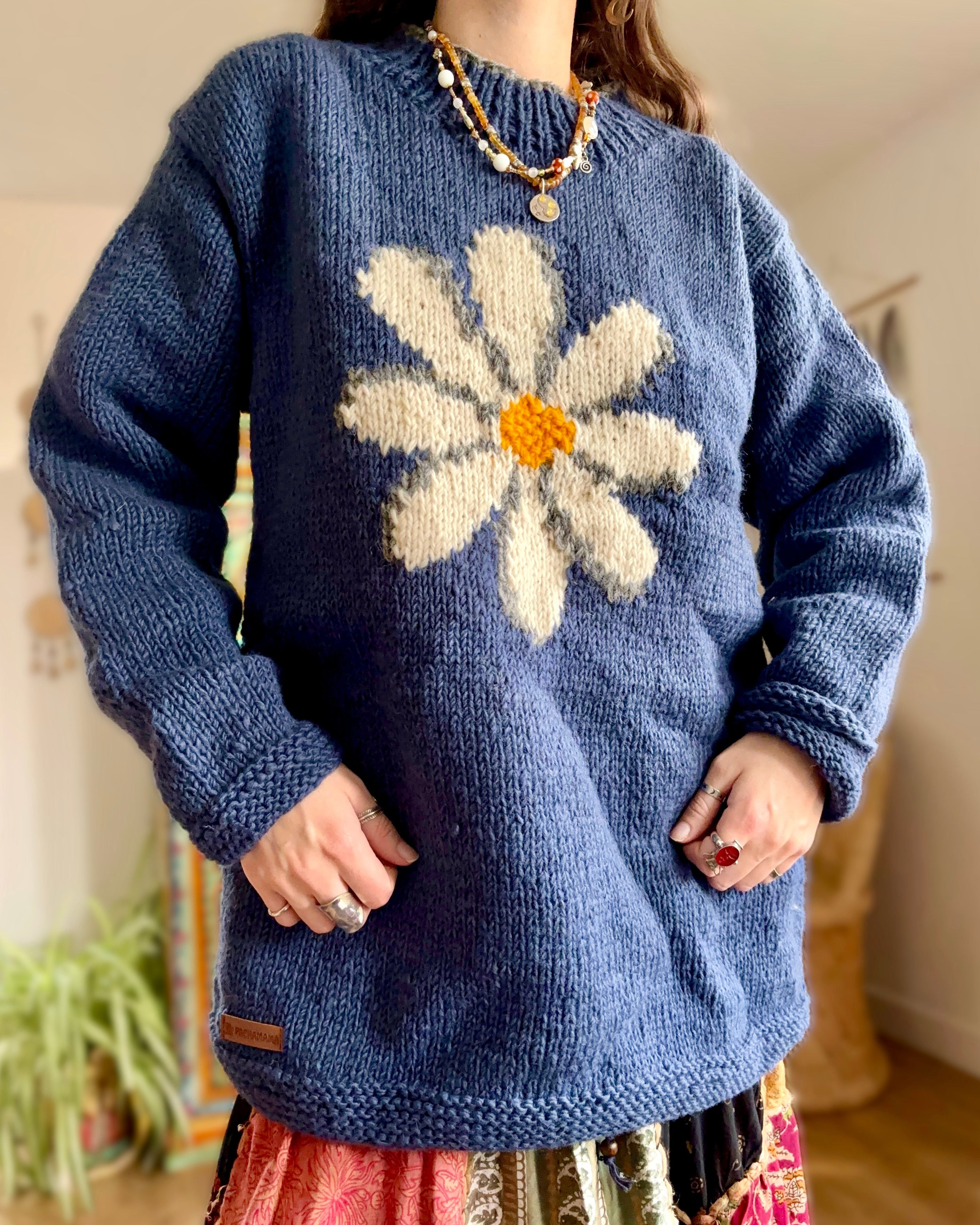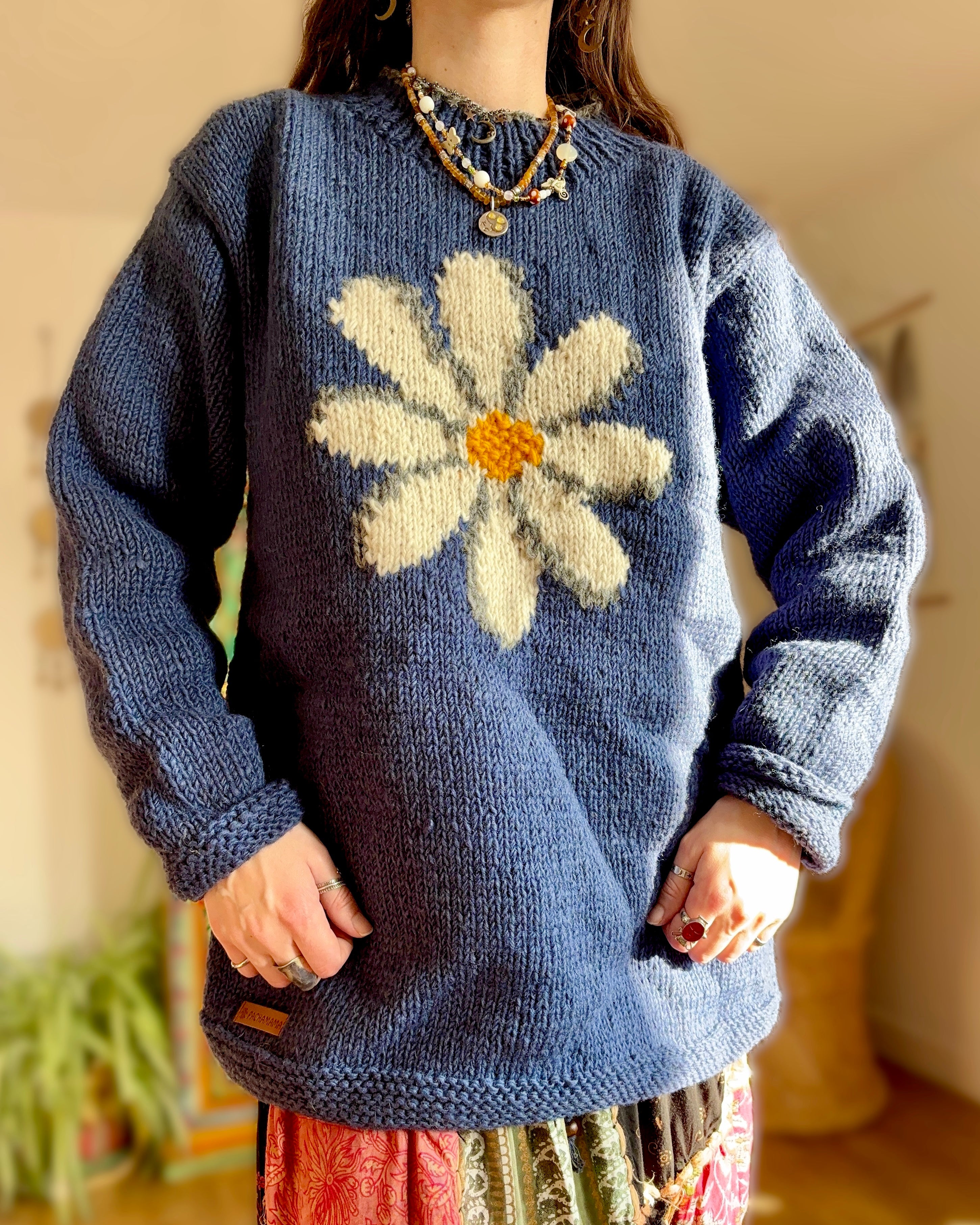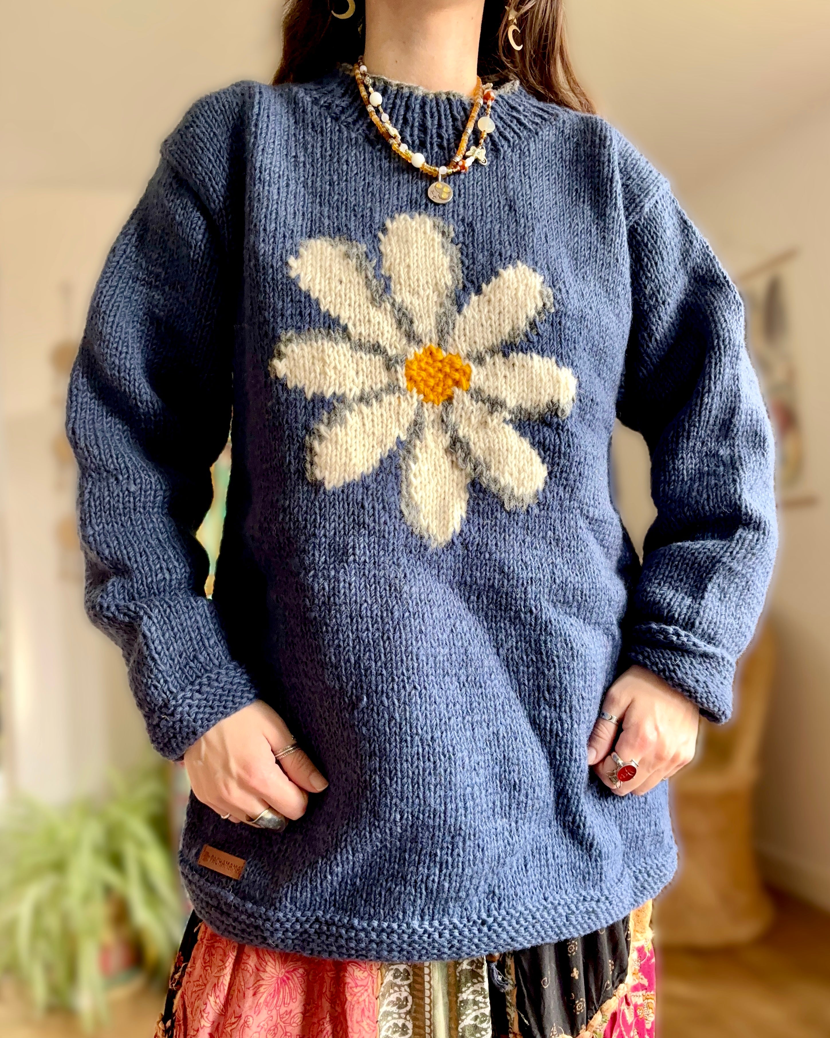 This magical Pachamama oversized jumper is hand-knitted by talented artisans Nepal. It is made from 100% wool. Large daisy design with moss stitch middle, large petals and grey shading.