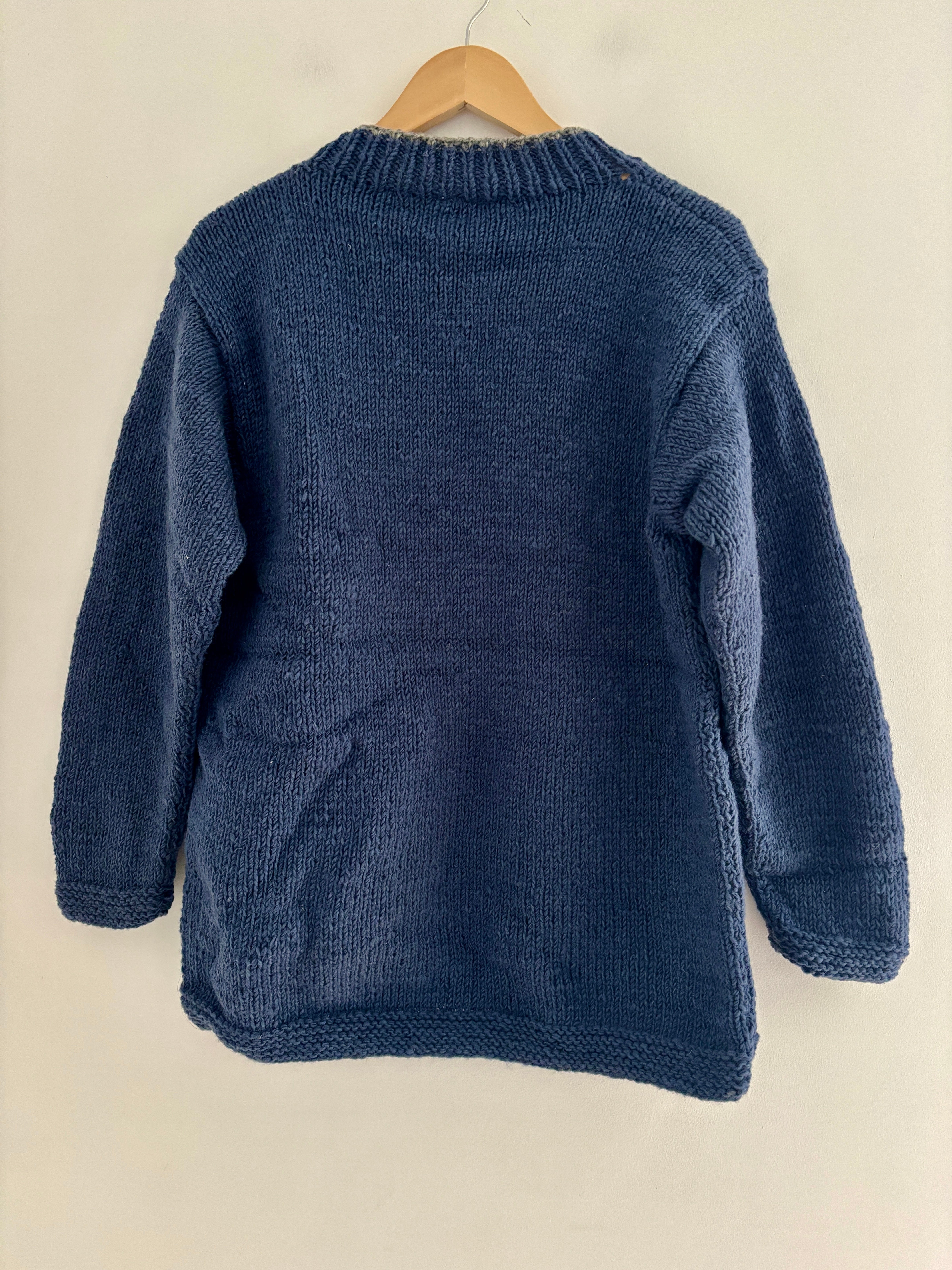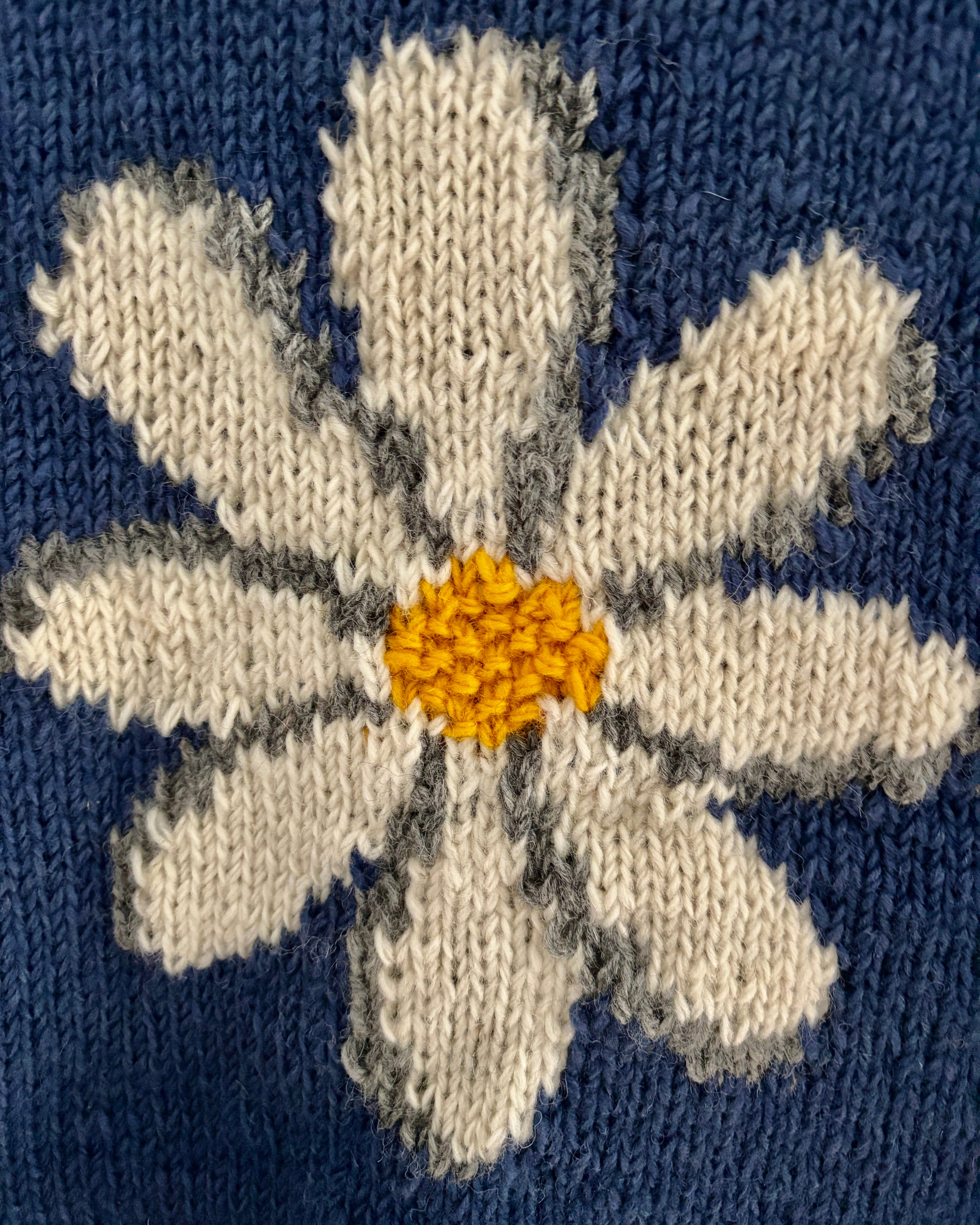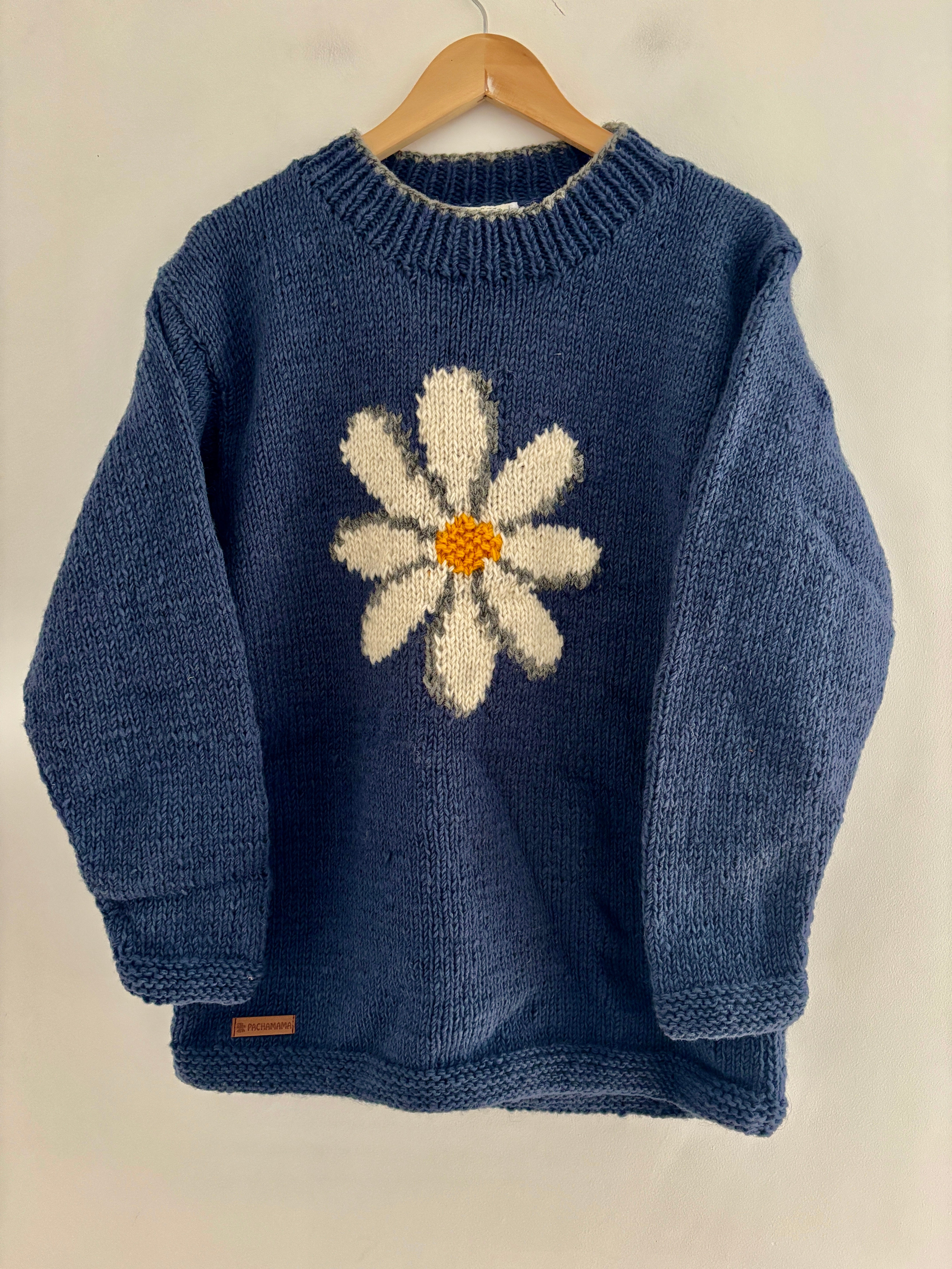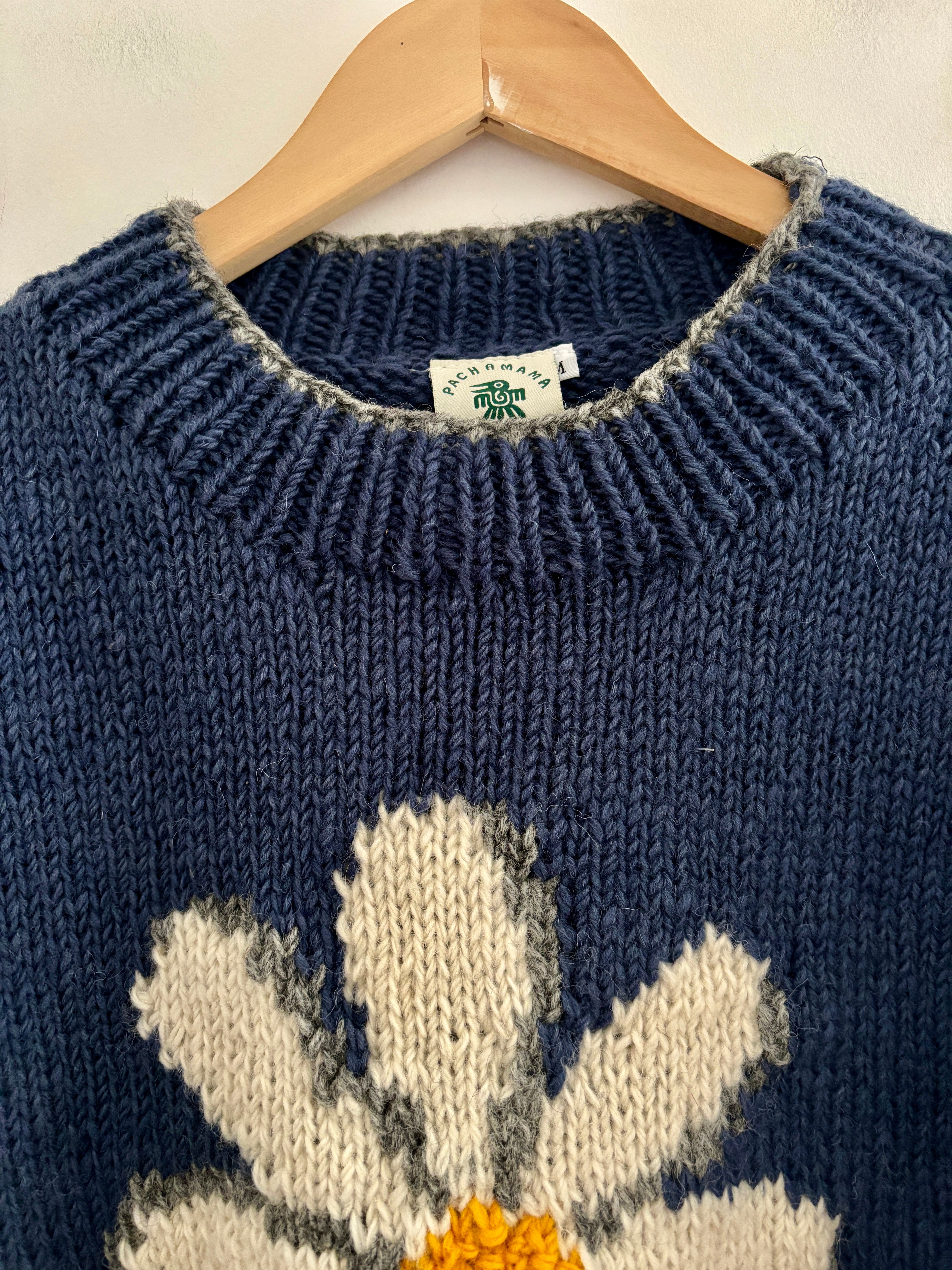 This magical Pachamama oversized jumper is hand-knitted by talented artisans Nepal. It is made from 100% wool. Large daisy design with moss stitch middle, large petals and grey shading.