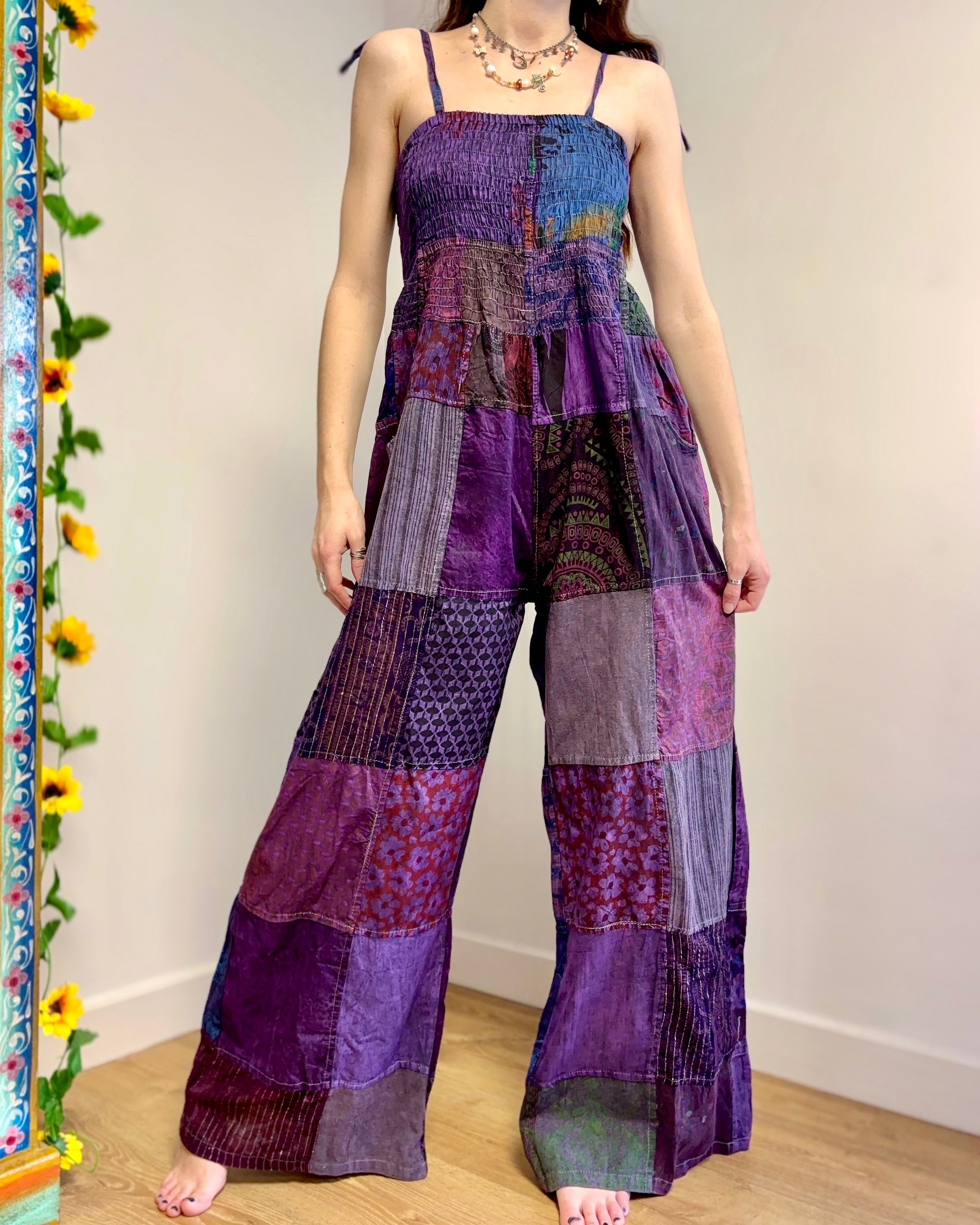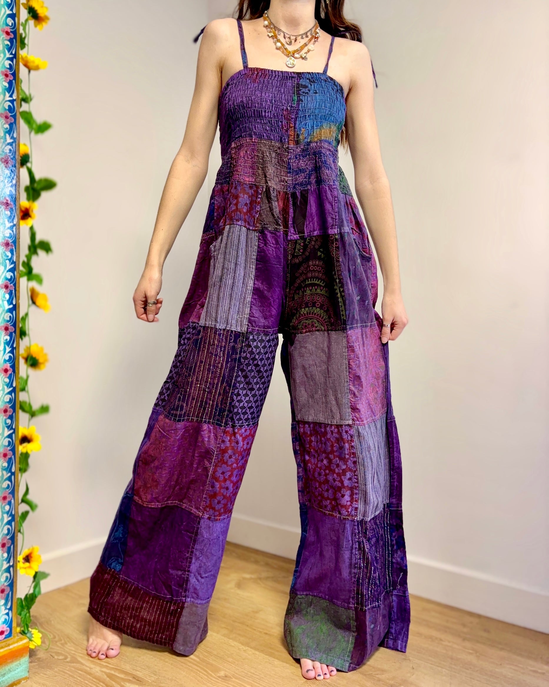 These jumpsuits are made from beautiful 100% cotton patchwork fabric. It has straight legs and adjustable straps.