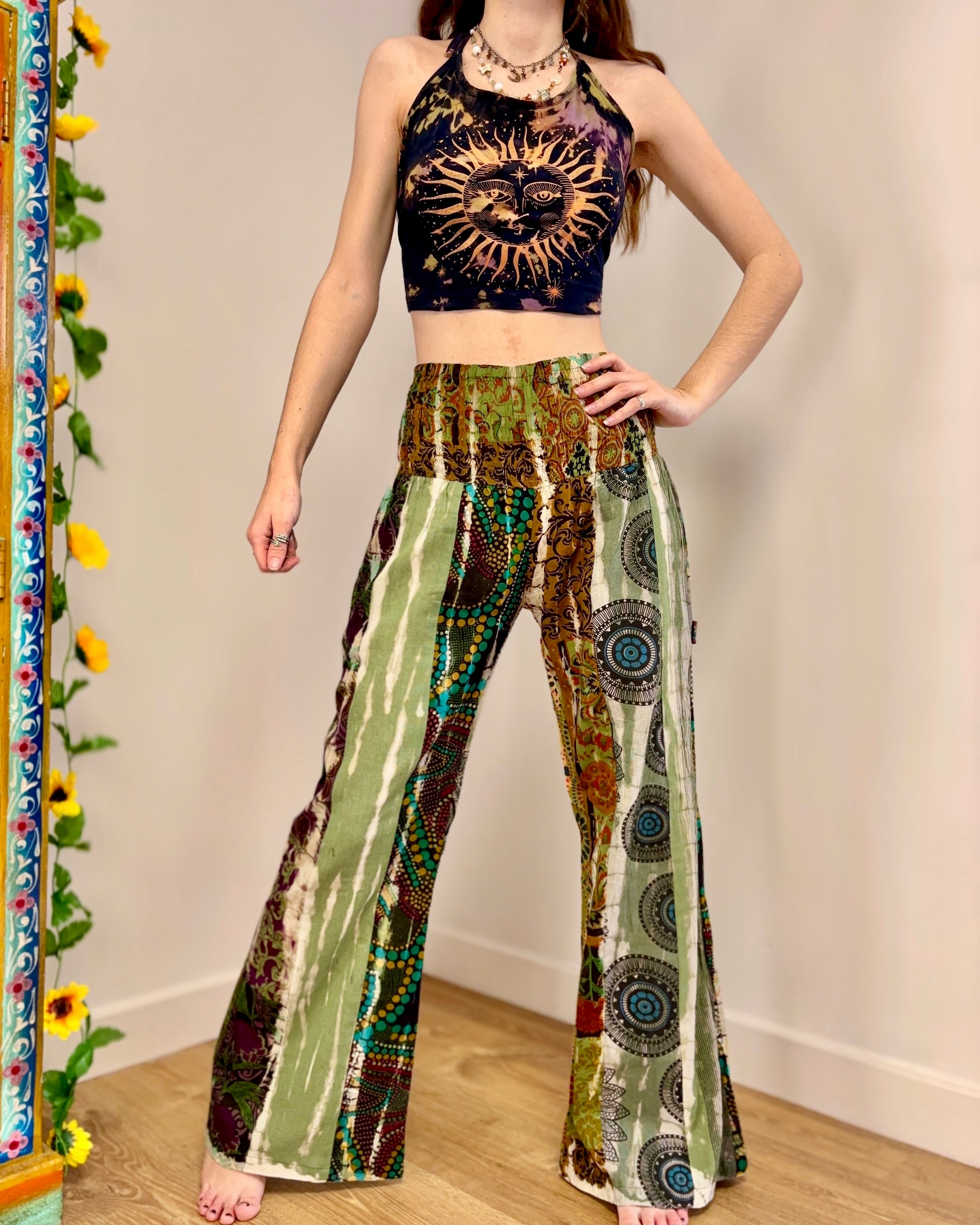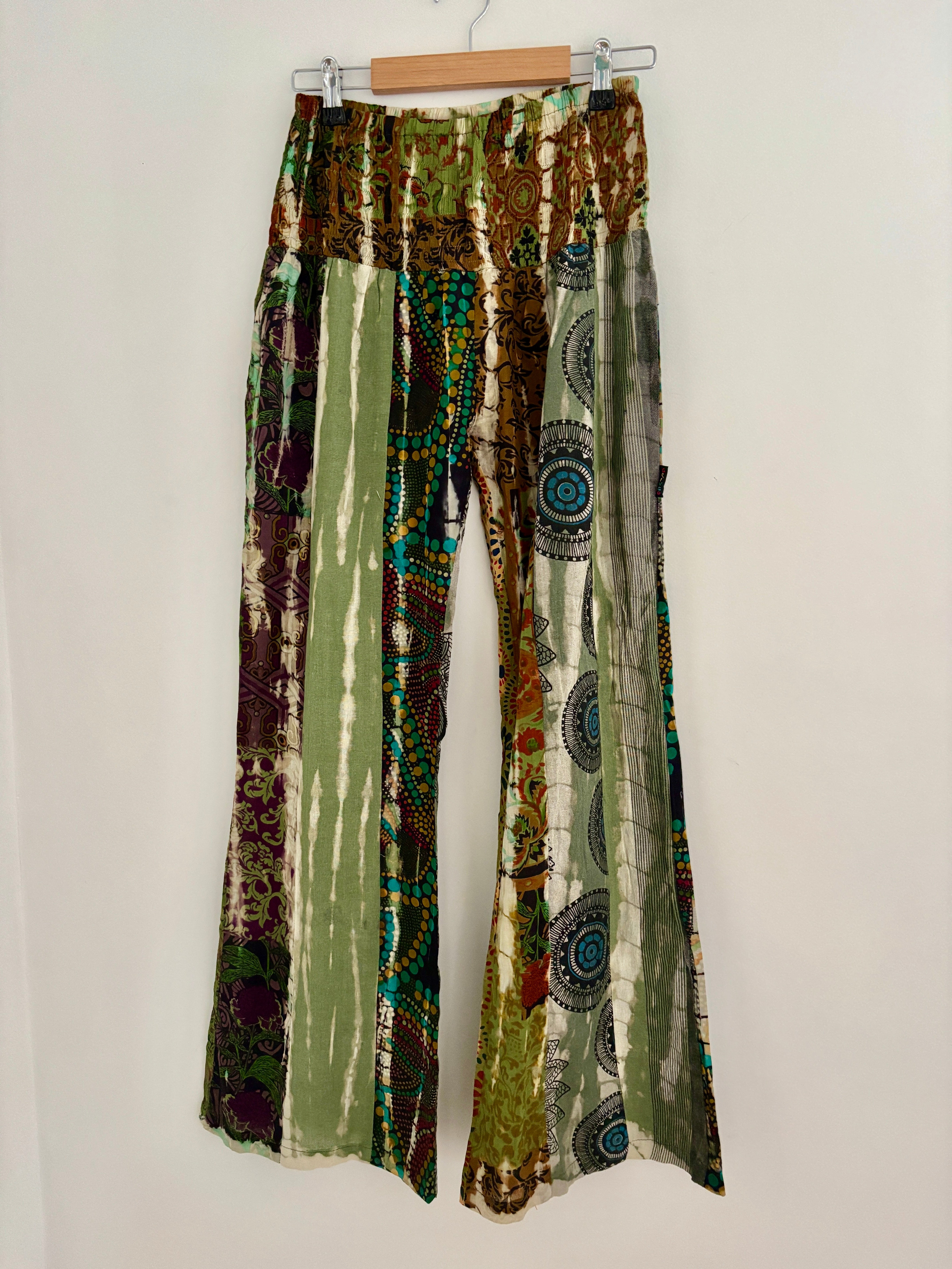 These magical trousers are made from patches of earthy green fabric, with an elastic waist at the back and flared at the bottom.