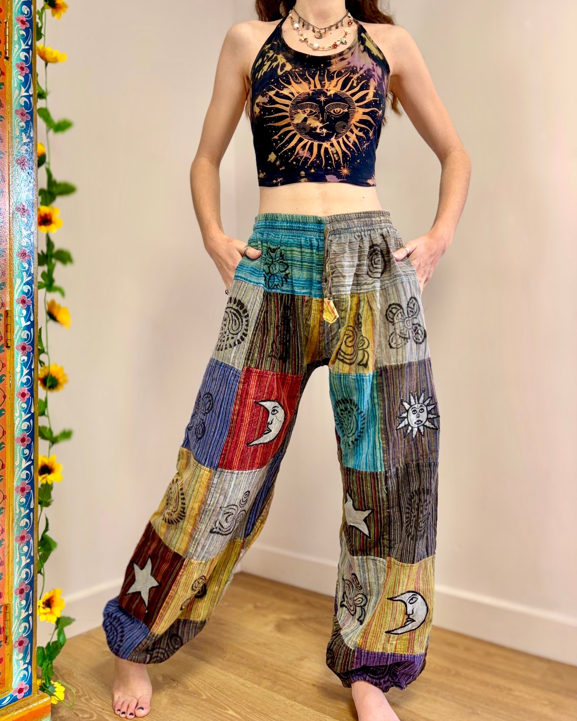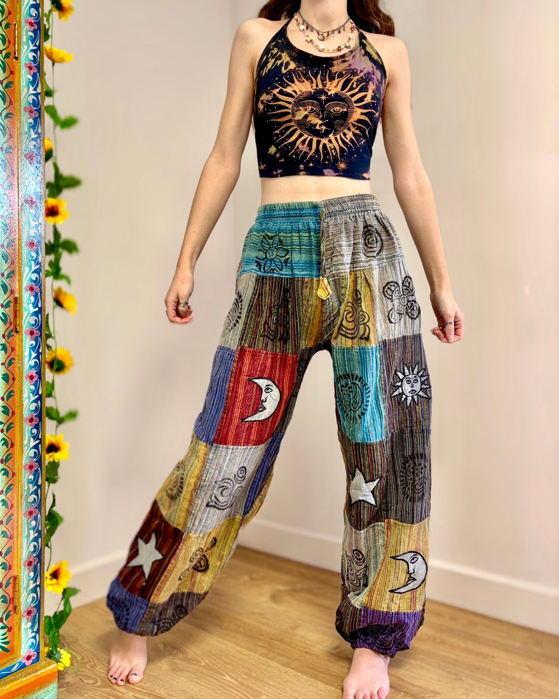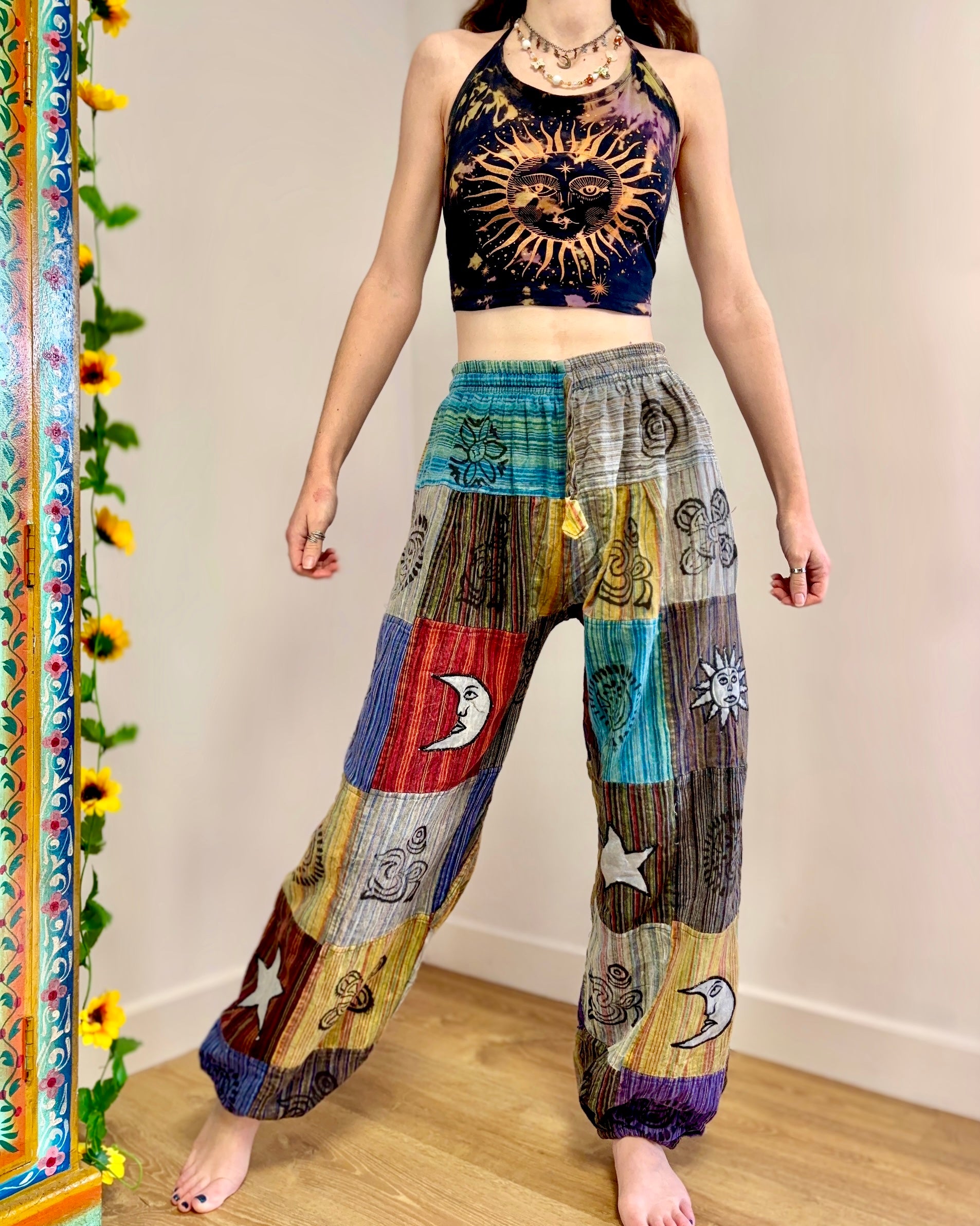 Estos mágicos Harems Celestiales están hechos de tela 100% algodón decorada con soles, lunas y estrellas, y están disponibles en 2 colores. Tienen cintura elástica y 2 bolsillos delanteros.