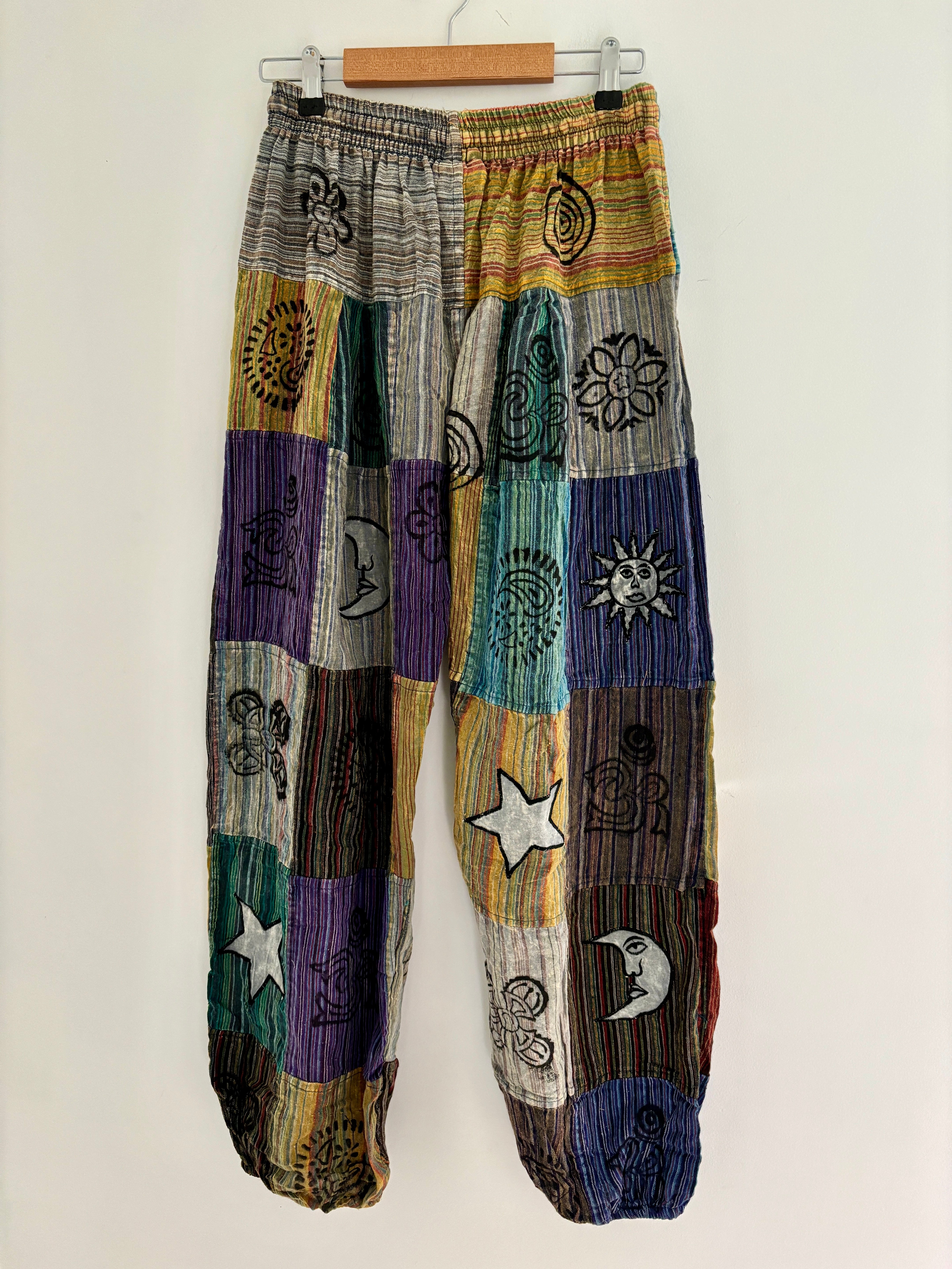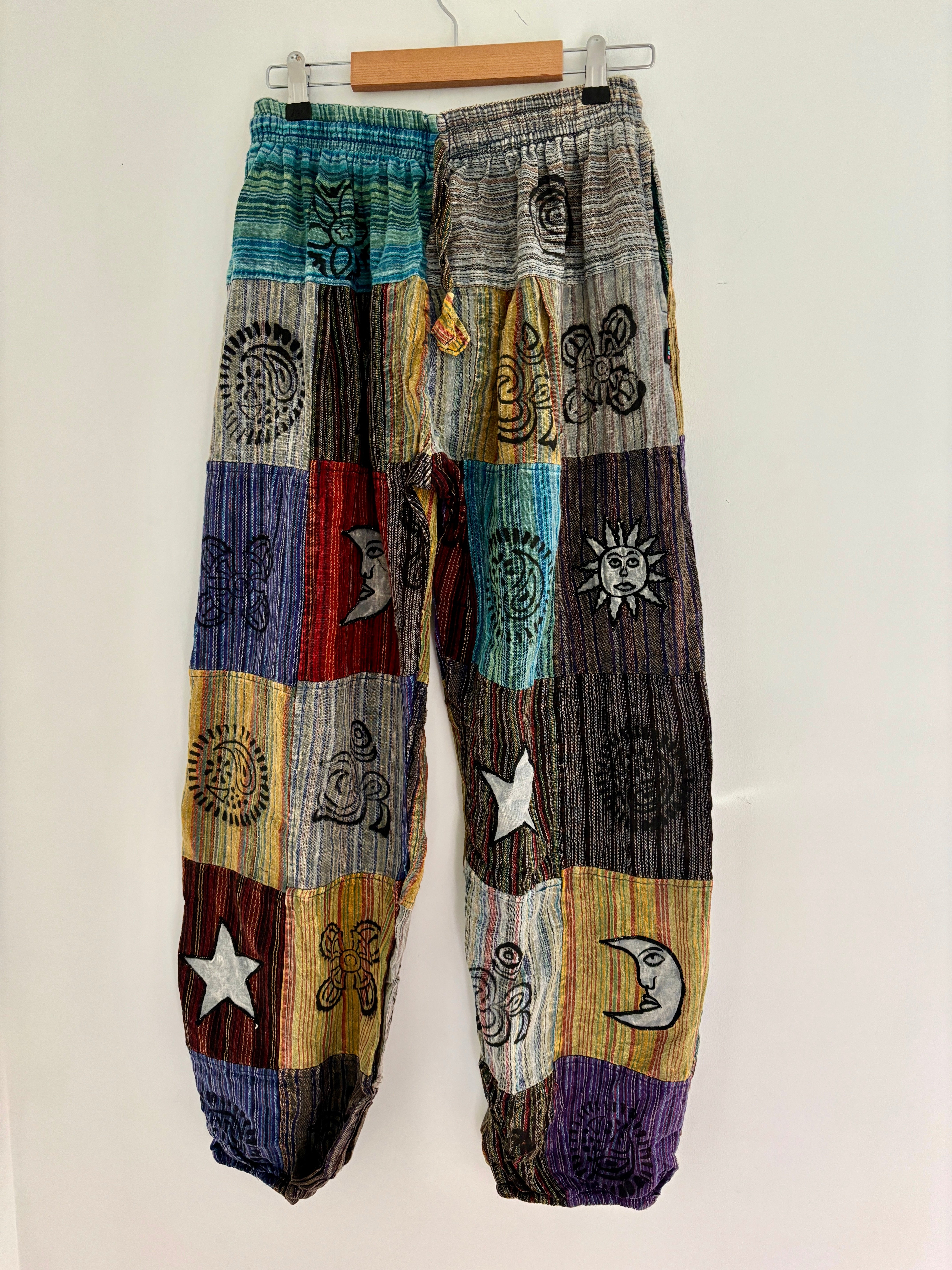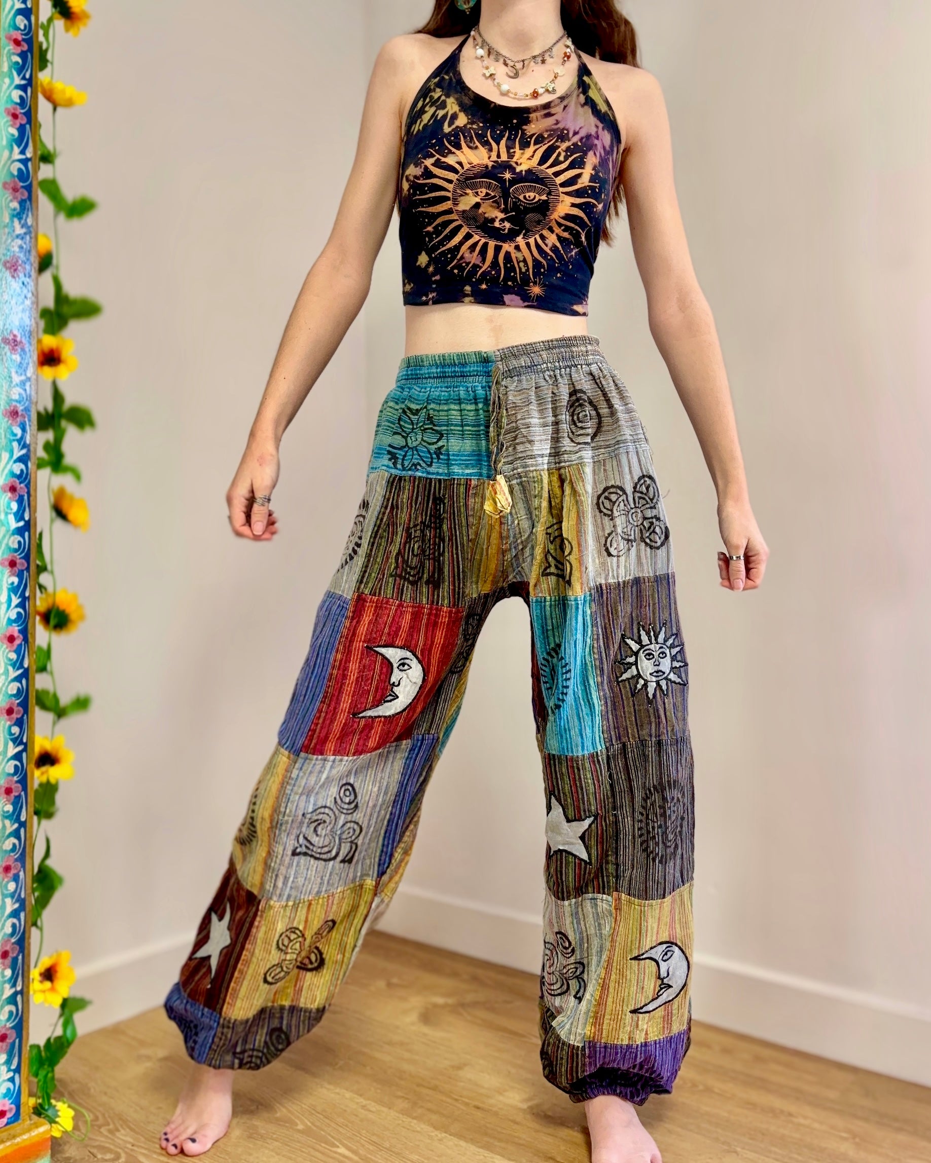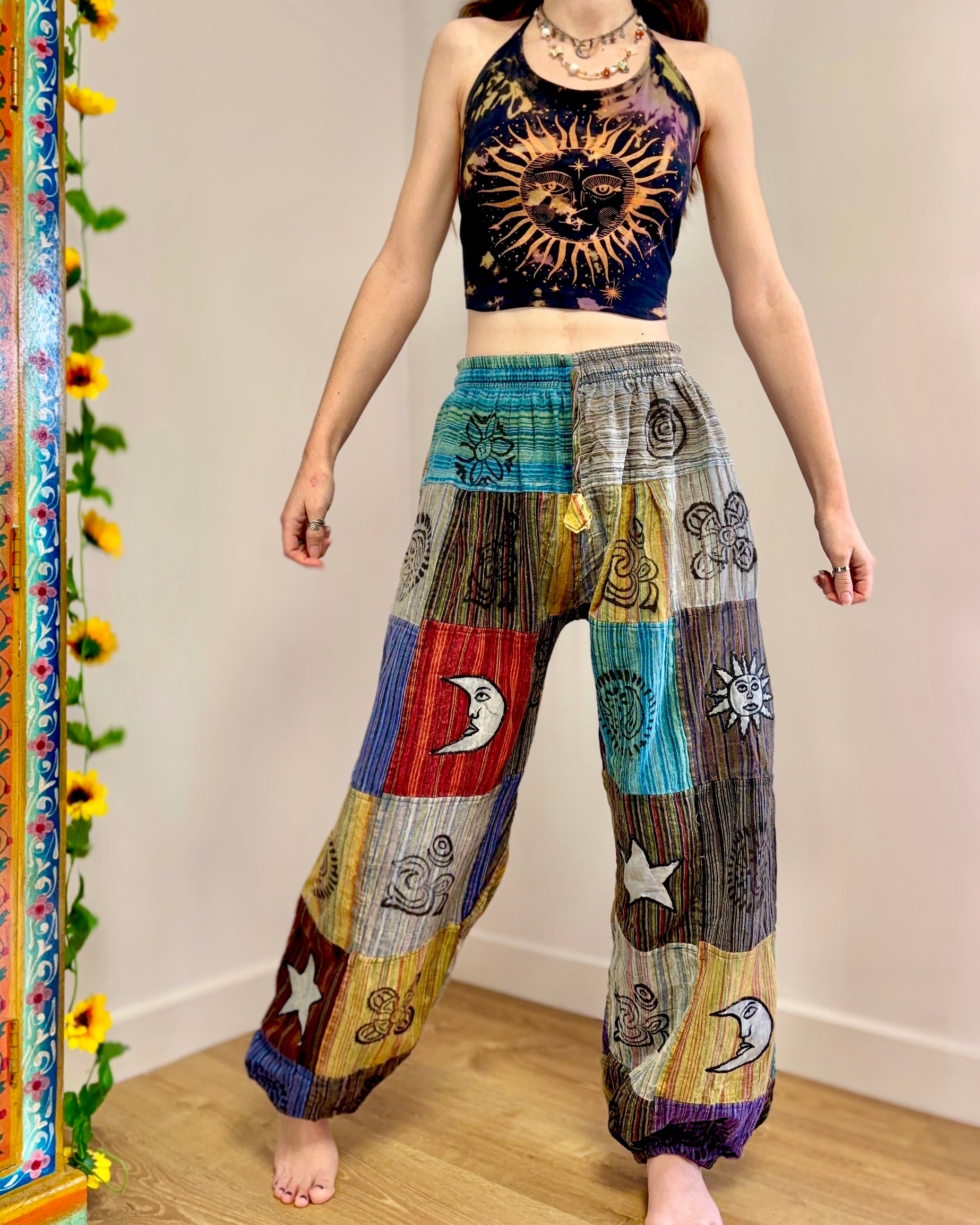 Estos mágicos Harems Celestiales están hechos de tela 100% algodón decorada con soles, lunas y estrellas, y están disponibles en 2 colores. Tienen cintura elástica y 2 bolsillos delanteros.