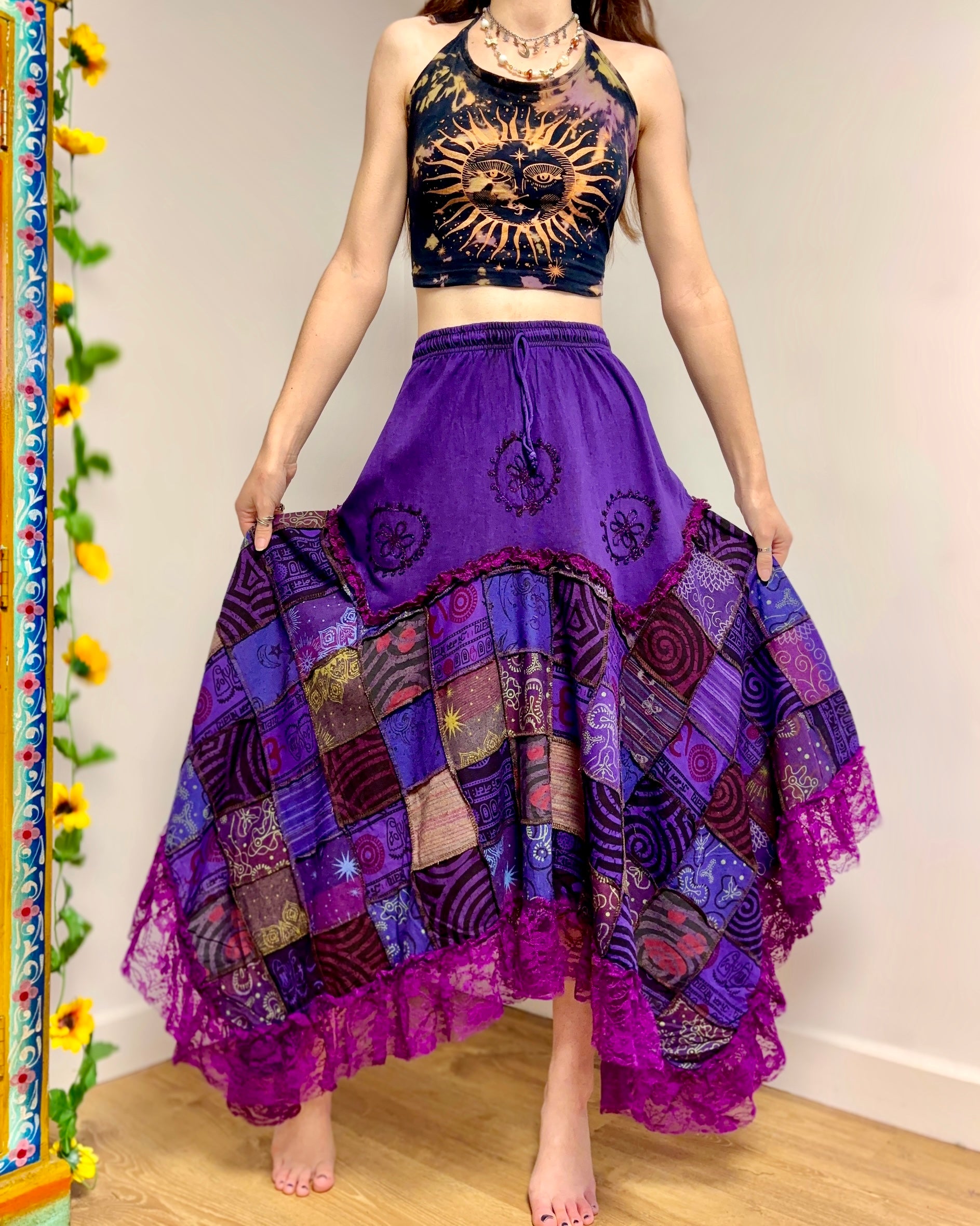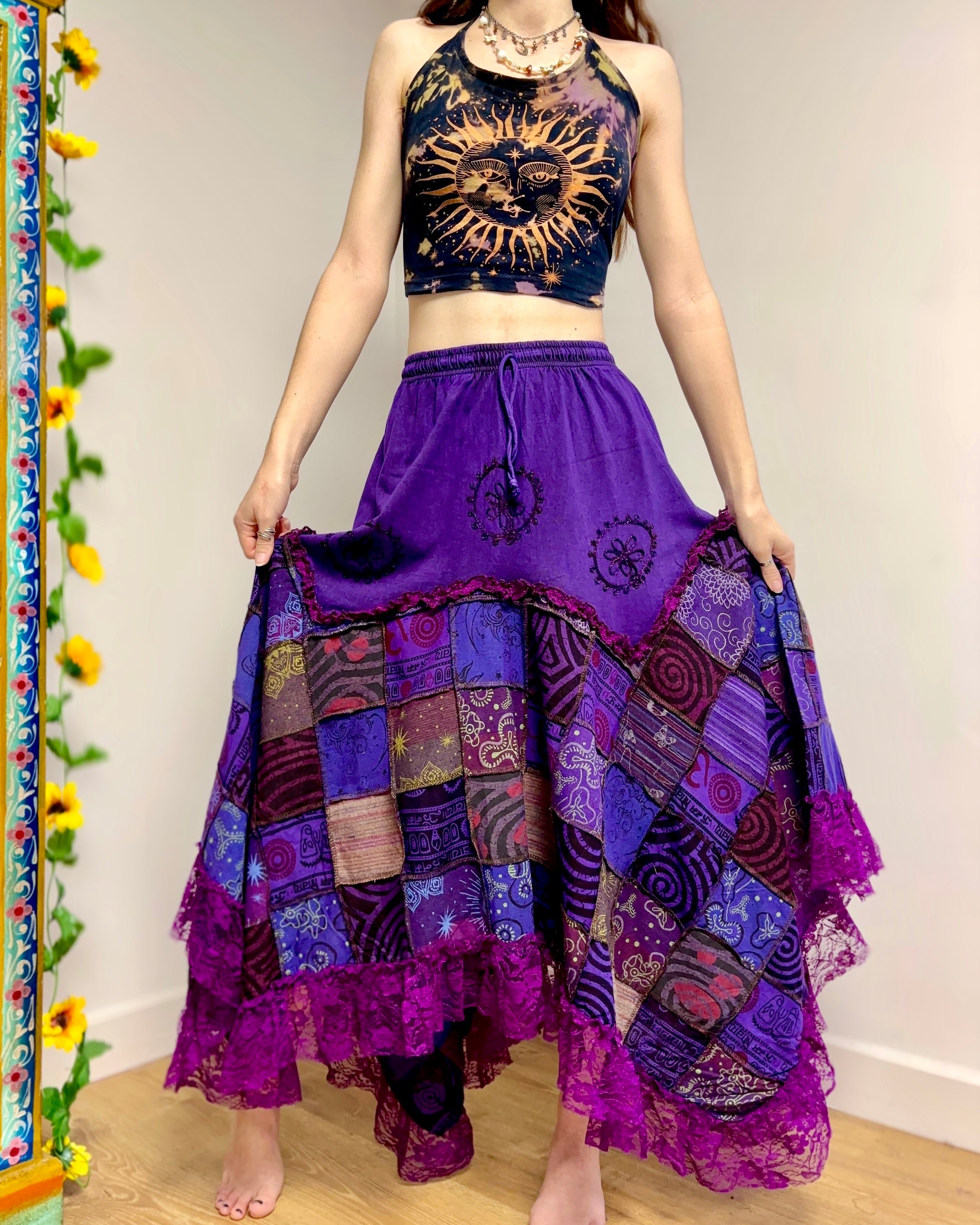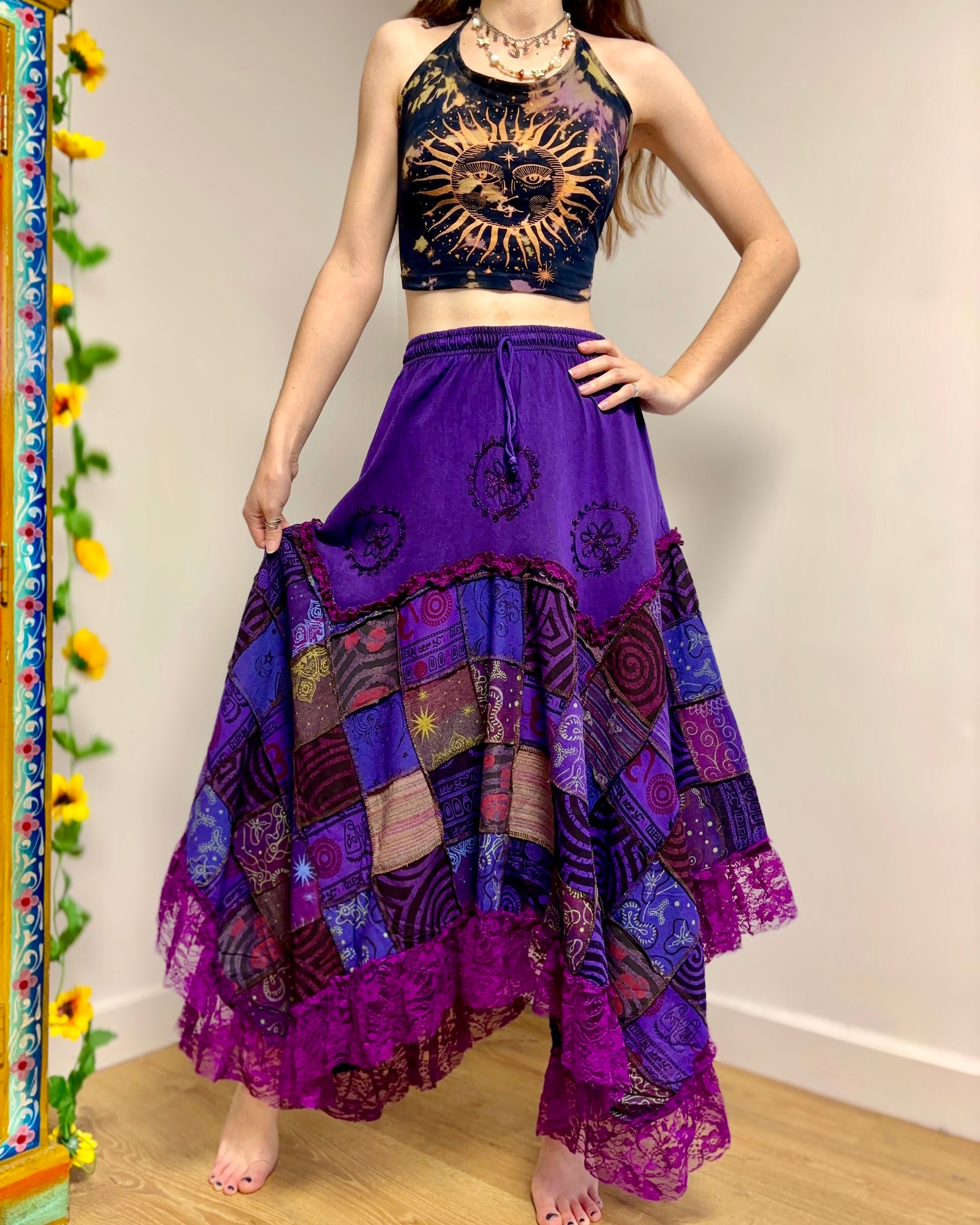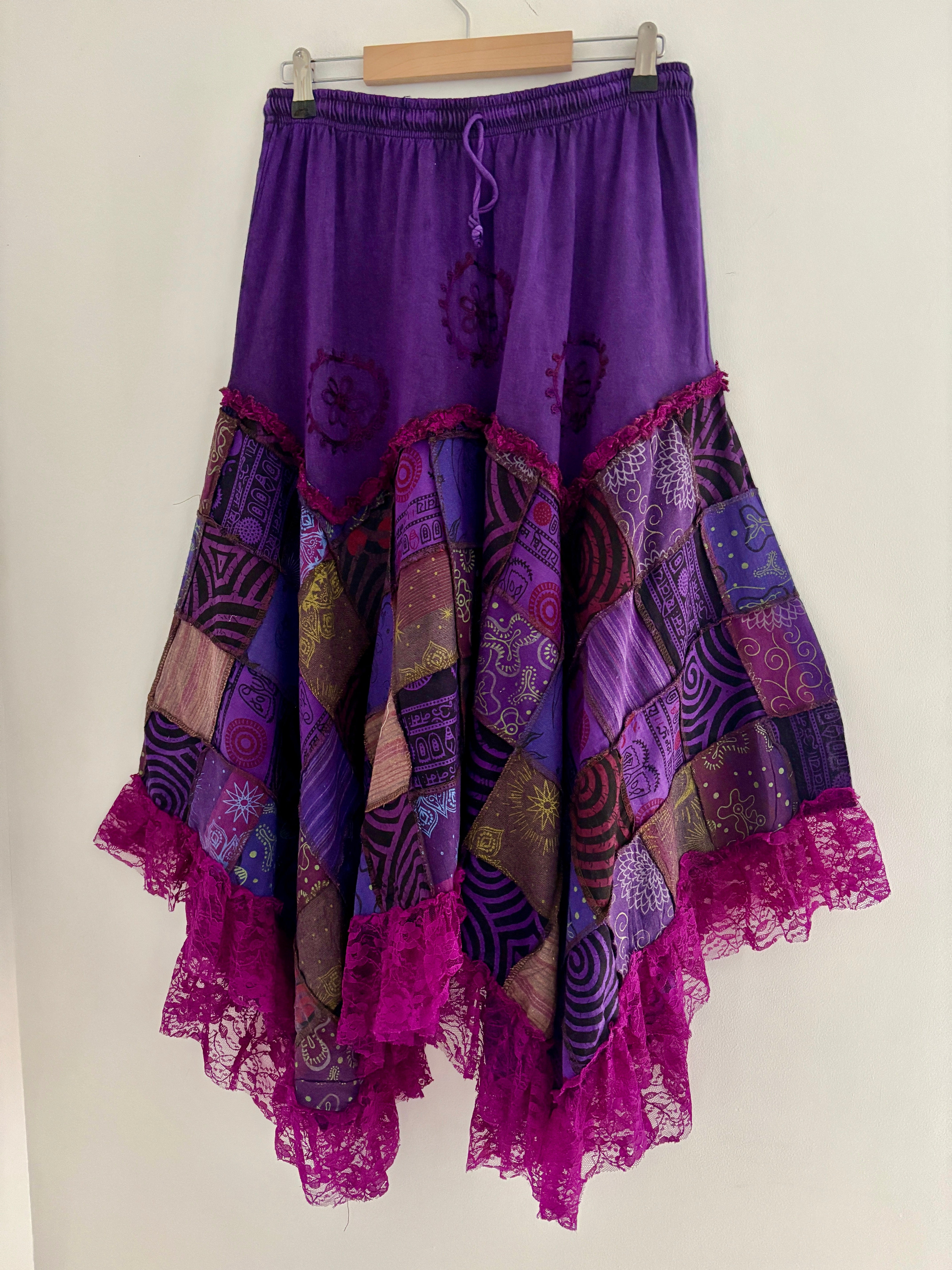 This magical purple skirt features patchwork and lace, with an asymmetric style bottom giving a fairy hippie look.