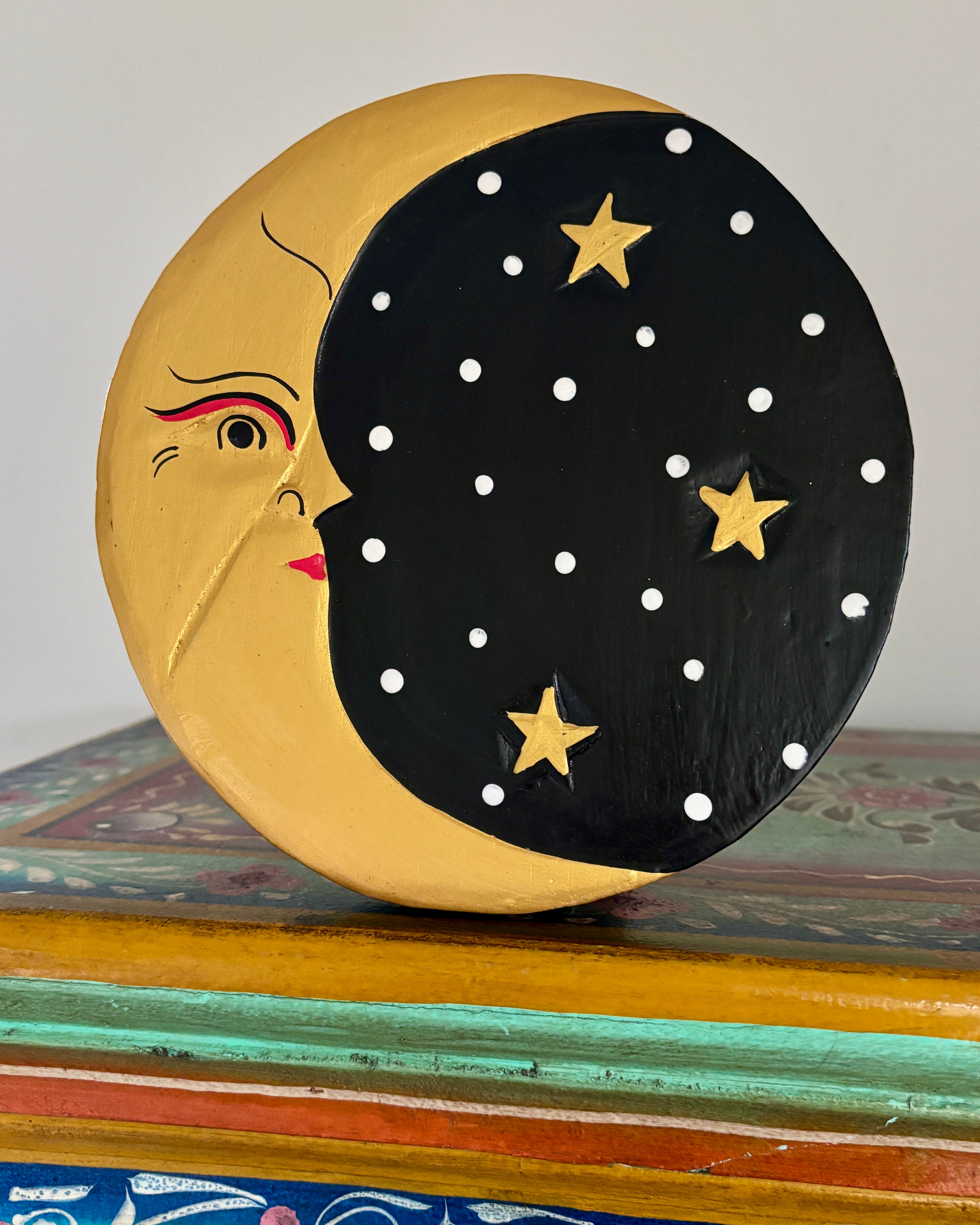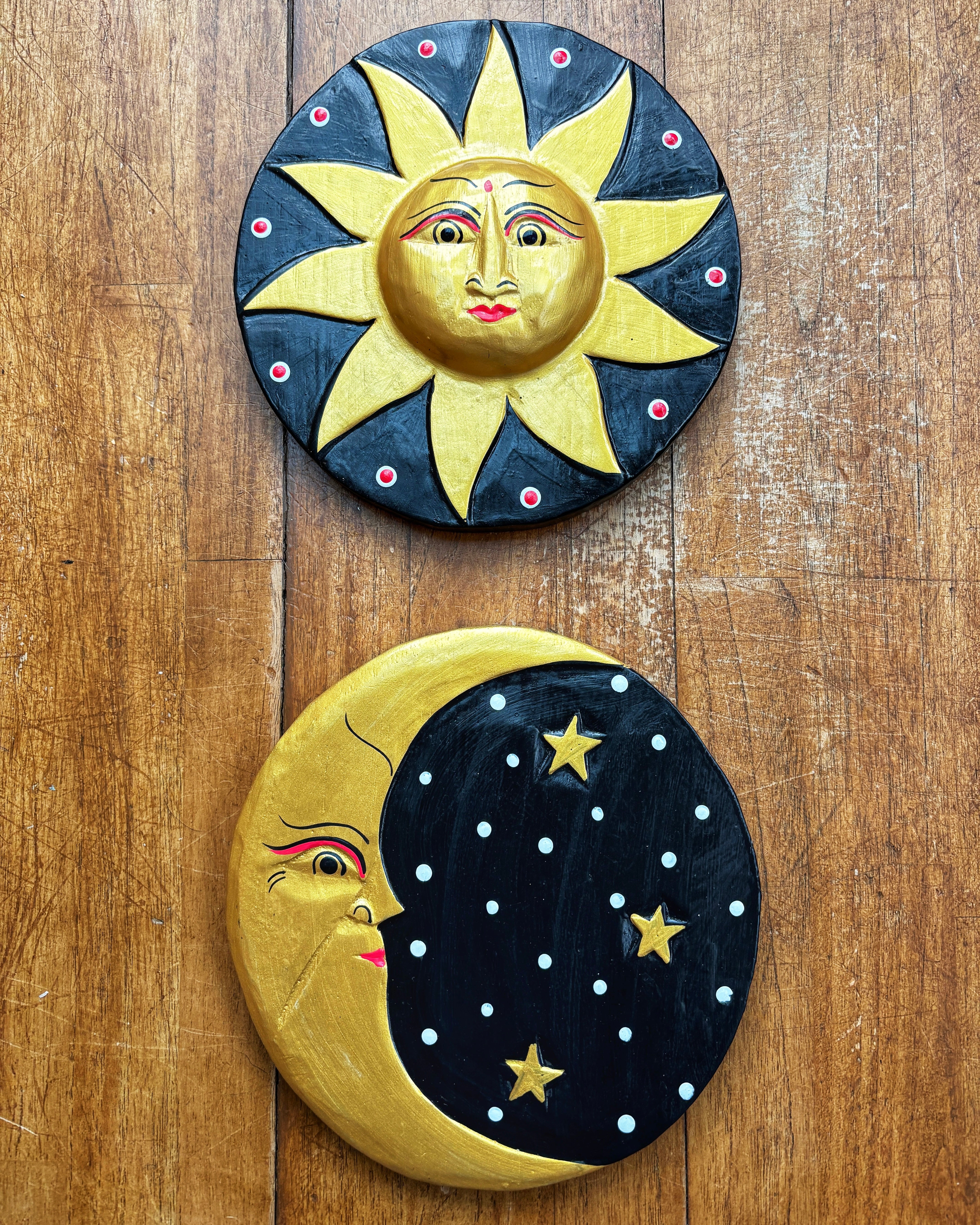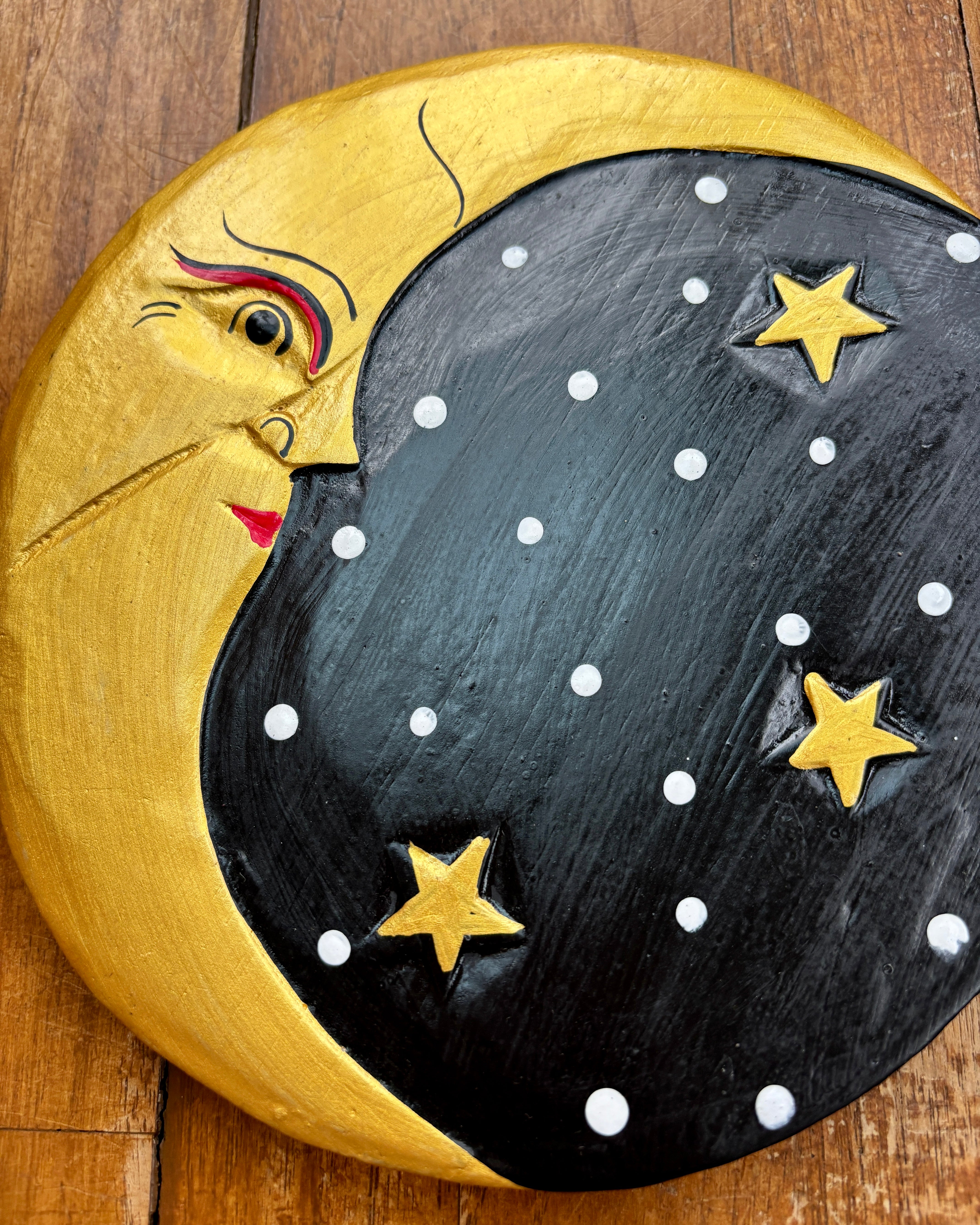 This celestial plaque has a carved moon face that shines in gold paint, with a loop on the back so it's easy to hang on your wall. Balinese artisans carve these plaques from sustainably sourced wood and hand-paint them. Please note: paint style can vary slightly due to their handmade nature.