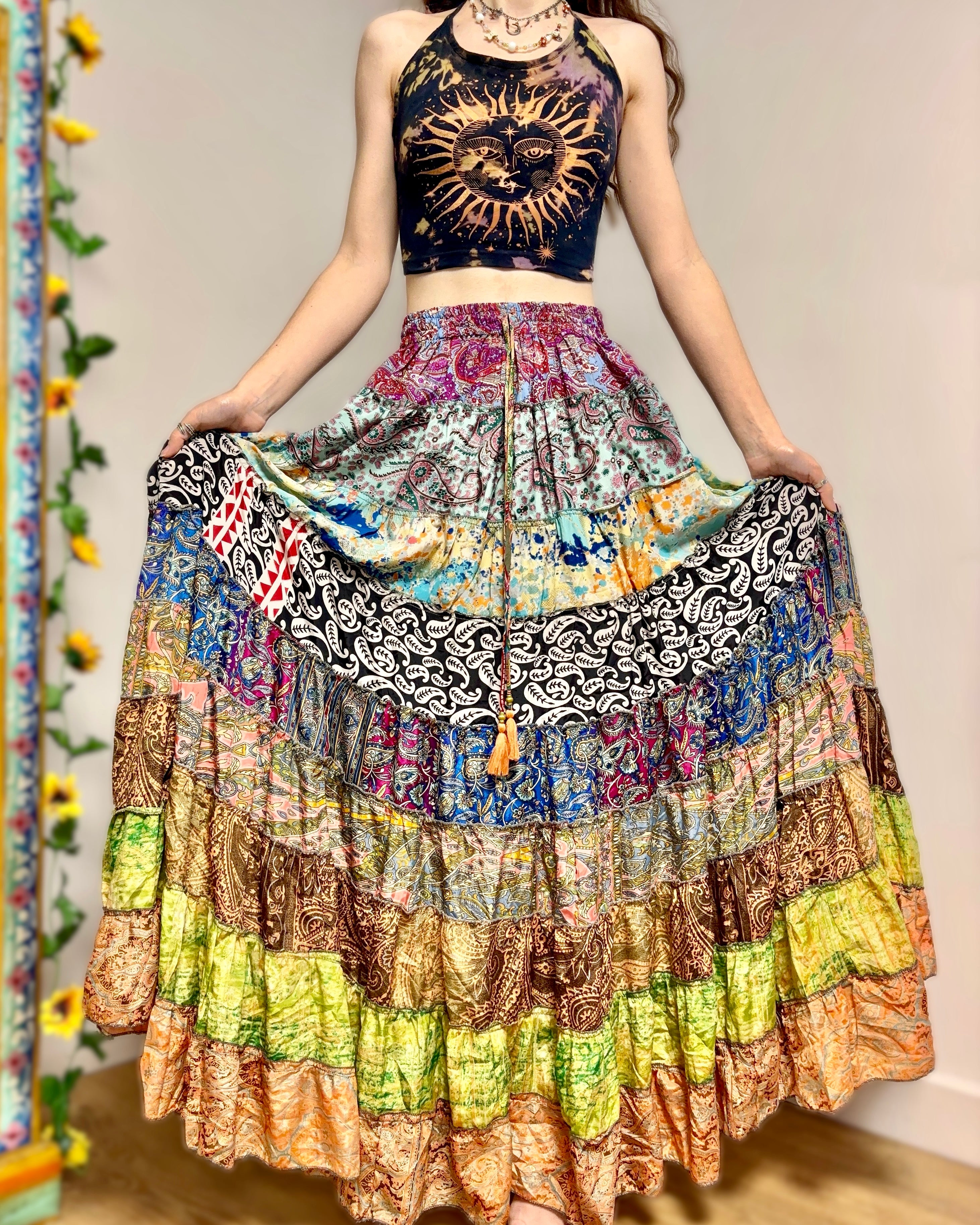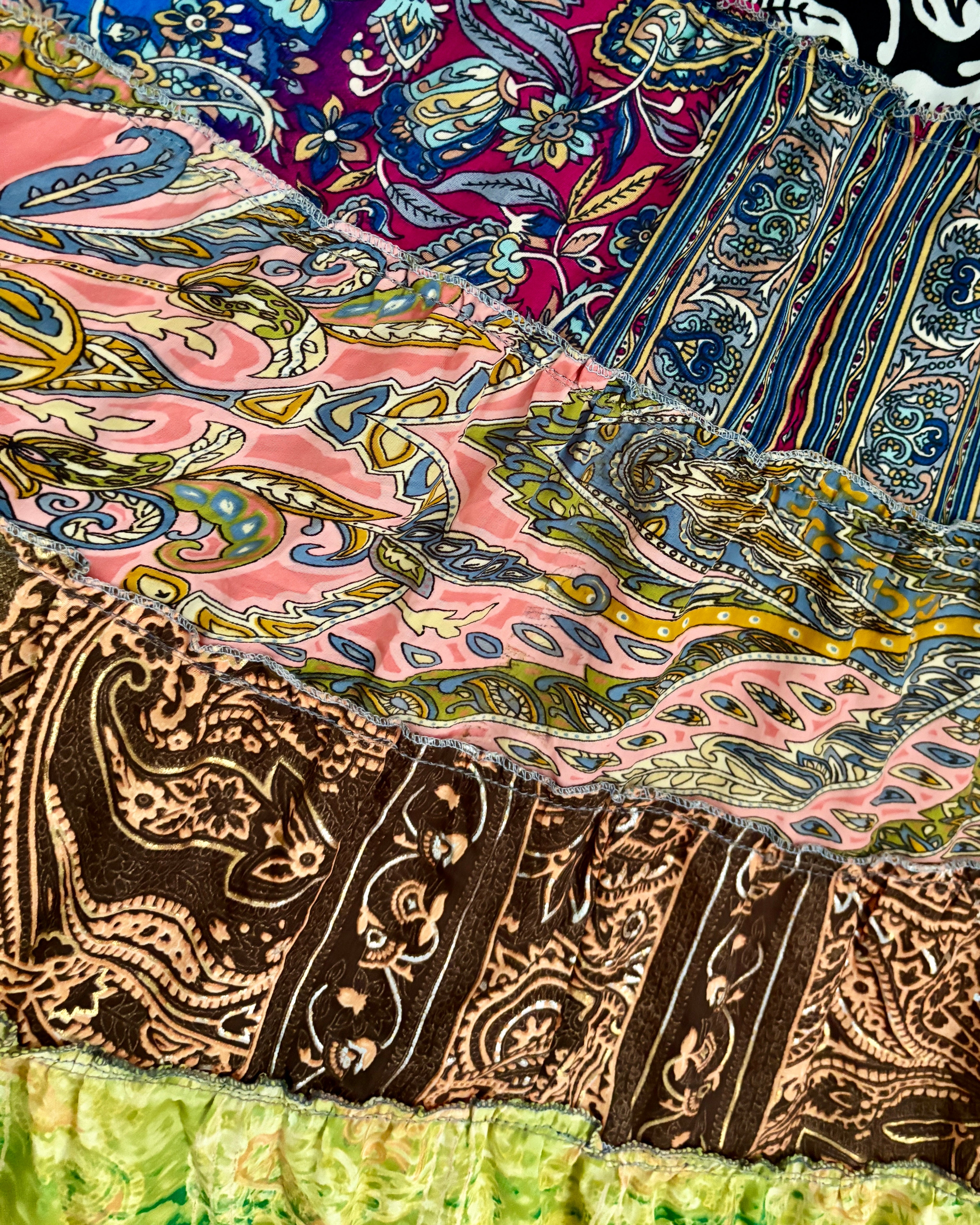 This piece is made from patches of beautiful recycled sari fabric that would otherwise have gone to waste. They are so magical and floaty, perfect for a festival hippie look!